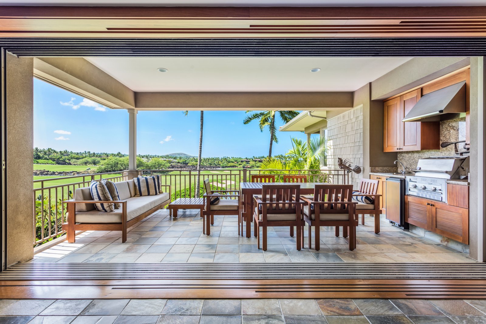 Up to six guests can enjoy 2,642 sq. ft. of luxurious living at this spacious villa. The home includes multiple lounge areas, indoor/outdoor dining - including a large 414 sq. ft. lanai with built-in BBQ, an open-style great room, and spectacular golf-course views for everyone to enjoy.