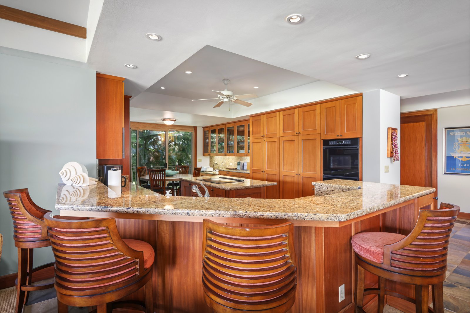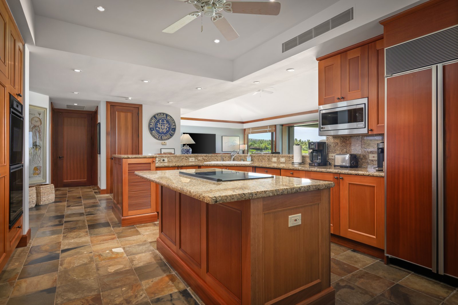 Ceiling Fan • Microwave • Center Island • Coffee Maker • Toaster • Fully Equipped Kitchen Oven, Electric Stove • Refrigerator • Ice Maker • Bar Seating • Breakfast Bar • Indoor/Outdoor Dining Space