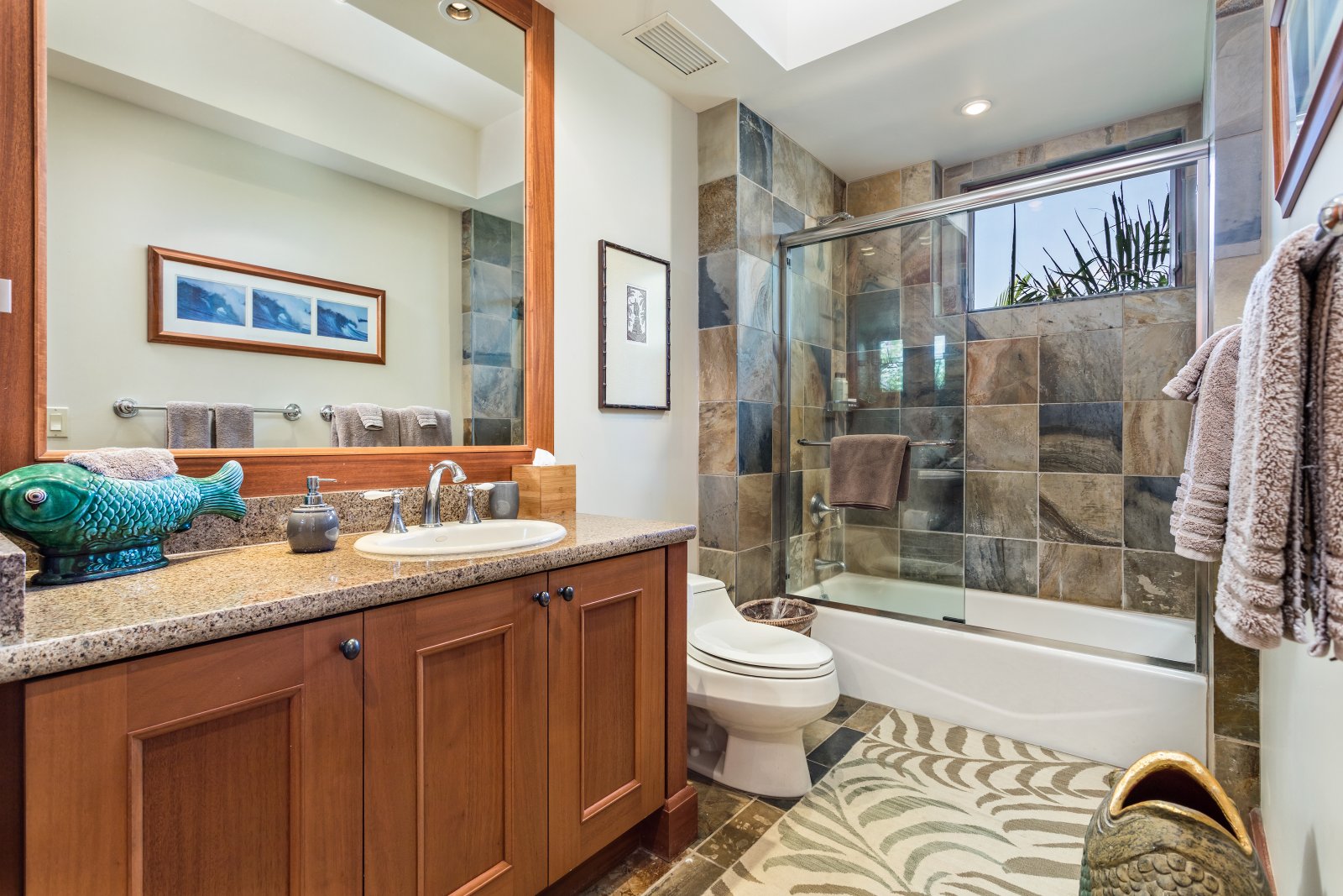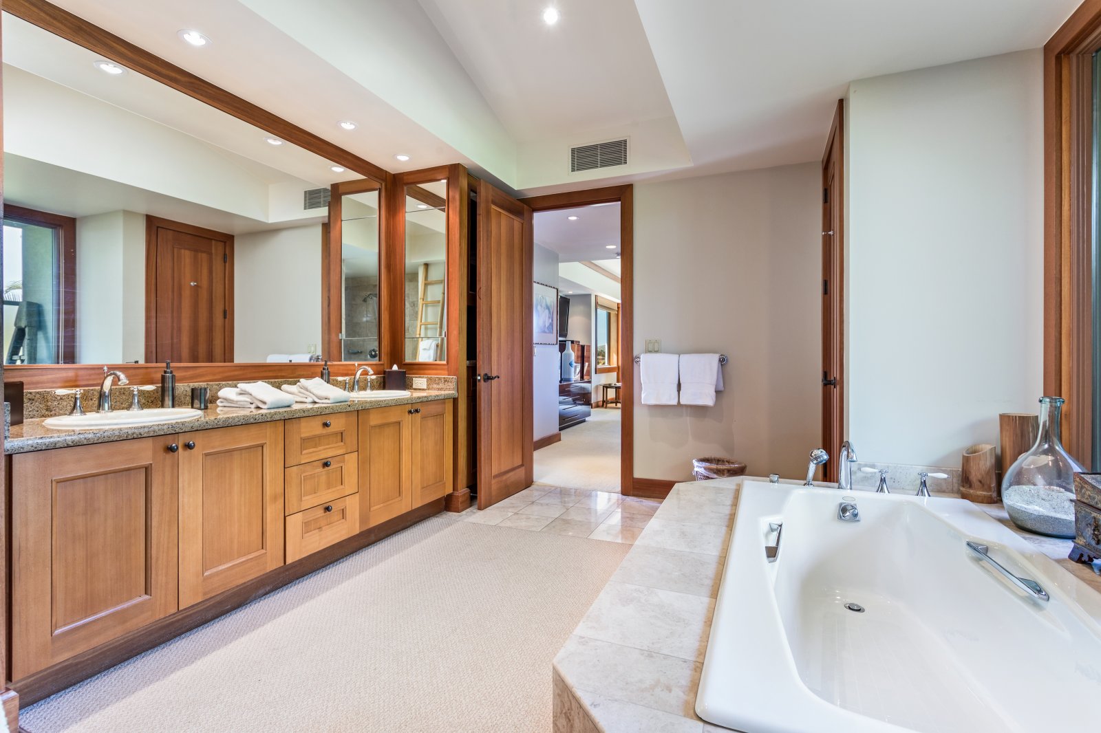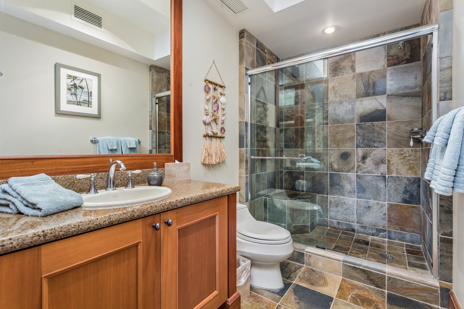 The beautiful master bedroom features a comfortable king-size bed, access to a private balcony and an en-suite bath with a walk-in glass shower, large soaking tub and dual vanity. The first guest bedroom has a queen-size bed, while the second bedroom offers two queen-size beds. Both guest bedrooms offer en-suite baths with combination shower/tub and single vanity. All bedrooms offer a flat-screen TV, ceiling fan and beautiful views!