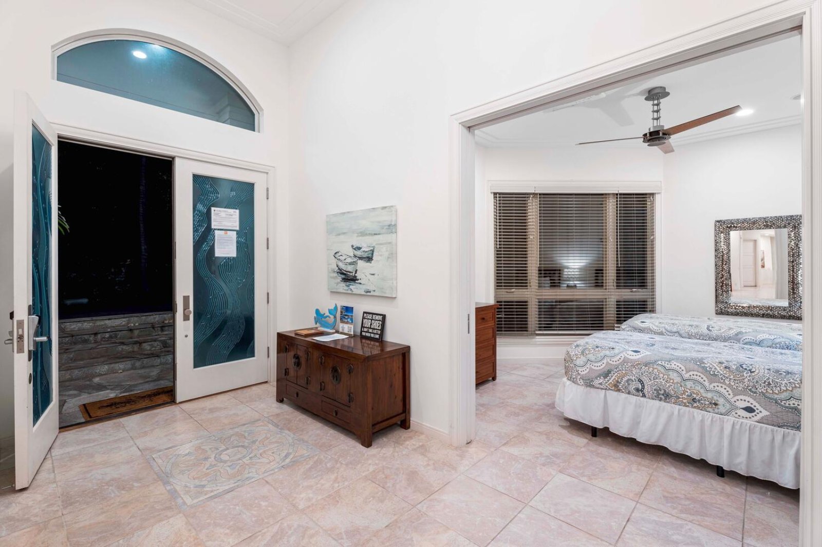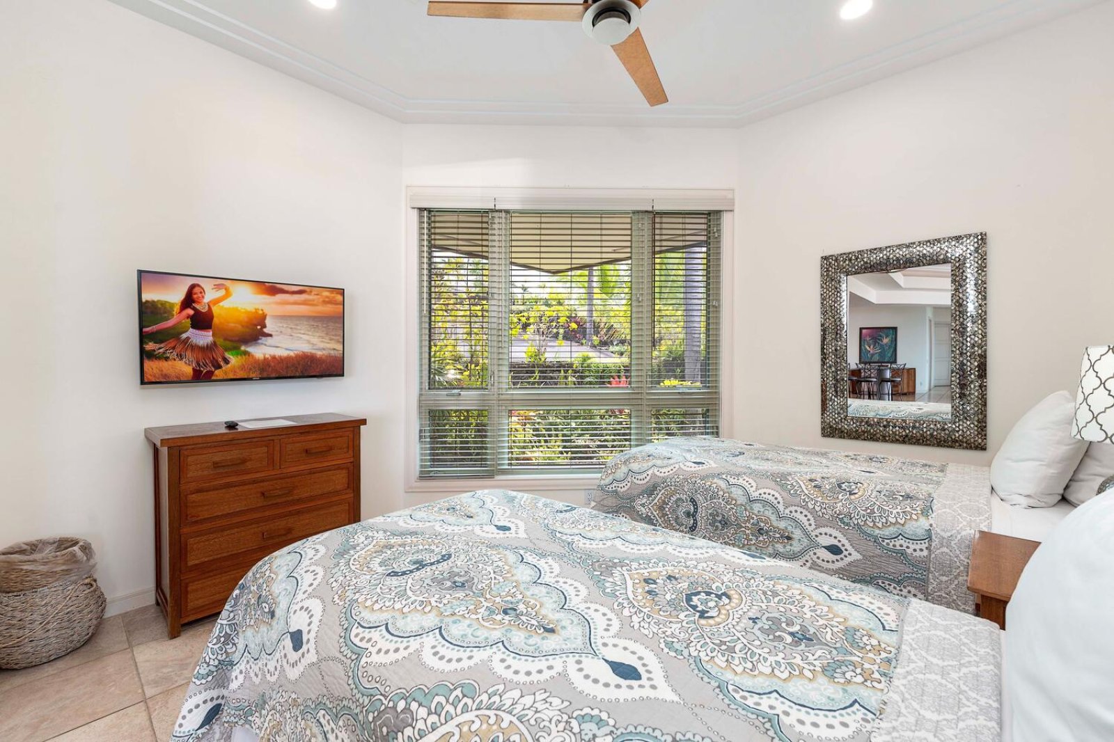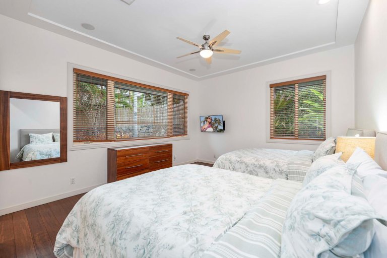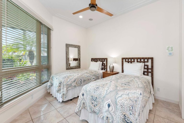 • Guest Bedroom Three: Two queen beds, A/C, ceiling fan, ocean and pool views, and ensuite bathroom.