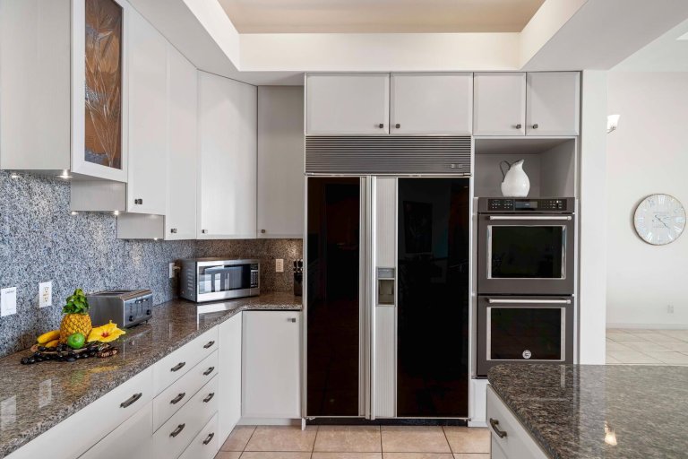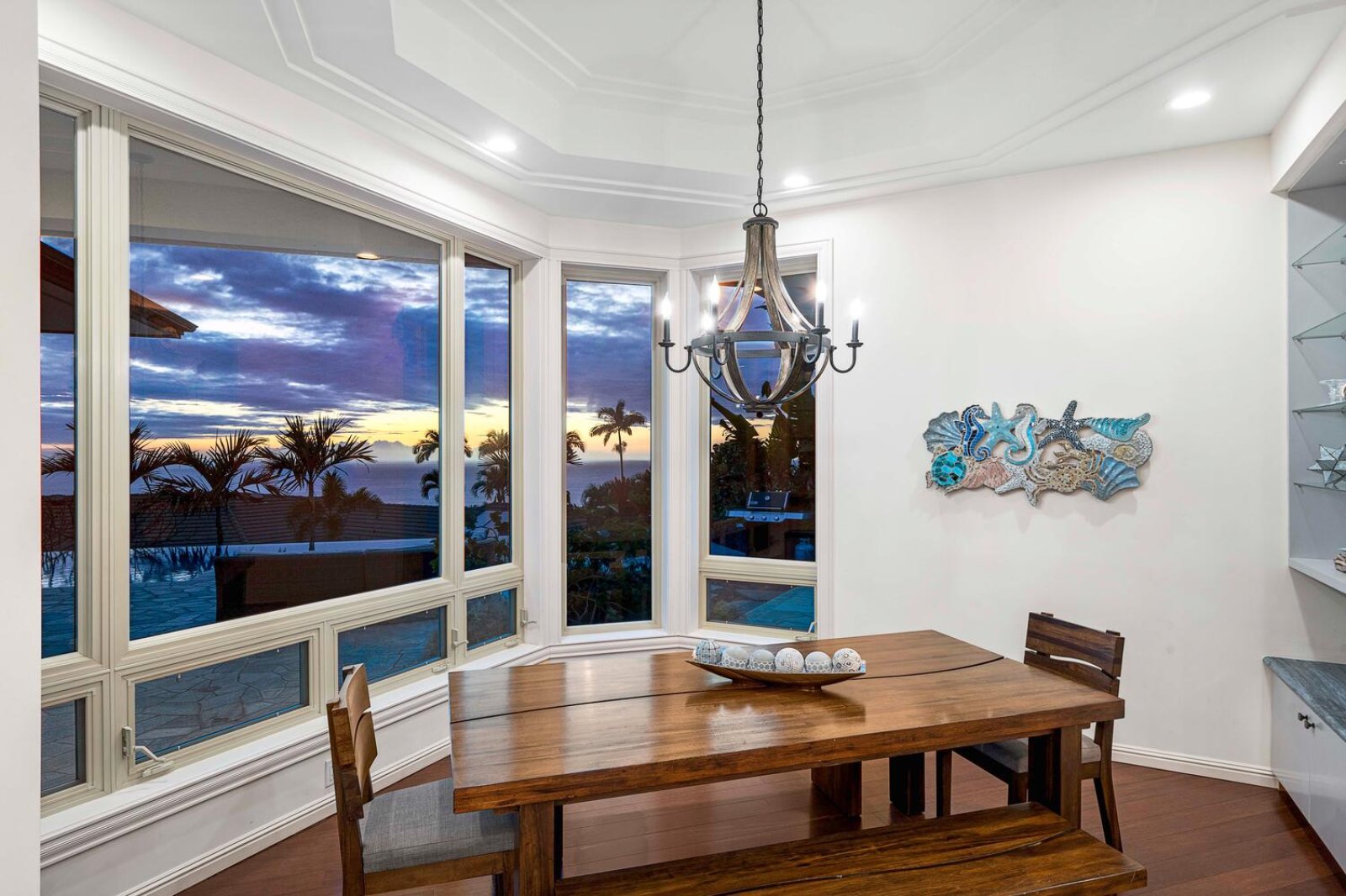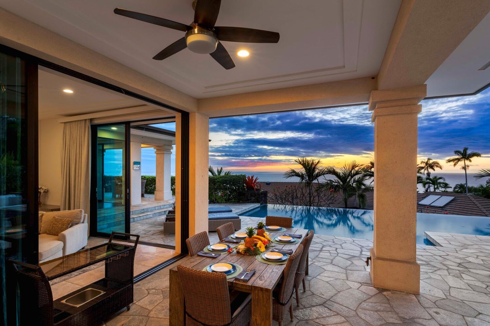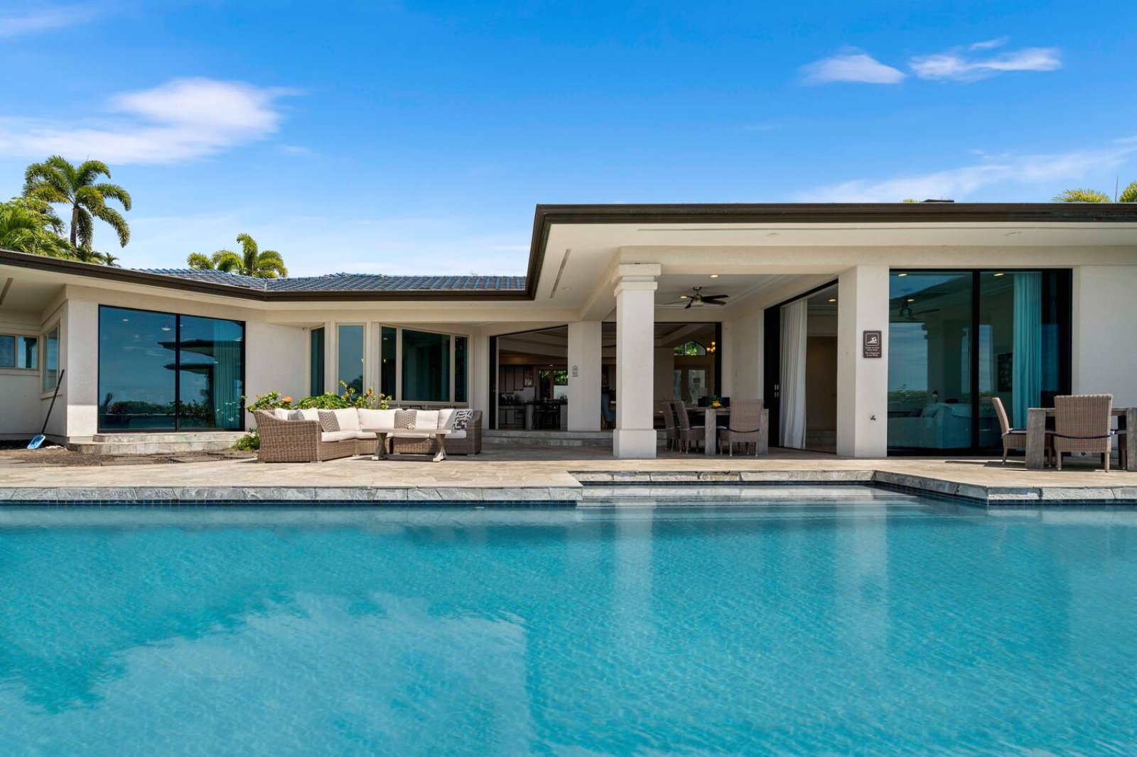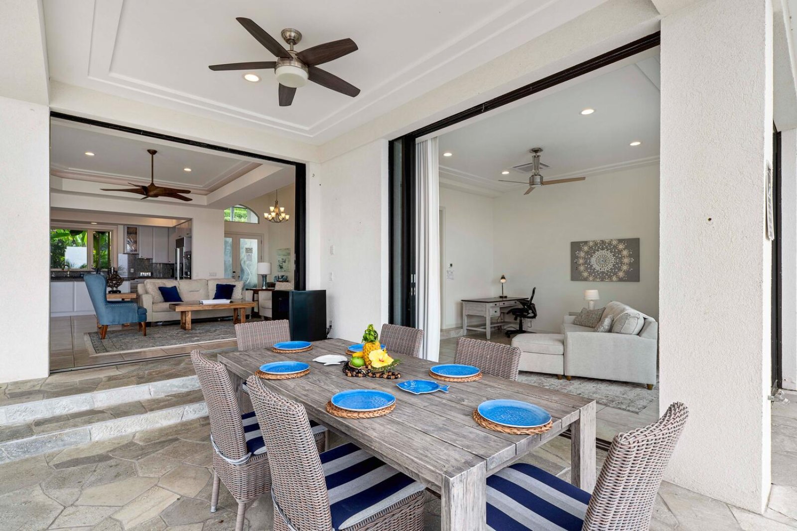 The open-concept great room welcomes guests with generous seating, cooling ocean breezes, and expansive sliding glass panels that open directly to the lanai. The living area is perfect for movie nights on the smart TV or relaxed afternoons enjoying the view.An indoor dining space offers ocean-view seating, while the kitchen bar provides seating for eight—allowing conversation to flow easily from meal prep to shared moments in the living area.