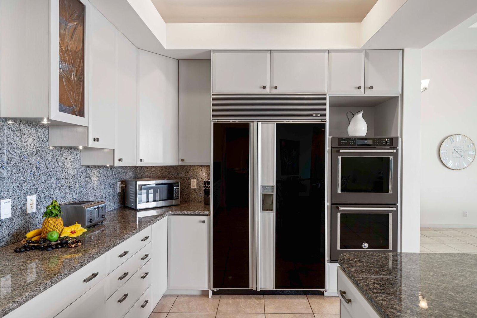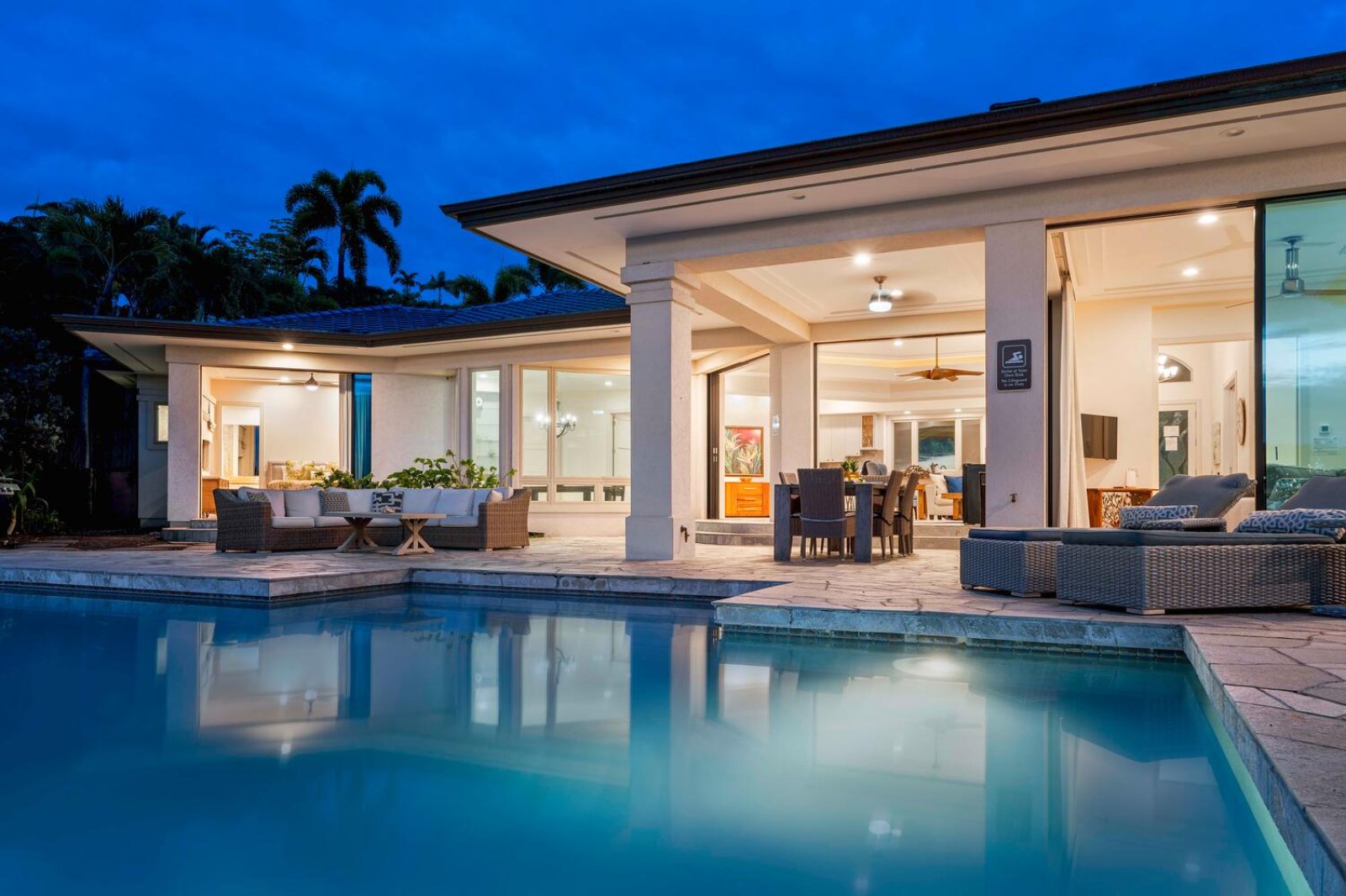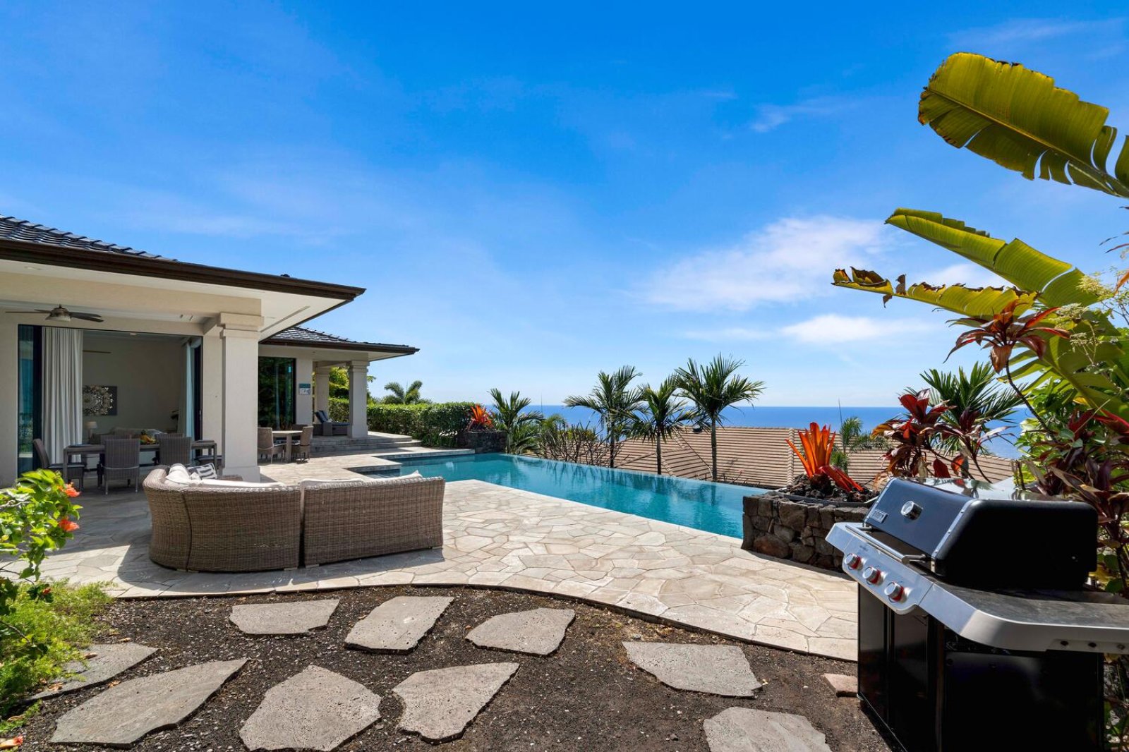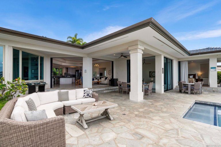 The chef-ready kitchen is fully stocked and designed for group entertaining. Features include a gas cooktop, double oven, dishwasher, and a full complement of cookware and small appliances. Open to the main living space, the kitchen allows hosts to stay connected while preparing fresh island meals.Resort-Style Outdoor Living