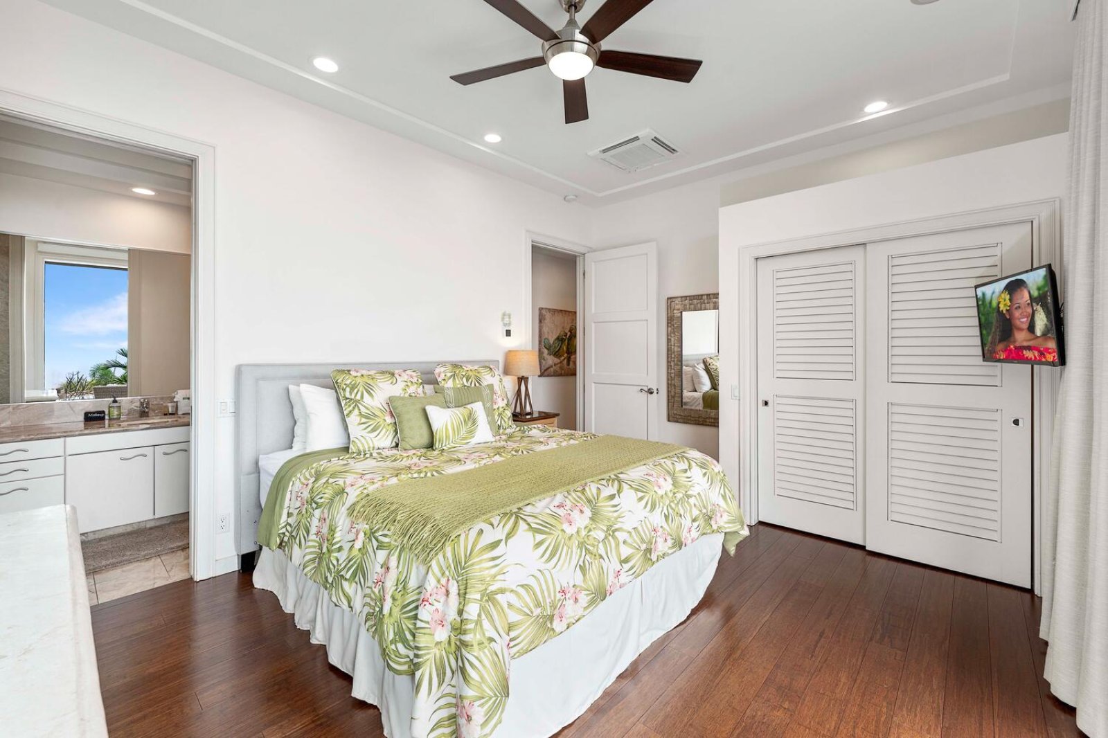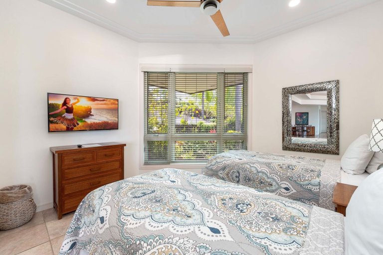 • Guest Bedroom Two: King bed, A/C, ceiling fan, ocean and pool views, lanai access, and ensuite bathroom.