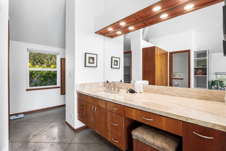 • Guest Suite - Queen bed with air conditioning, ceiling fan, lanai access, and en-suite bathroom with walk-in shower. This suite is detached from the main house via a covered stairway, offering enhanced privacy.