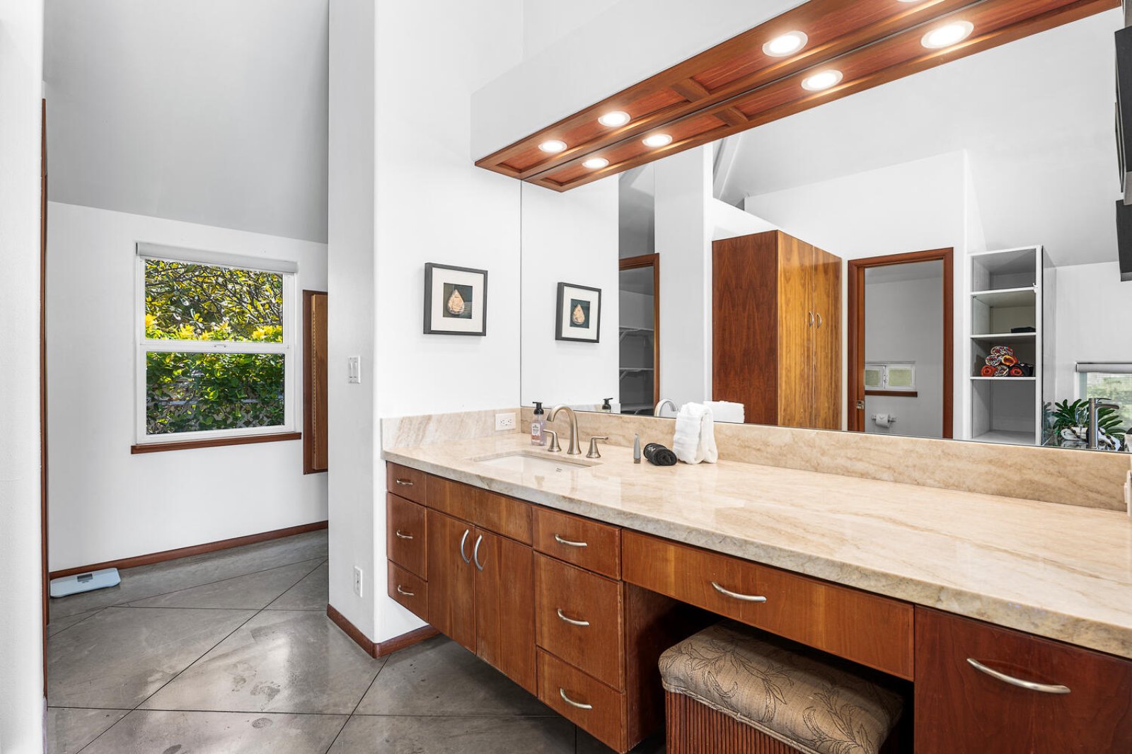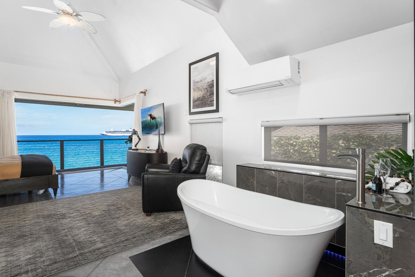 Hale Kope Kai offers versatile sleeping arrangements designed to suit couples, families, or remote professionals.• Primary Suite - King bed, vaulted ceilings, air conditioning, ceiling fan, and direct lanai access. The en-suite bathroom features a soaking tub, walk-in shower, and sweeping ocean views.