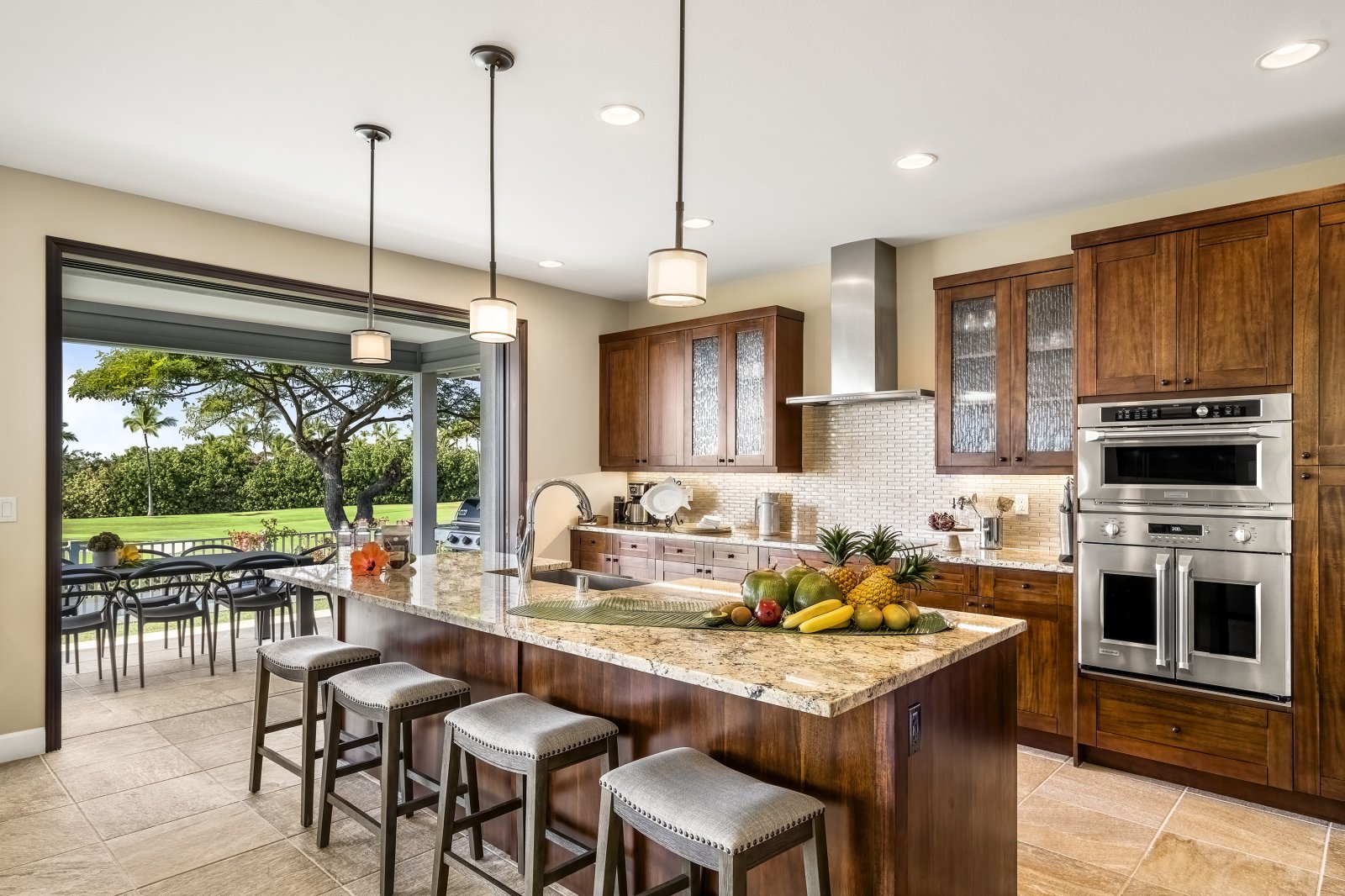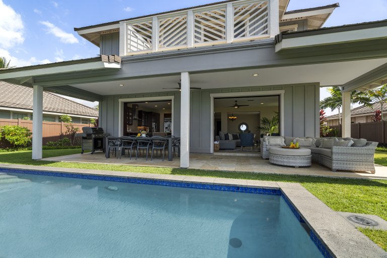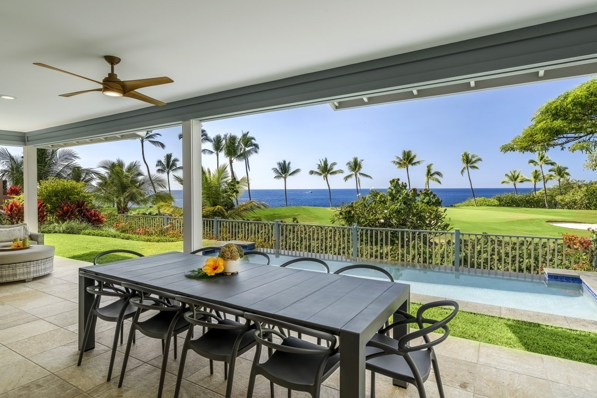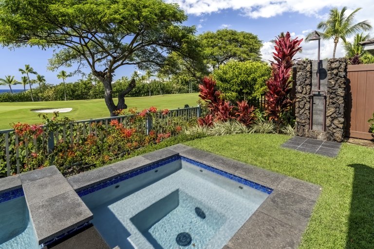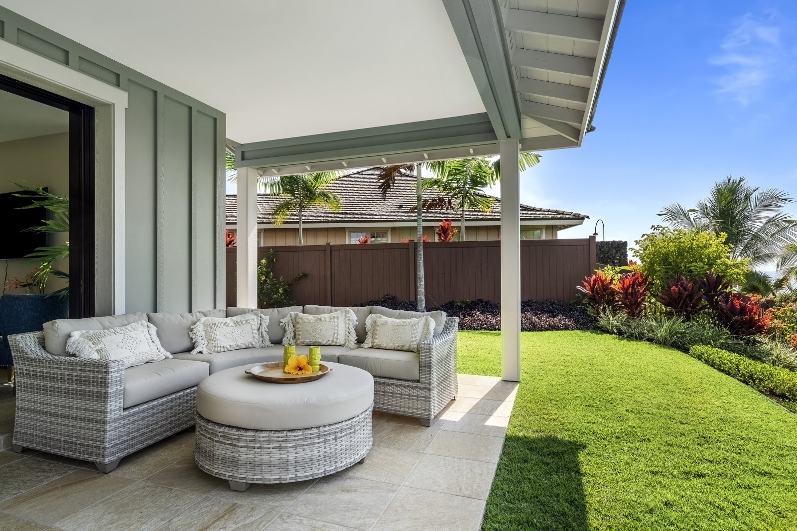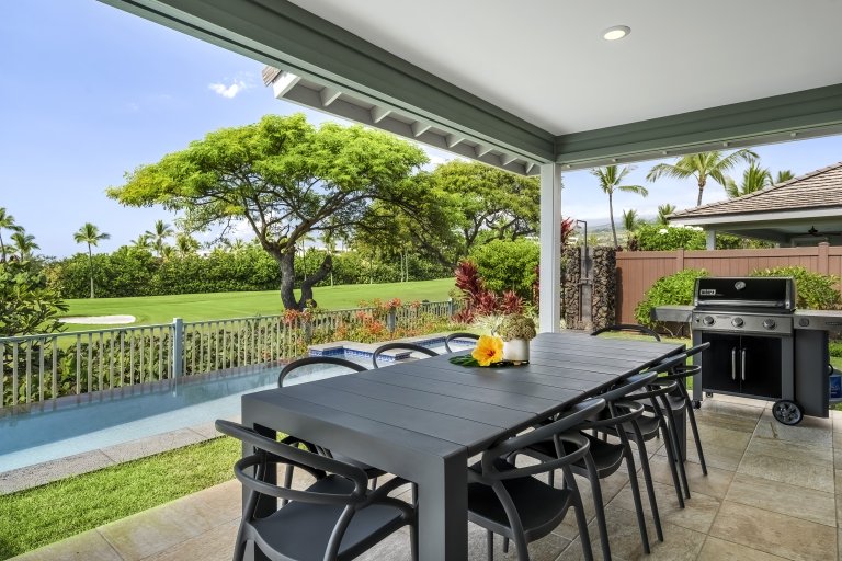 Outdoor living is at the heart of Holua Kai #26. The covered lanai opens to a private backyard anchored by an infinity-edge pool and spa, positioned to take full advantage of the golf course setting and distant ocean views. Multiple seating areas offer both sun and shade, while an outdoor dining table for eight and a built-in grill make alfresco meals effortless.From morning coffee overlooking the fairways to sunset dinners by the pool, the outdoor spaces are designed for enjoyment throughout the day.