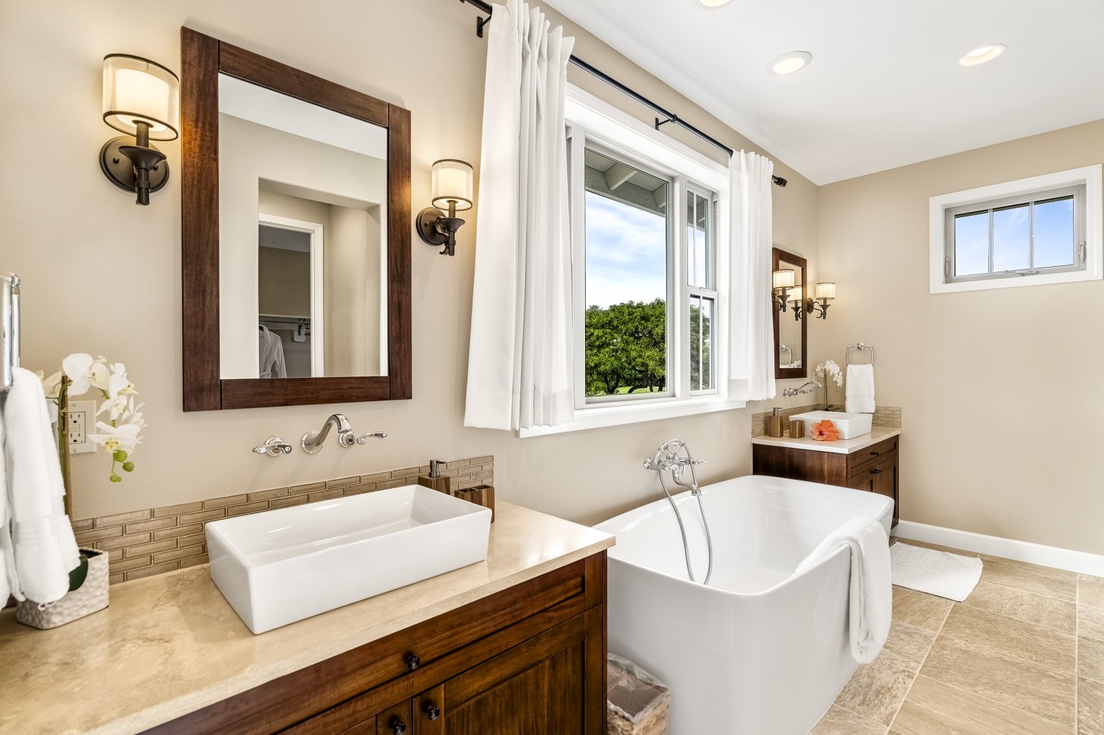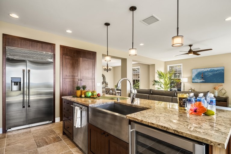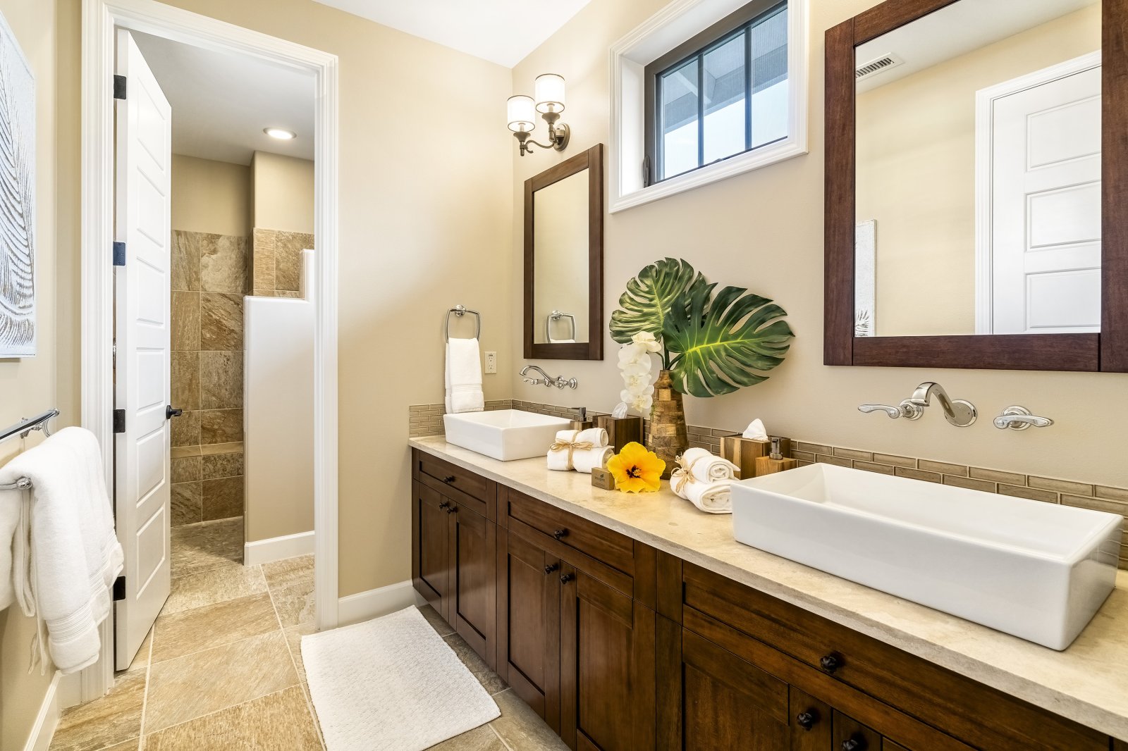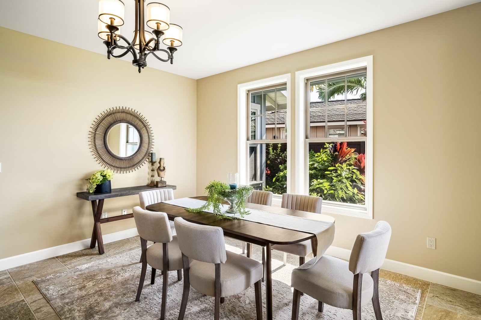 Outdoor living is at the heart of Holua Kai #26. The covered lanai opens to a private backyard anchored by an infinity-edge pool and spa, positioned to take full advantage of the golf course setting and distant ocean views. Multiple seating areas offer both sun and shade, while an outdoor dining table for eight and a built-in grill make alfresco meals effortless.From morning coffee overlooking the fairways to sunset dinners by the pool, the outdoor spaces are designed for enjoyment throughout the day.