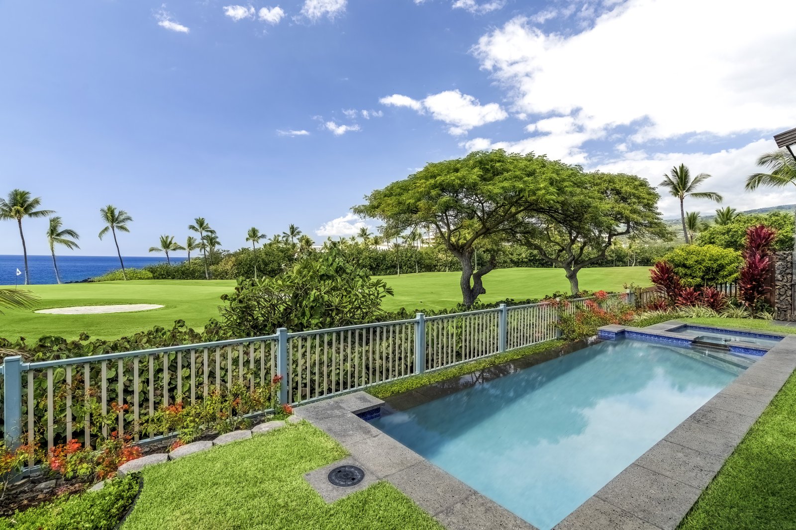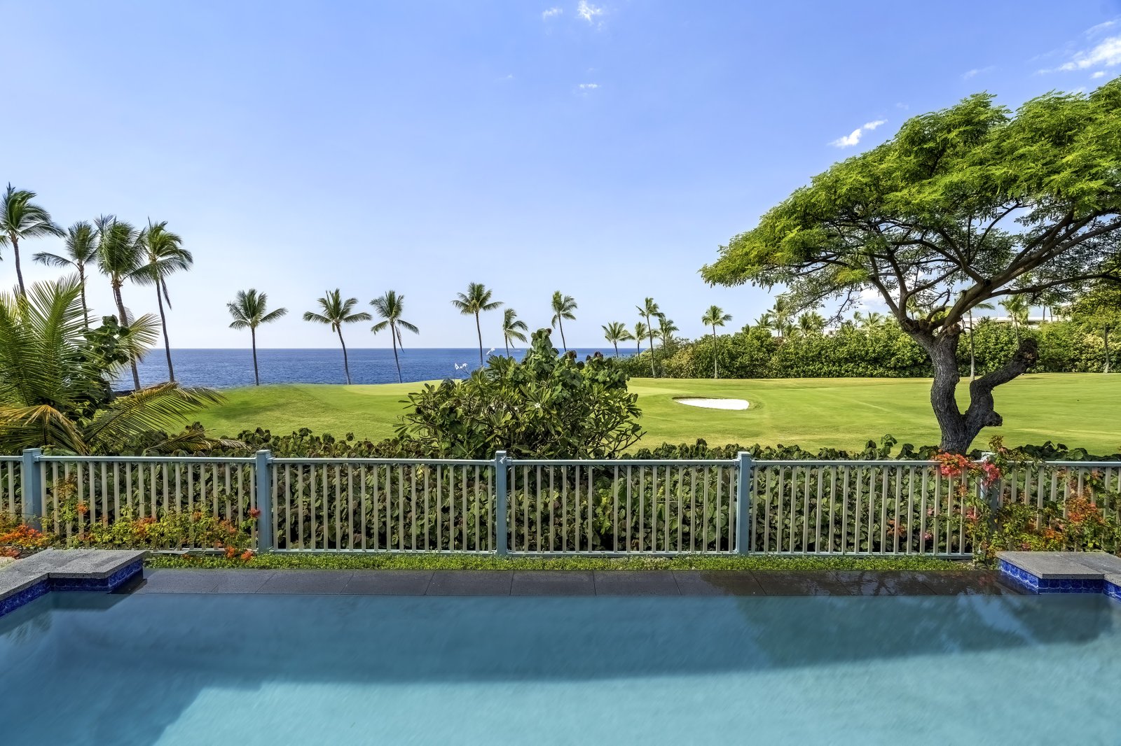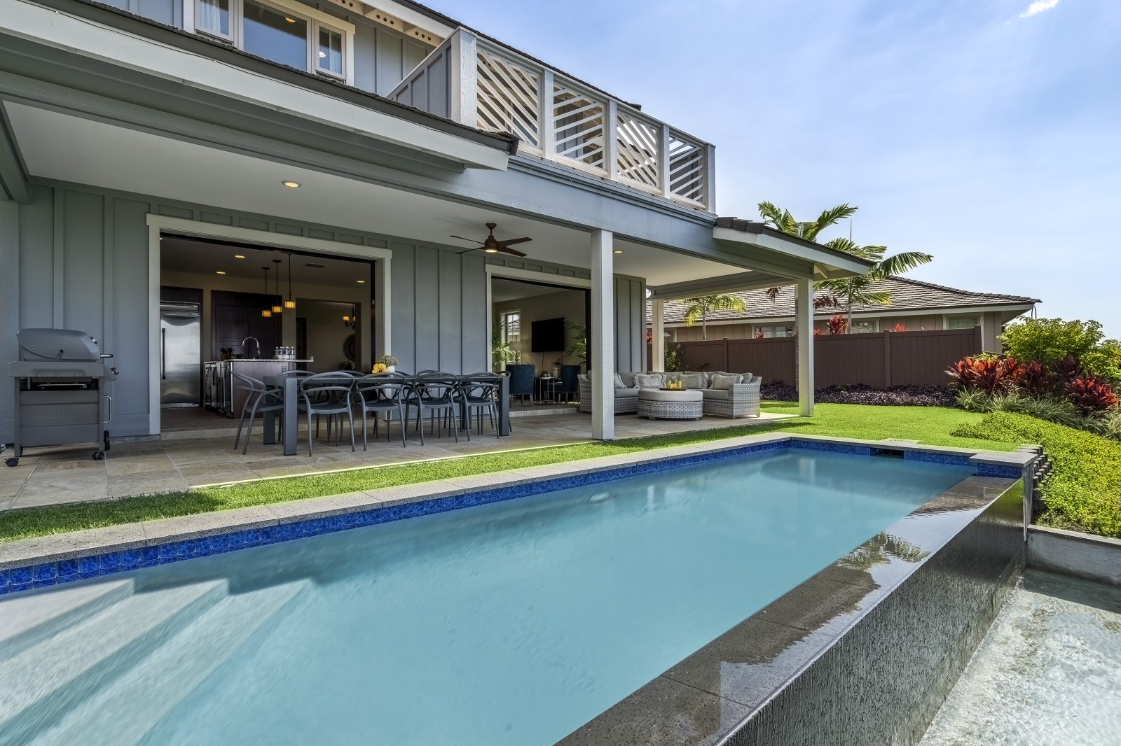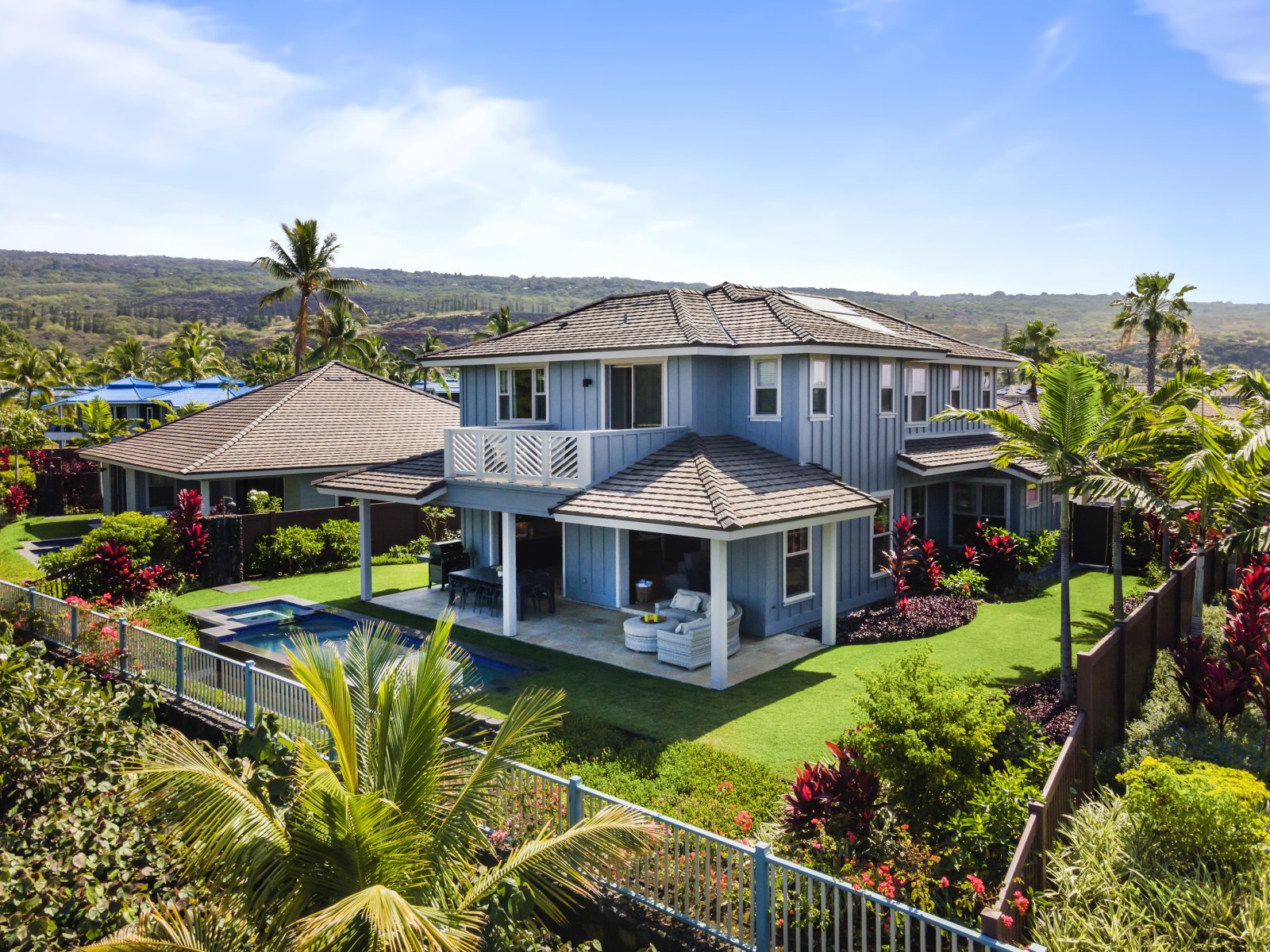 Welcome to Holua Kai #26, a refined plantation-style residence set within the gated enclave of Holua Kai at Keauhou. Overlooking the second green of the Kona Country Club Makai Golf Course, this two-story, 2,685-square-foot home offers a seamless blend of classic island architecture, modern comfort, and relaxed outdoor living. From the expansive covered lanai, enjoy tranquil golf course vistas with soft Pacific glimpses, while a private infinity-edge pool and spa provide a front-row seat to glowing Kona sunsets.Designed as a welcoming retreat for families and groups, Holua Kai #26 balances open gathering spaces with private sanctuaries, all set within one of Keauhou’s most desirable resort communities.