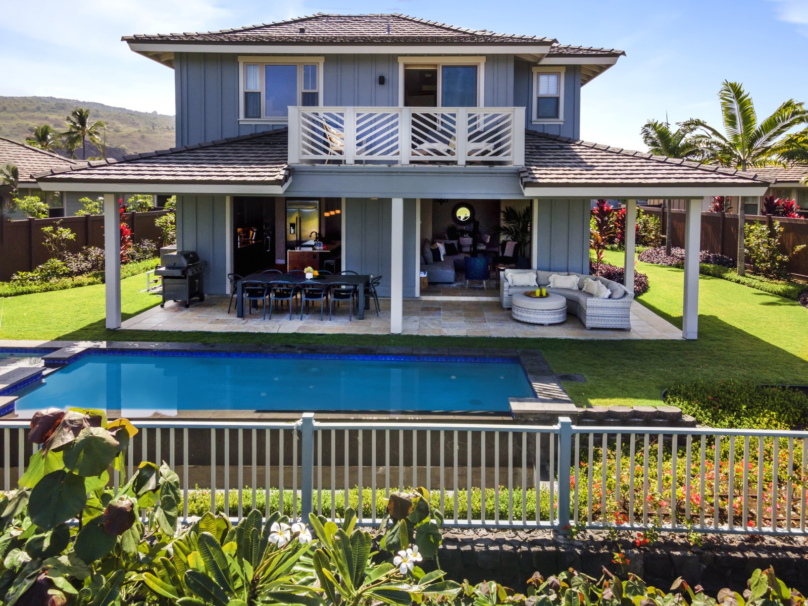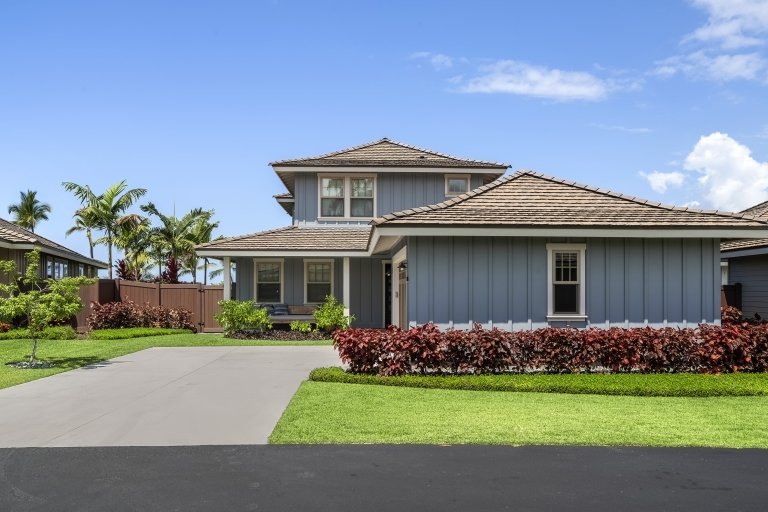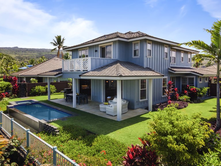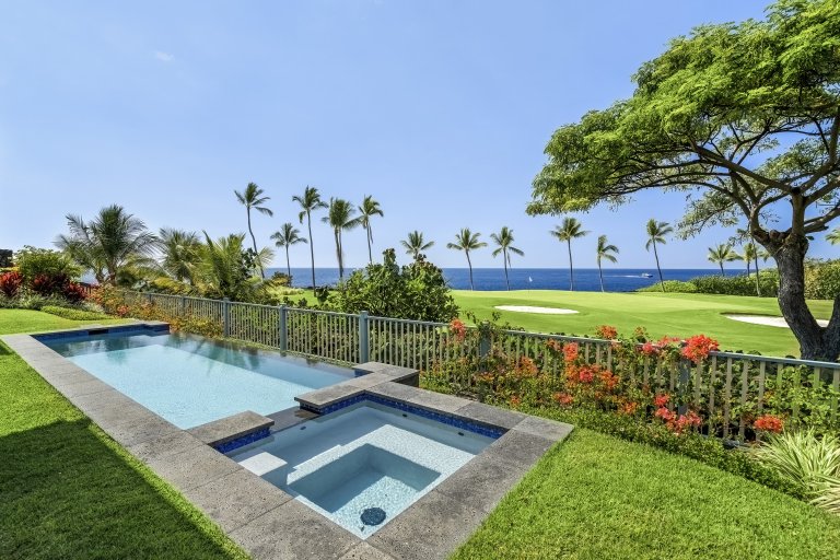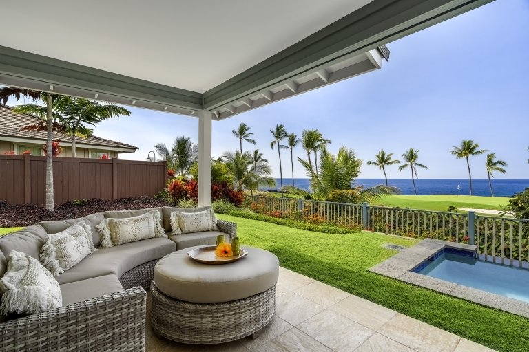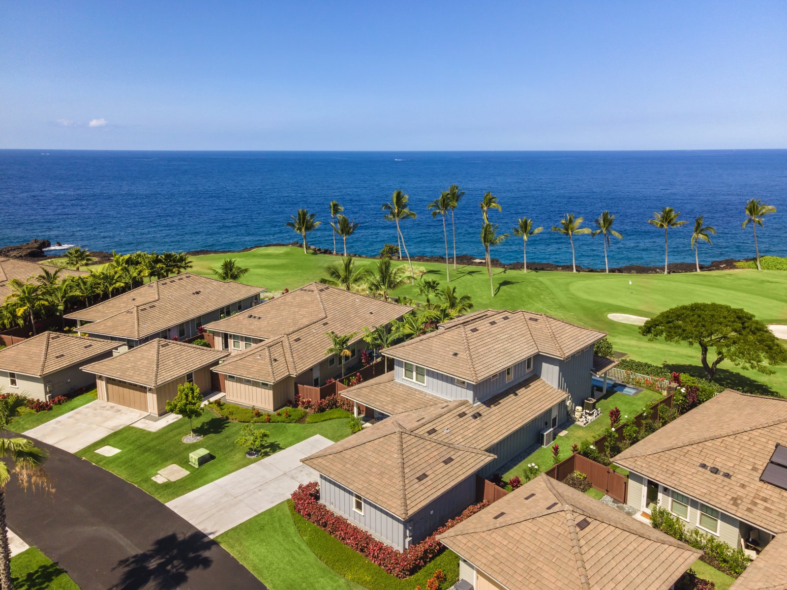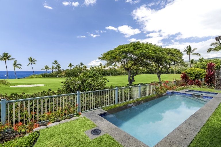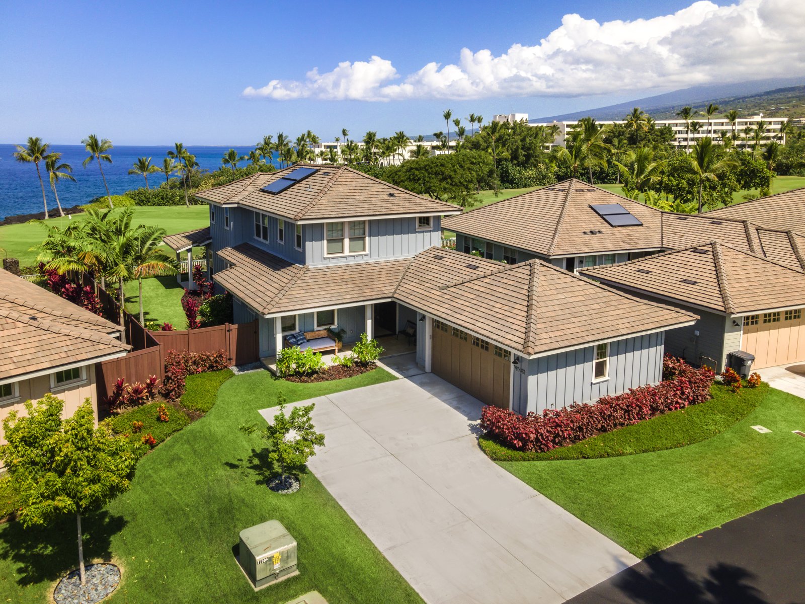 Welcome to Holua Kai #26, a refined plantation-style residence set within the gated enclave of Holua Kai at Keauhou. Overlooking the second green of the Kona Country Club Makai Golf Course, this two-story, 2,685-square-foot home offers a seamless blend of classic island architecture, modern comfort, and relaxed outdoor living. From the expansive covered lanai, enjoy tranquil golf course vistas with soft Pacific glimpses, while a private infinity-edge pool and spa provide a front-row seat to glowing Kona sunsets.Designed as a welcoming retreat for families and groups, Holua Kai #26 balances open gathering spaces with private sanctuaries, all set within one of Keauhou’s most desirable resort communities.