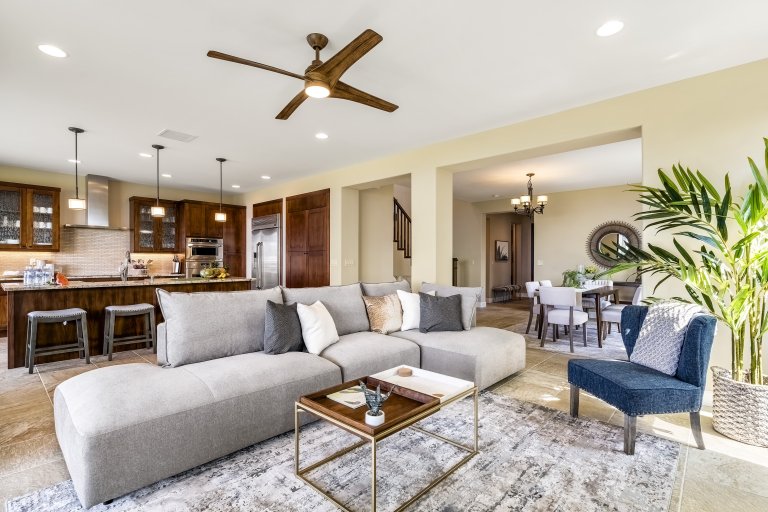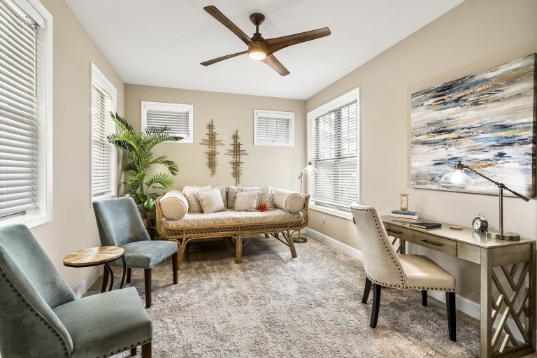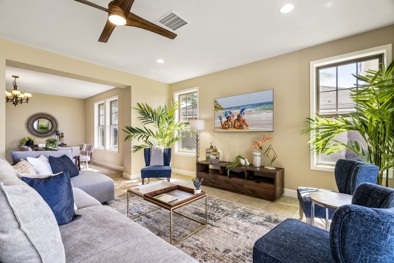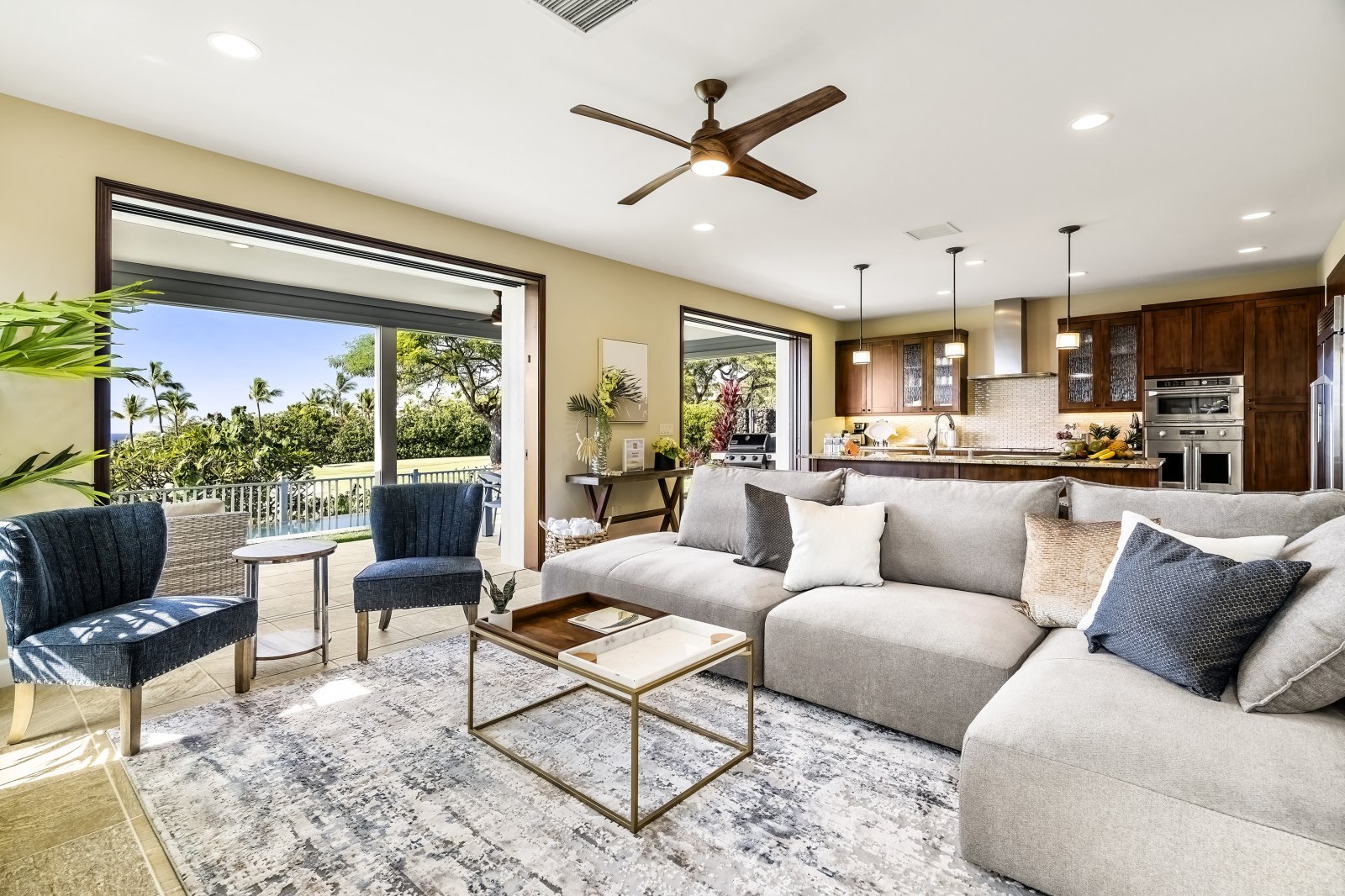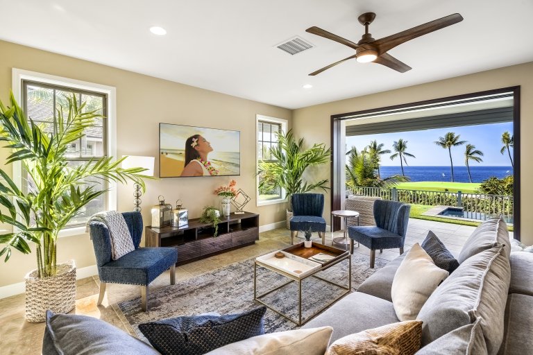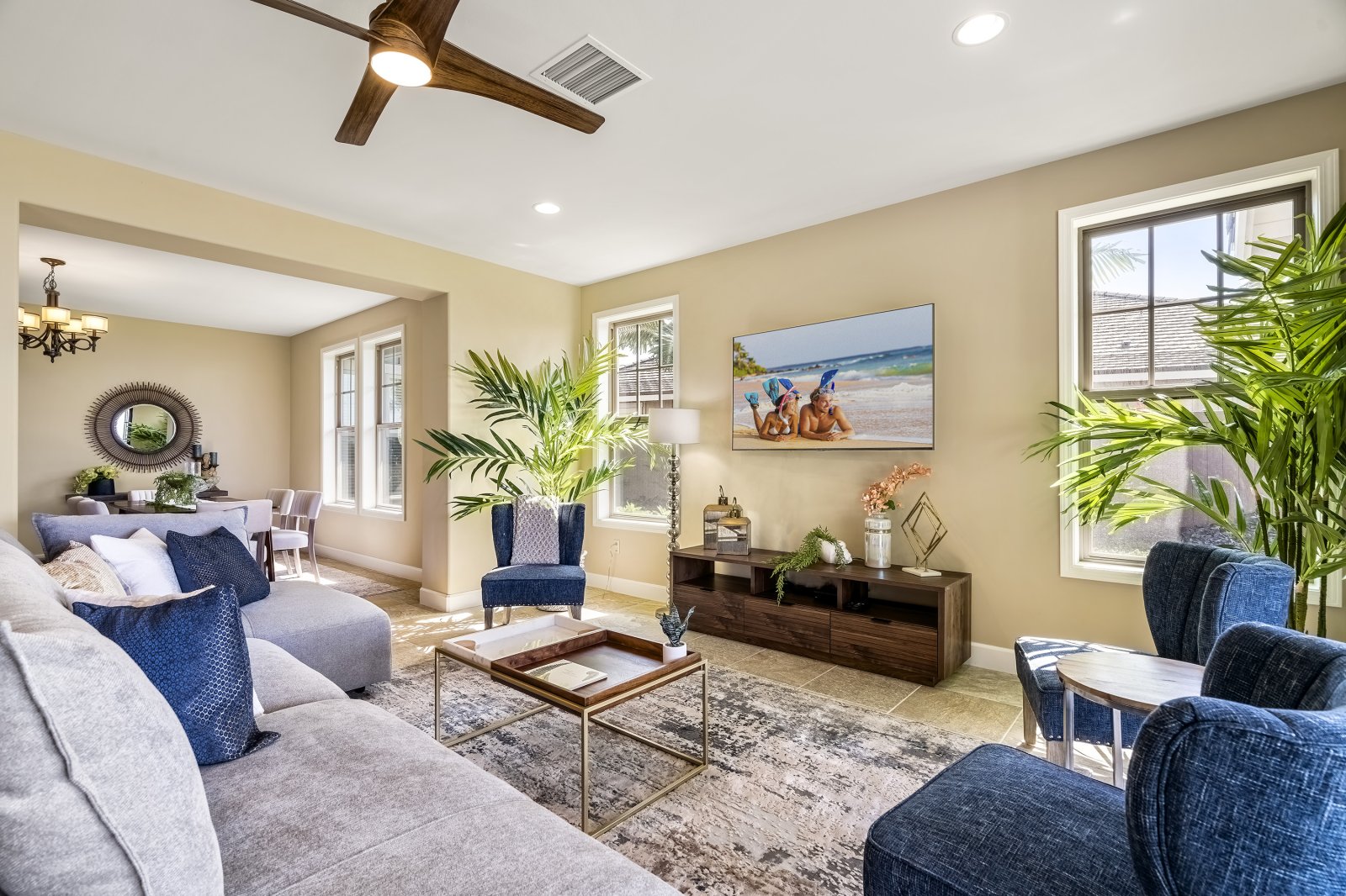 The main living area is bright, open, and effortlessly connected to the outdoors. Floor-to-ceiling sliding glass doors frame views of palms and manicured fairways, inviting fresh air and natural light throughout the space. Coastal-inspired furnishings, generous seating, and a Smart TV create an inviting environment for relaxed evenings, casual entertaining, or quiet downtime after a day exploring the coast.Just beyond the living room, the covered lanai becomes an extension of the interior, encouraging an easy indoor-outdoor rhythm that defines island living.