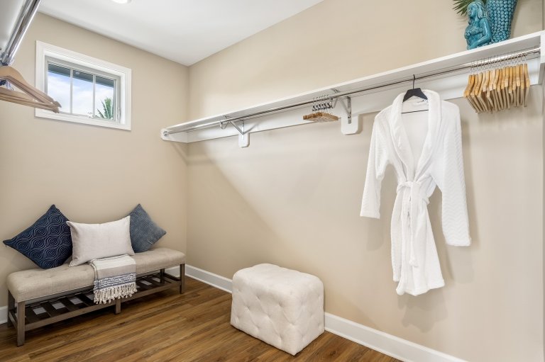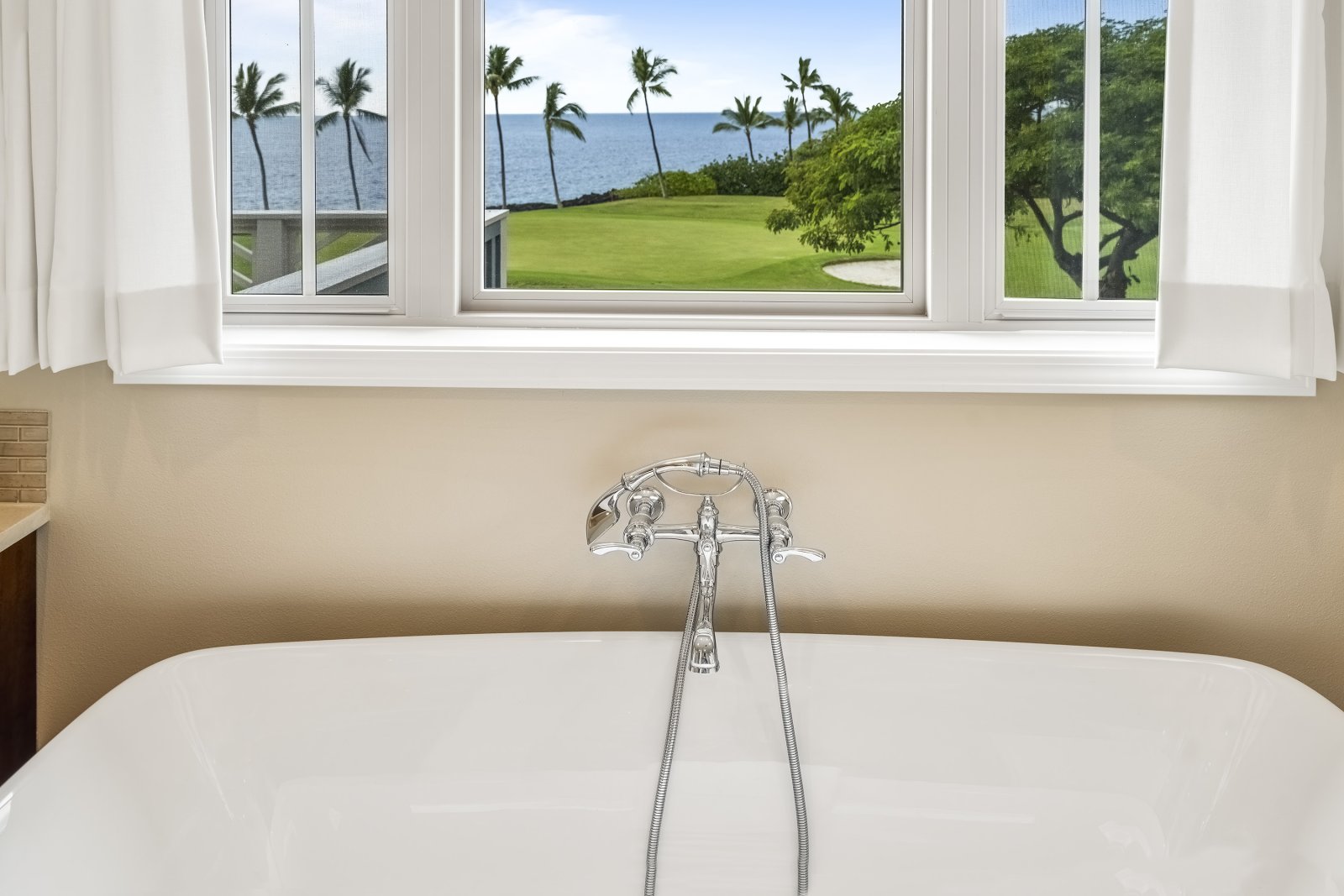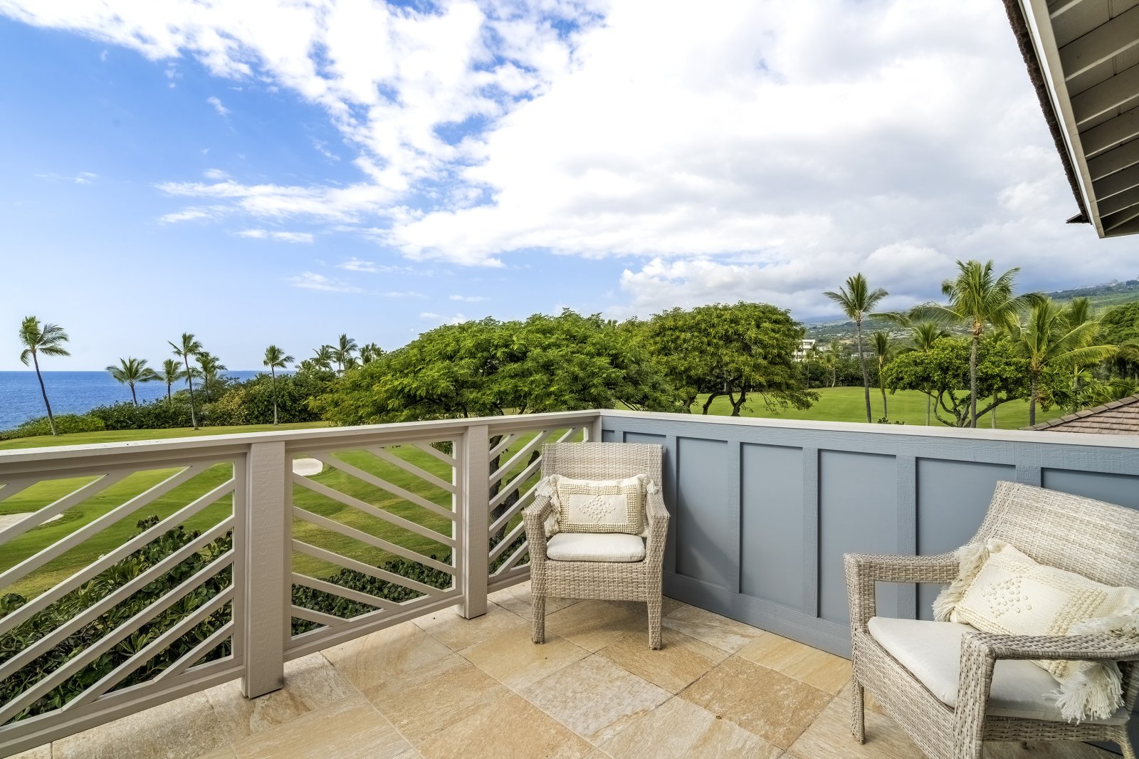Located upstairs, the primary suite features a king bed, private balcony, and sweeping views of the golf course with ocean and garden accents. The ensuite bathroom includes a soaking tub, walk-in shower, and dual vanities, creating a spa-like retreat.