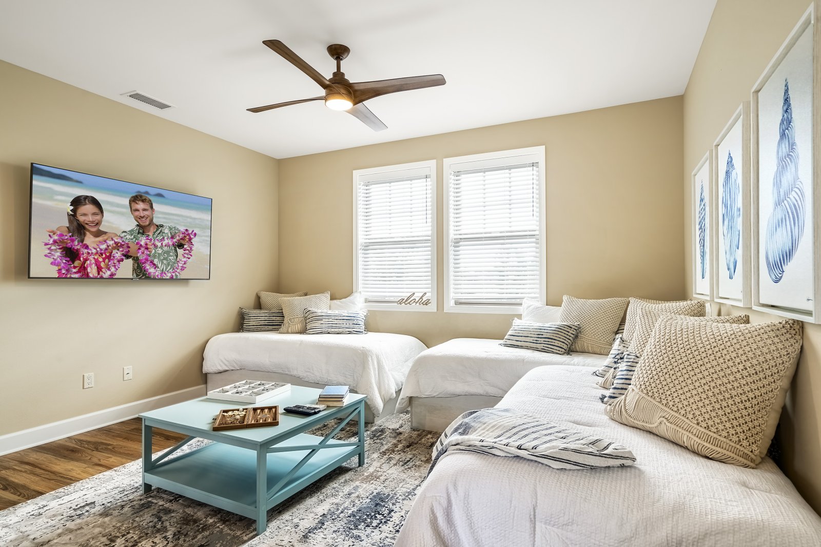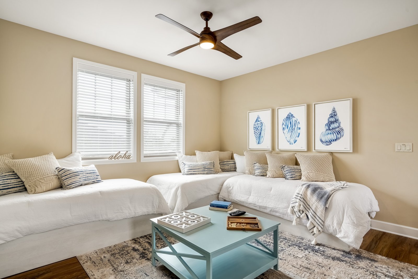 Three twin beds make this space perfect for children or teens, offering a relaxed sleeping and lounging zone separate from the main living areas.
