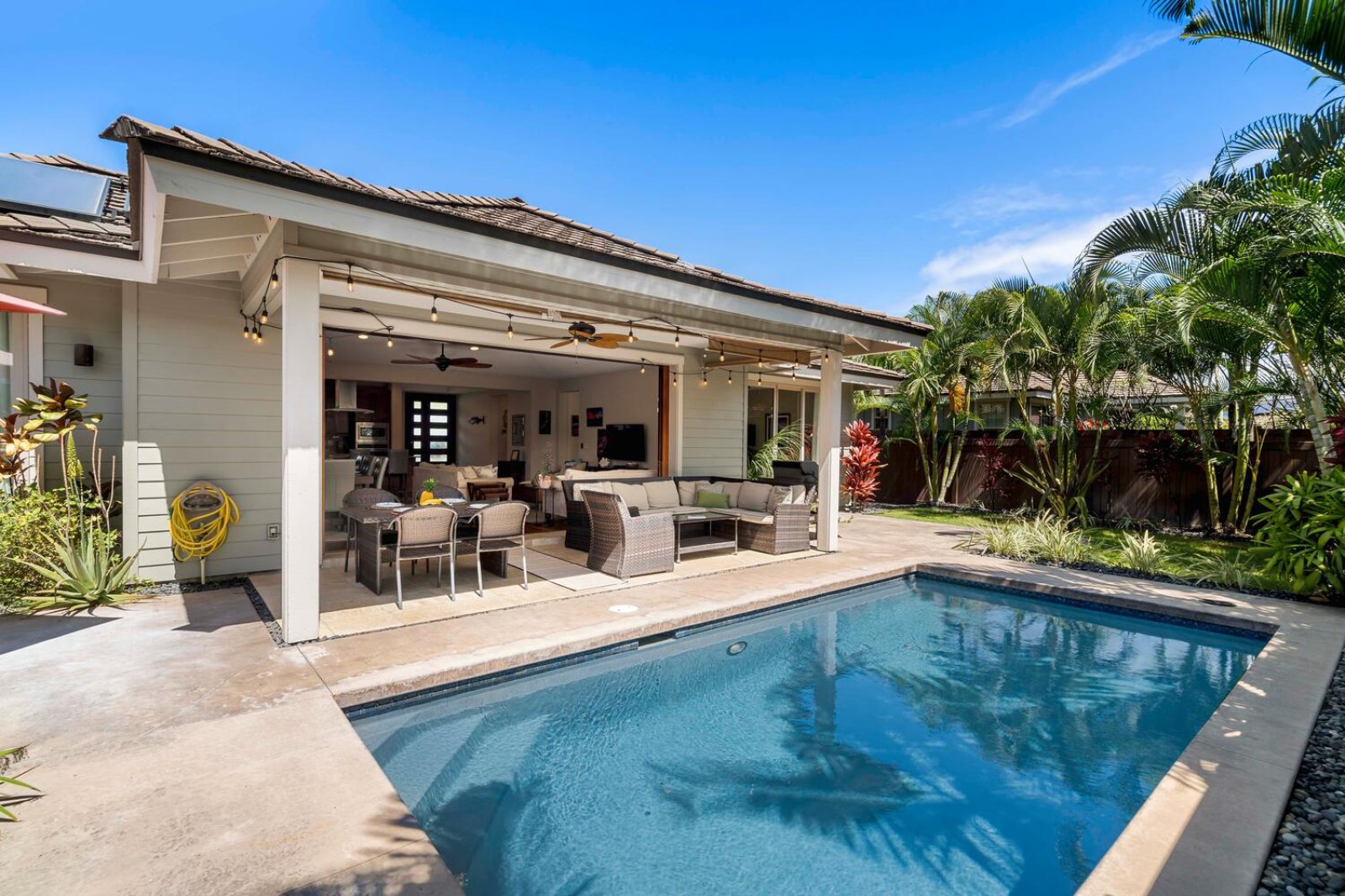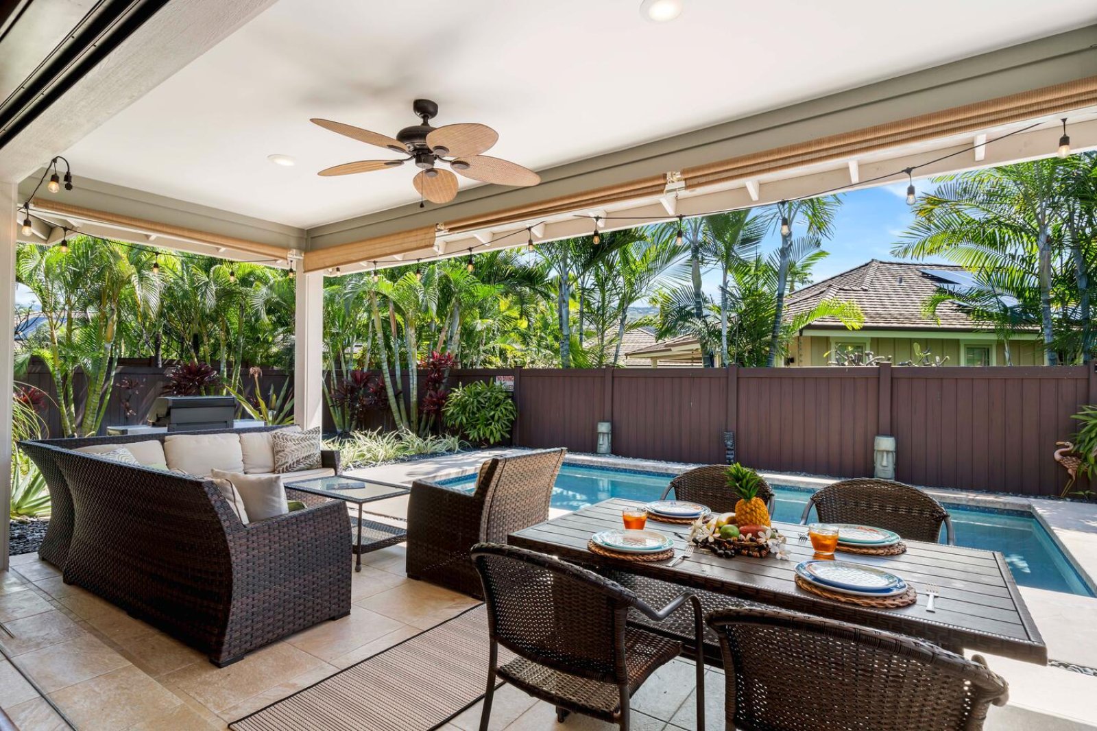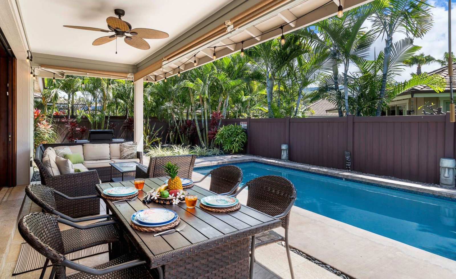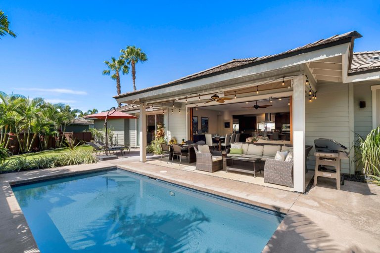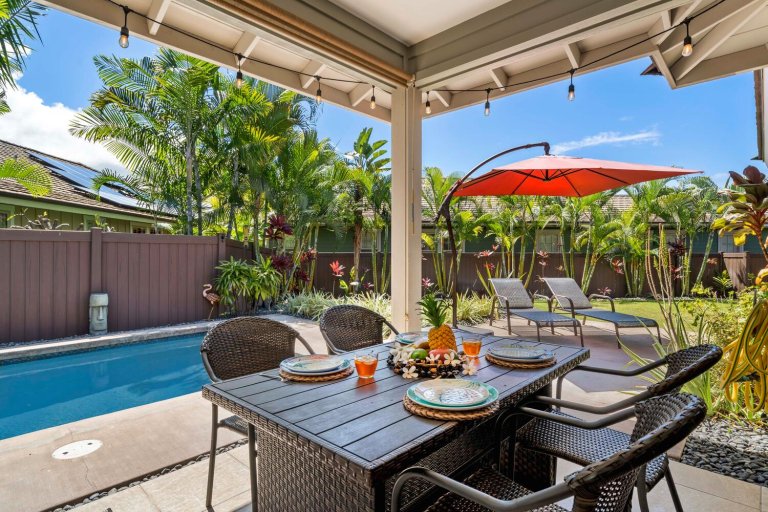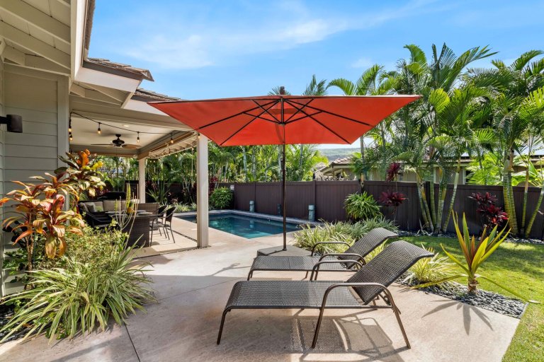 The chef-ready kitchen is thoughtfully designed for both casual meals and entertaining. Granite countertops, solid wood cabinetry, and stainless steel appliances provide style and functionality, while a breakfast bar seating three invites morning Kona coffee or relaxed bites throughout the day. Fully stocked with cookware and small appliances, the kitchen makes dining at home effortless.Private Outdoor Oasis