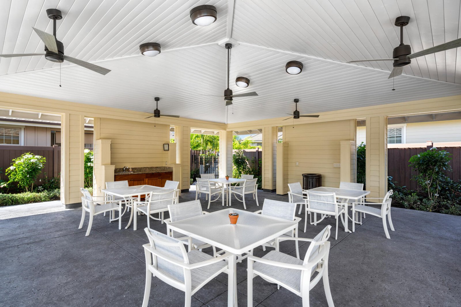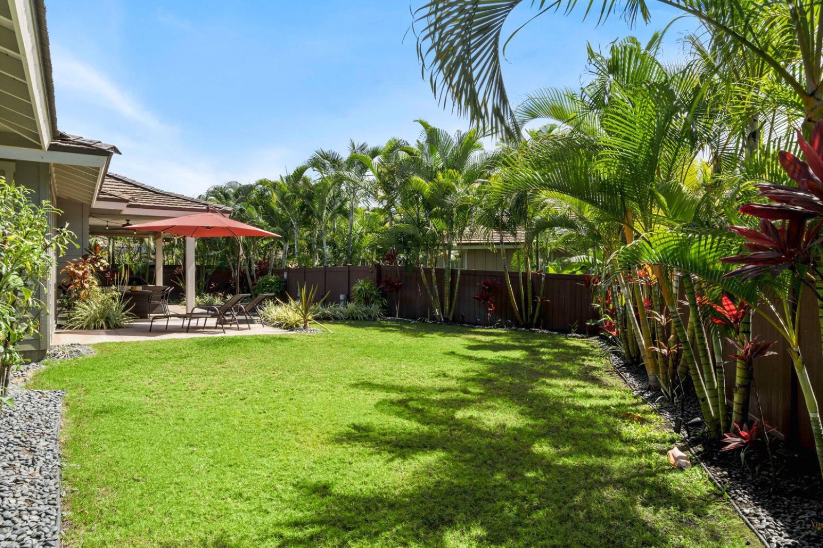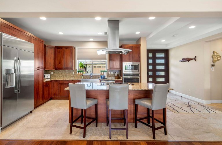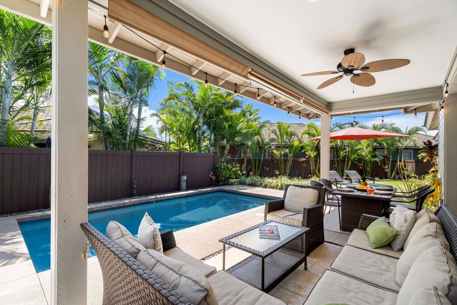 The chef-ready kitchen is thoughtfully designed for both casual meals and entertaining. Granite countertops, solid wood cabinetry, and stainless steel appliances provide style and functionality, while a breakfast bar seating three invites morning Kona coffee or relaxed bites throughout the day. Fully stocked with cookware and small appliances, the kitchen makes dining at home effortless.Private Outdoor Oasis
