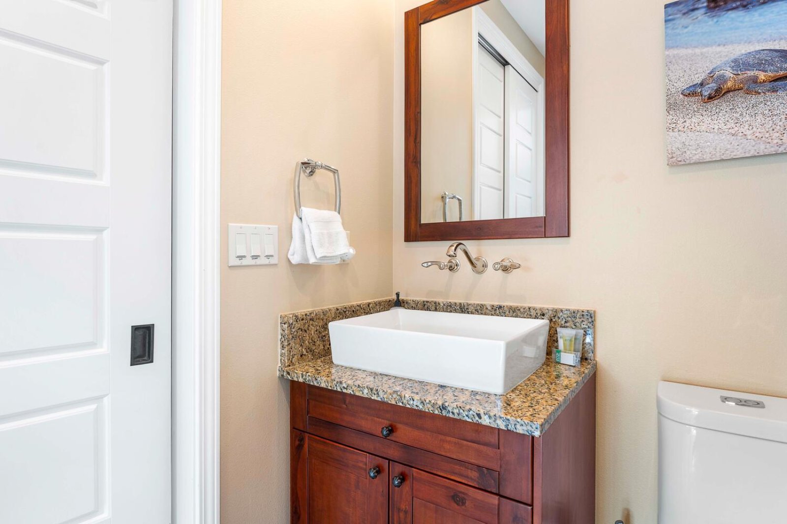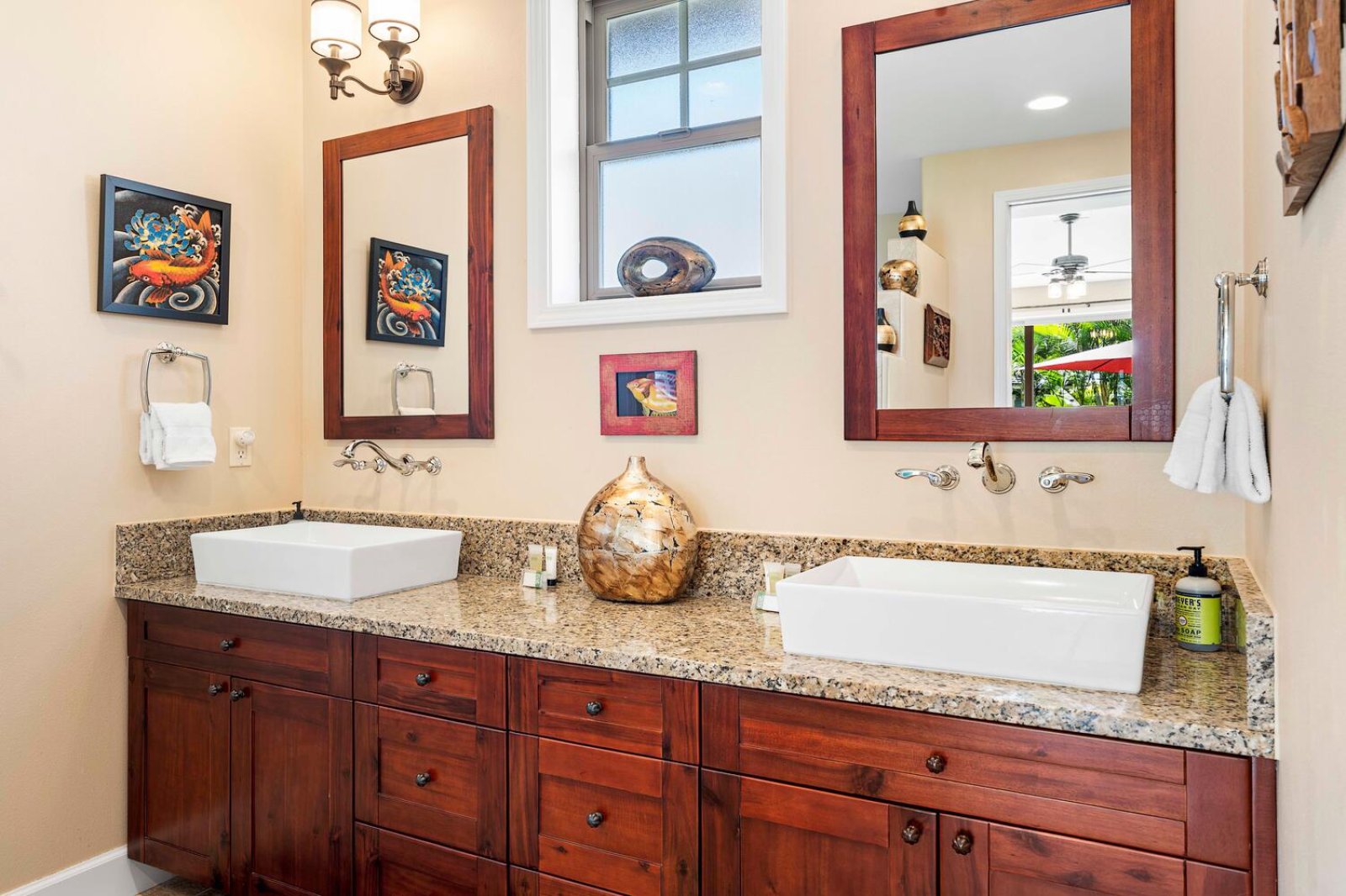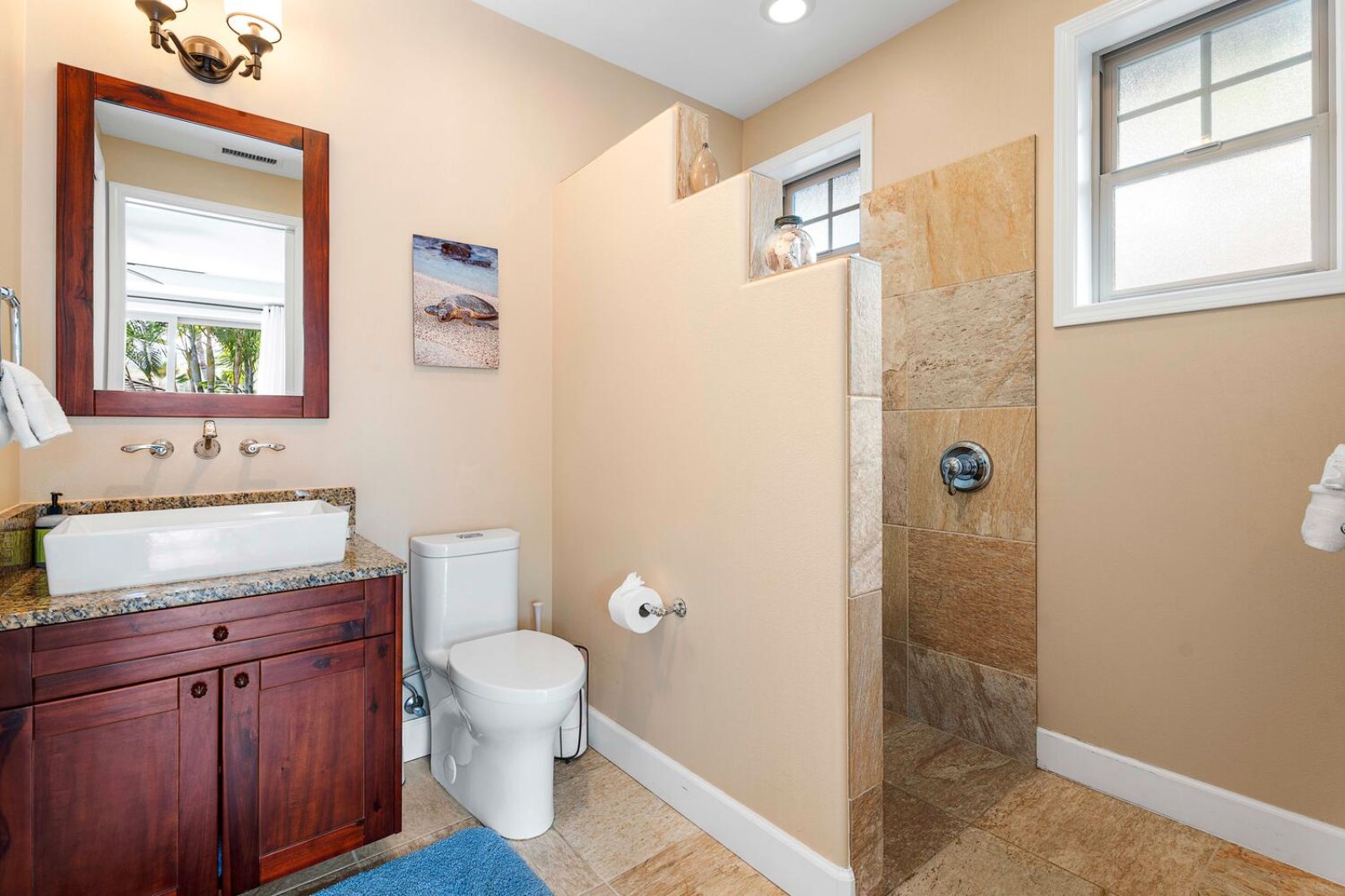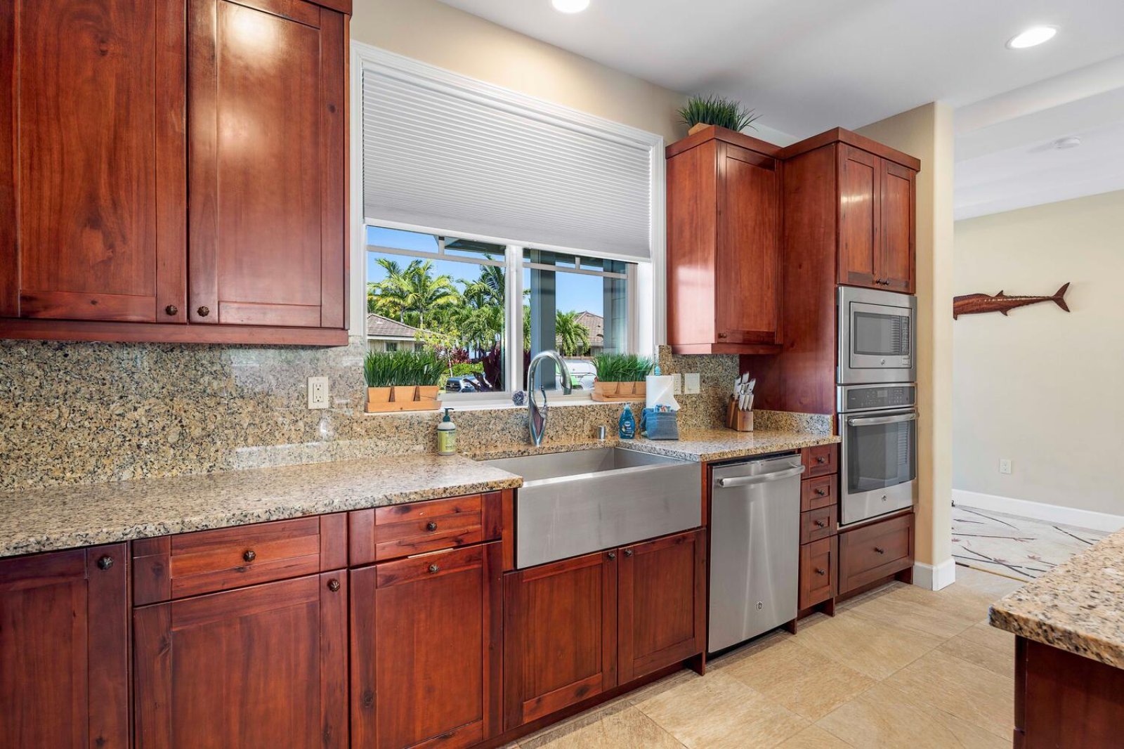 The chef-ready kitchen is thoughtfully designed for both casual meals and entertaining. Granite countertops, solid wood cabinetry, and stainless steel appliances provide style and functionality, while a breakfast bar seating three invites morning Kona coffee or relaxed bites throughout the day. Fully stocked with cookware and small appliances, the kitchen makes dining at home effortless.Private Outdoor Oasis