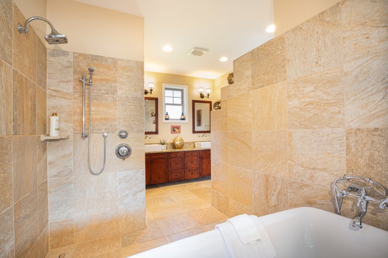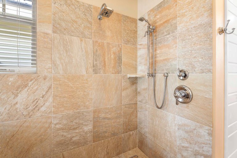 - Guest Bedroom Three: Queen bed, ceiling fan, central A/C, and en-suite bath with walk-in shower