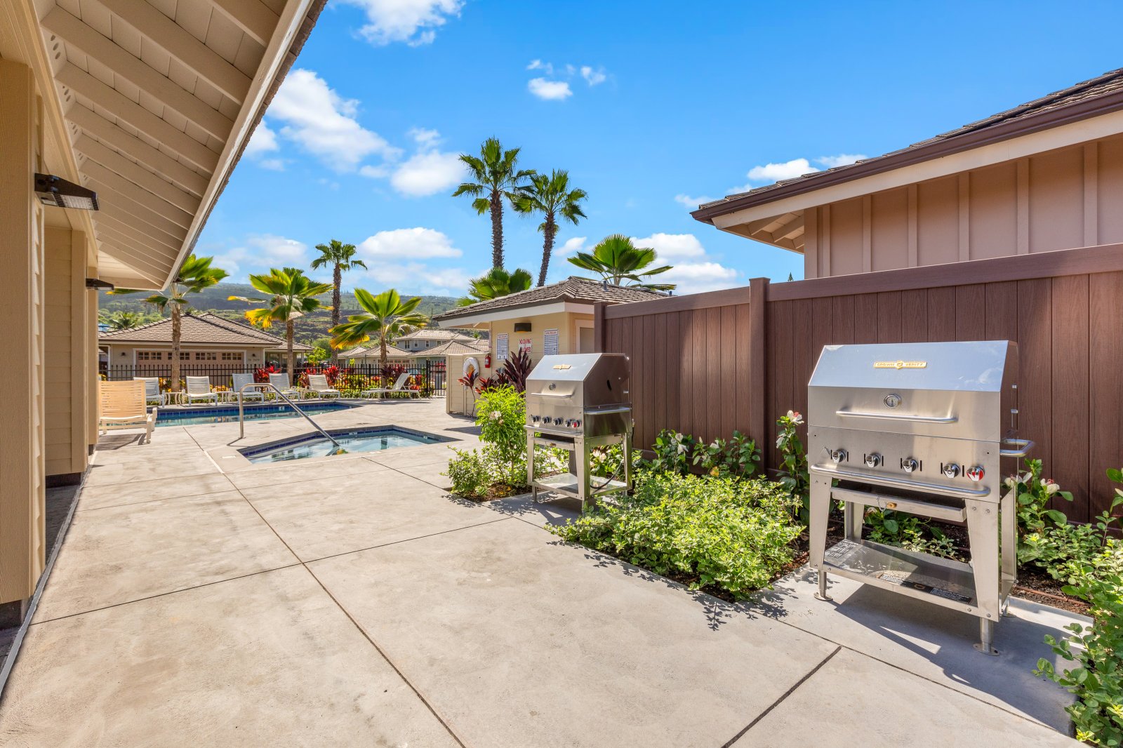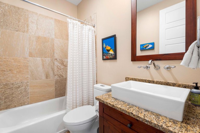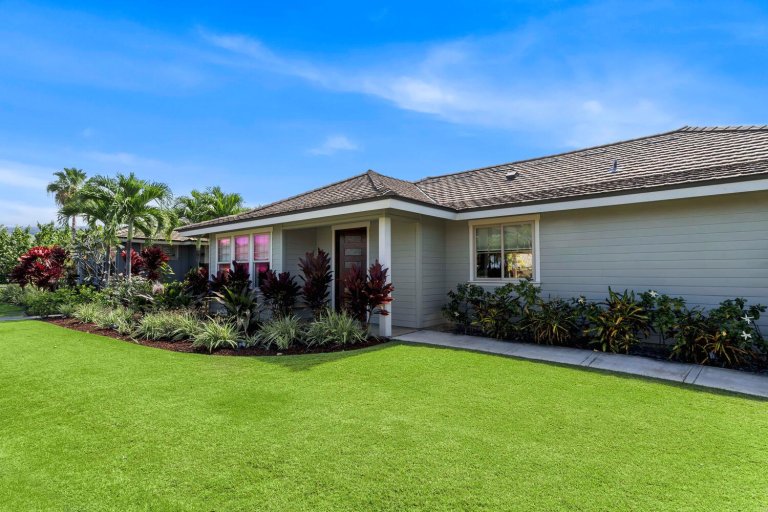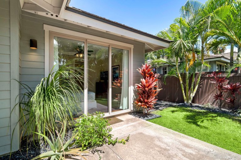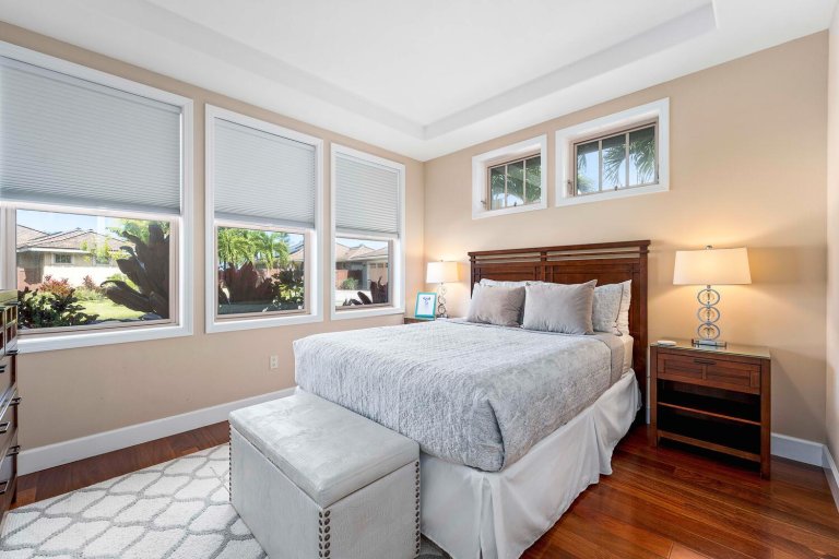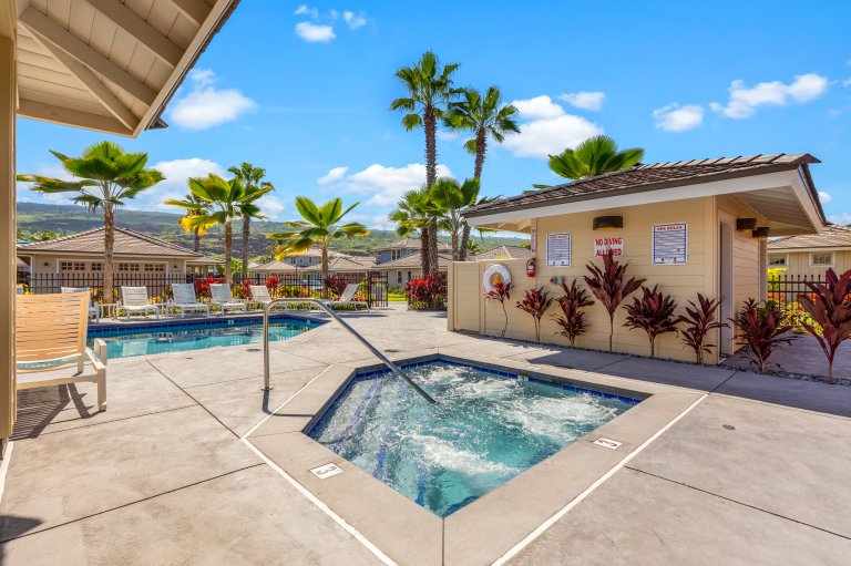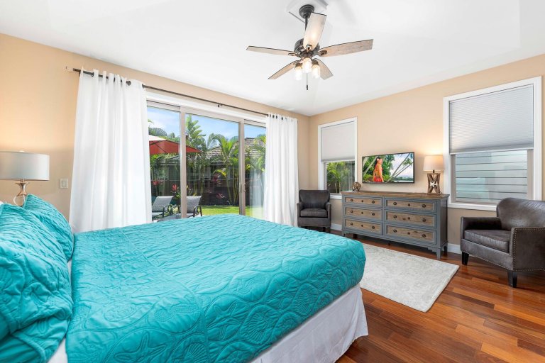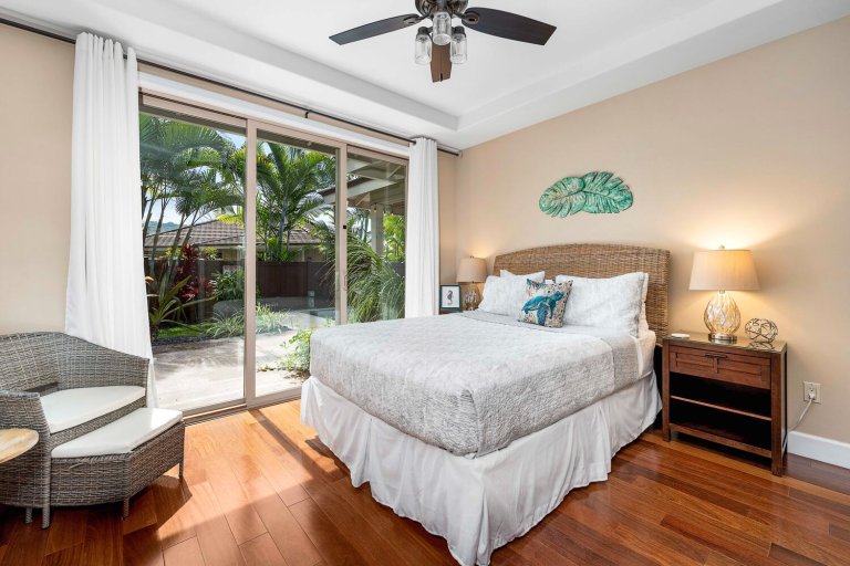 Holua Kai #32 comfortably accommodates guests across three private bedroom suites, each designed with comfort and tranquility in mind.- Primary Suite: California king bed, ceiling fan, central A/C, garden and pool views, and an en-suite bath with soaking tub, walk-in shower, and dual vanities