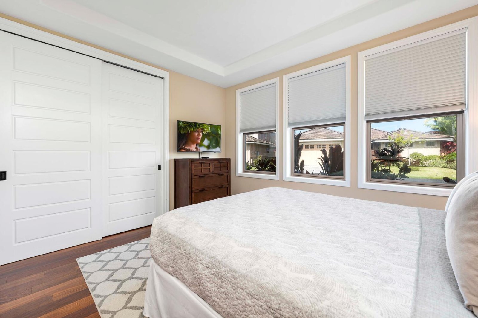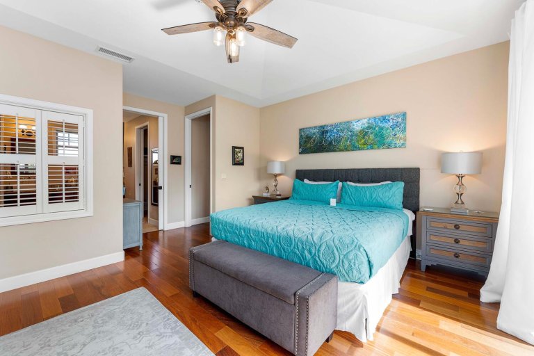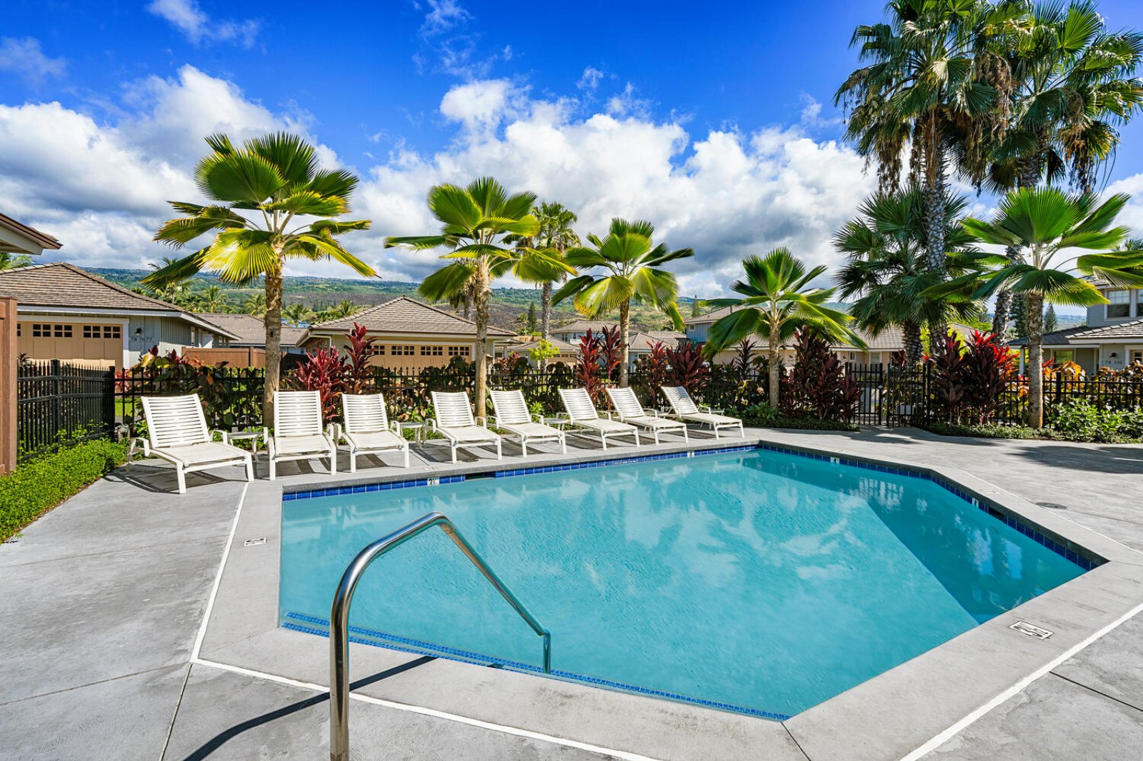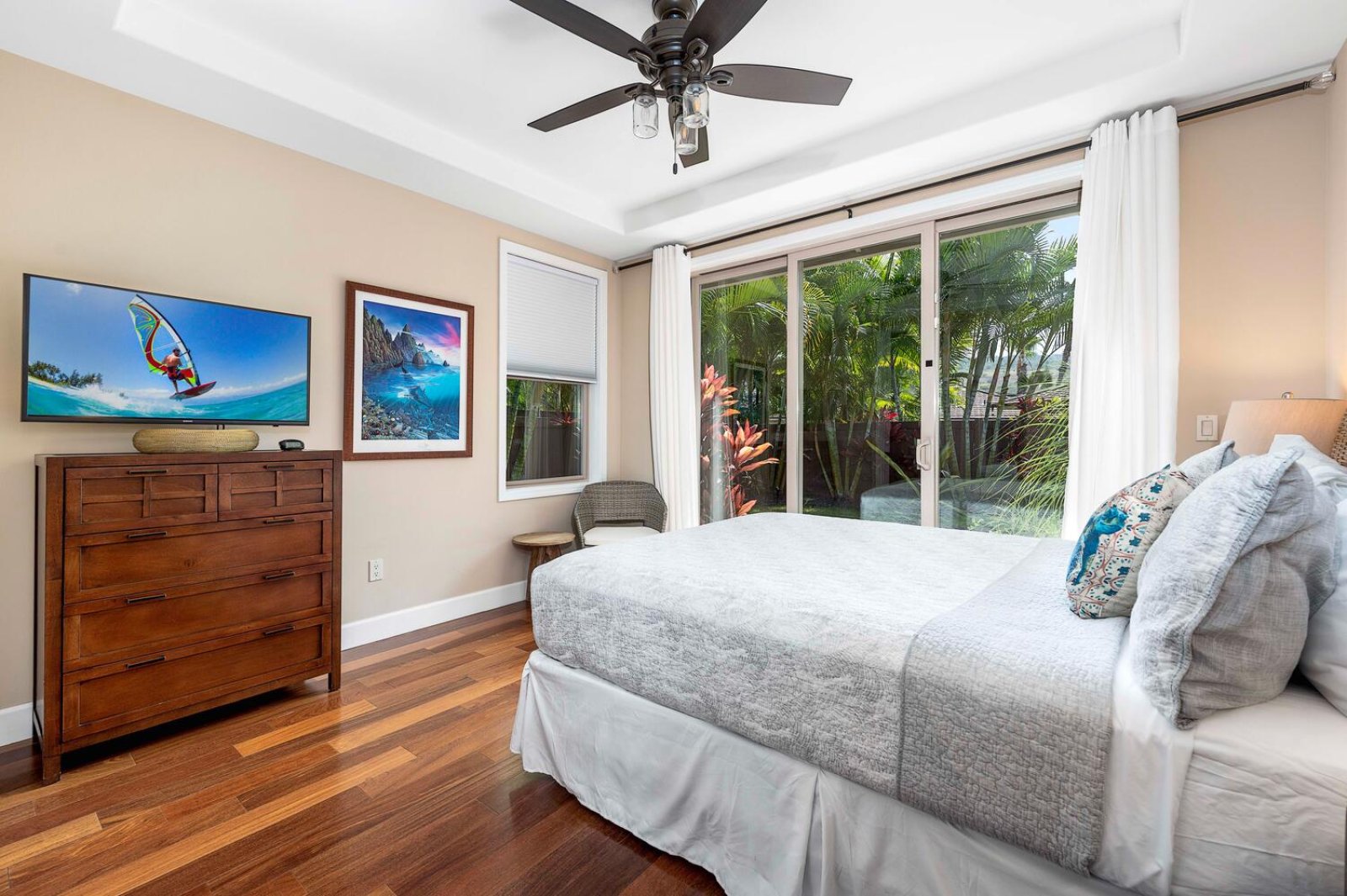 Holua Kai #32 comfortably accommodates guests across three private bedroom suites, each designed with comfort and tranquility in mind.- Primary Suite: California king bed, ceiling fan, central A/C, garden and pool views, and an en-suite bath with soaking tub, walk-in shower, and dual vanities