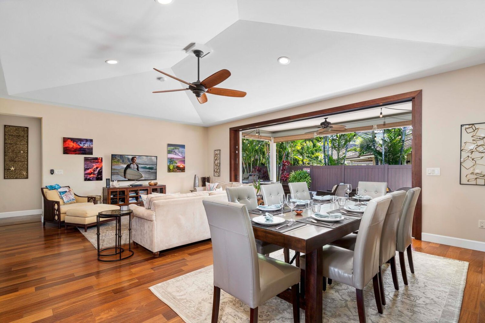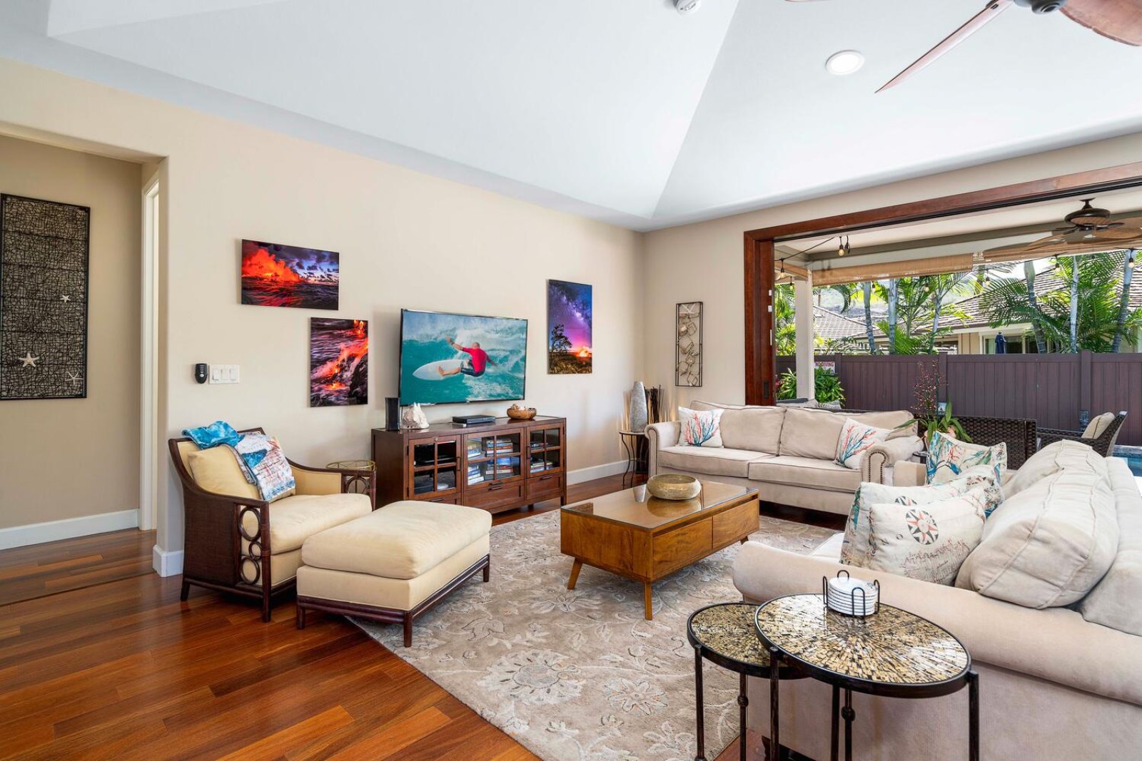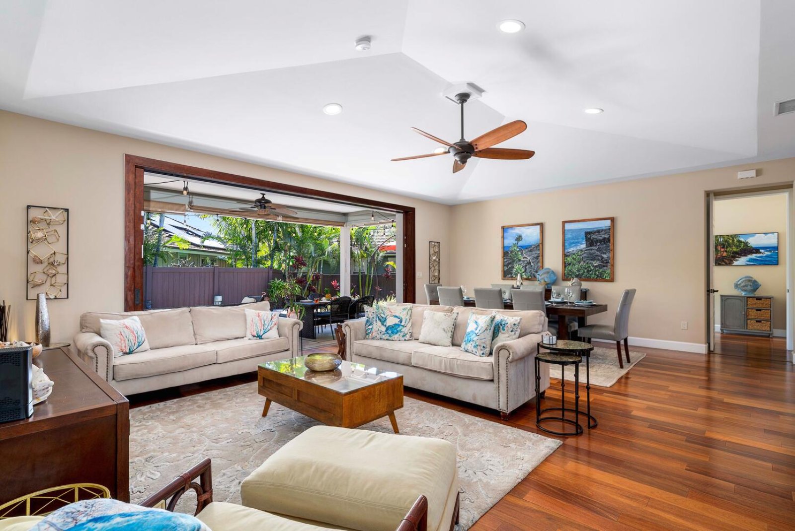The heart of the home is an expansive great room defined by soaring ceilings, refined island-inspired décor, and floor-to-ceiling pocket doors that open fully to the shaded lanai. Natural light and gentle trade winds create an airy, welcoming atmosphere. The living area features plush seating and a 52-inch 4K TV with Blu-ray/DVD player—ideal for unwinding after a day spent exploring the Kona Coast. Adjacent to the living room, the dining area seats eight at a rustic wood table, perfect for shared meals and lingering conversation.Sleeping Accommodations | Up to 6 Guests
