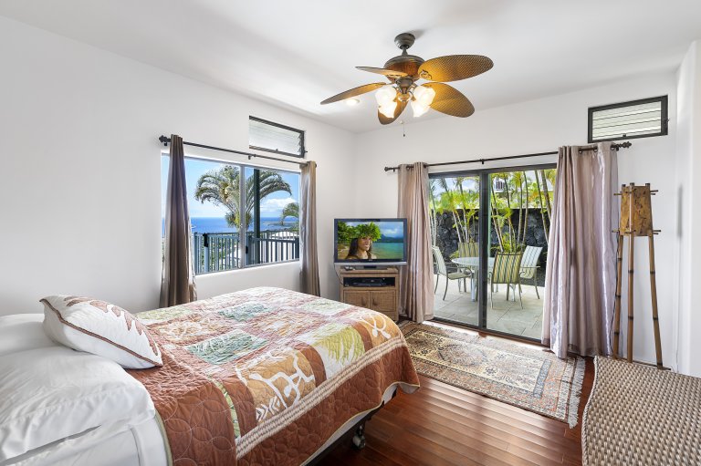 • Guest Bedroom Two: Queen bed, split A/C, ensuite bathroom, ocean views, and direct lanai access.