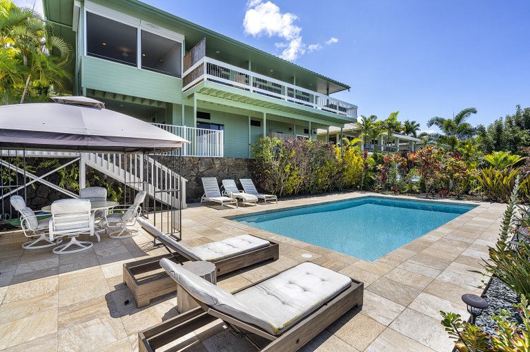Welcome to Hoʻo Maluhia, a luxurious hillside retreat perched approximately 700 feet above Kailua-Kona. Meaning “to bring peace,” Hoʻo Maluhia lives up to its name with sweeping 180° Pacific Ocean views, cooling breezes, and thoughtfully designed indoor-outdoor living spaces. This spacious two-level home offers refined comfort, modern upgrades, and a tranquil setting—just minutes from beaches, dining, and Kona’s most beloved attractions. With brand-new split air conditioning in all sleeping areas, expansive sunset lanais, and a private pool surrounded by tropical landscaping, Hoʻo Maluhia is perfectly suited for families, couples, and groups seeking both relaxation and easy access to the best of the Kona Coast.Living Spaces