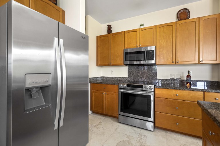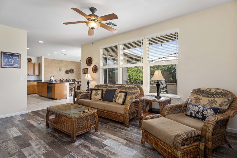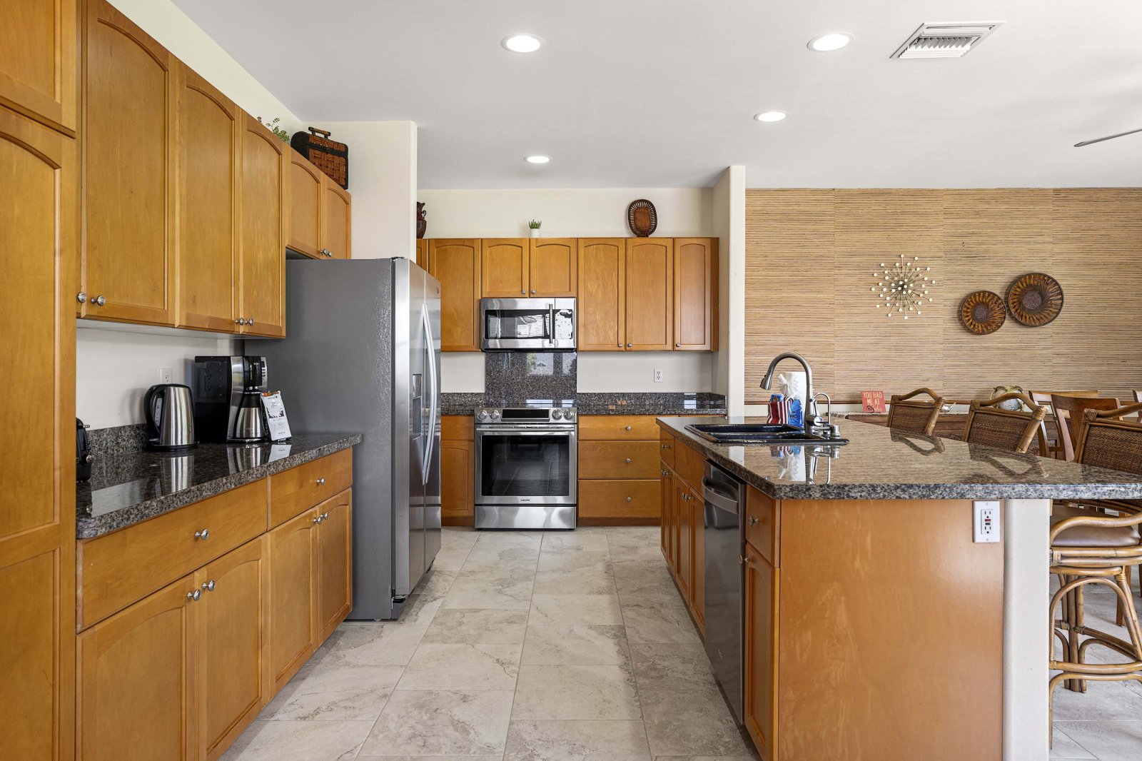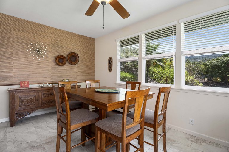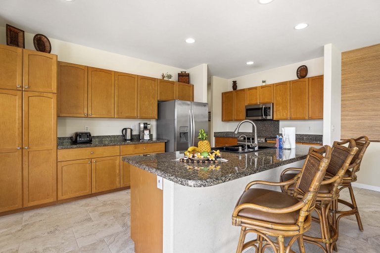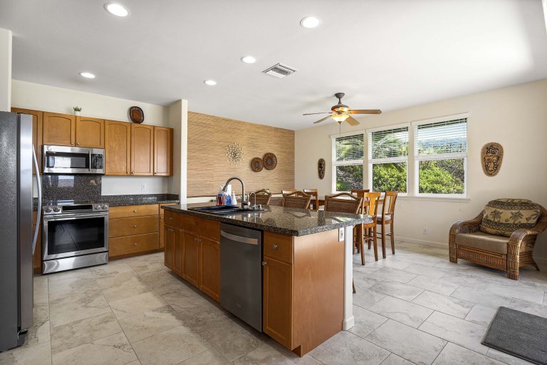 The open-concept great room is designed for unwinding after days spent exploring the Kona Coast. Plush seating and thoughtful layout encourage conversation, while a 75-inch Smart TV anchors the space for relaxed evenings in. The adjacent dining area comfortably seats six and flows directly into the living room, creating a cohesive space ideal for gathering. Large sliding doors open to the lanai, extending the living area outdoors and inviting in island breezes.Chef-Ready Kitchen