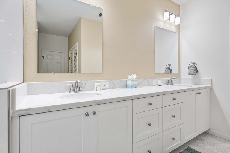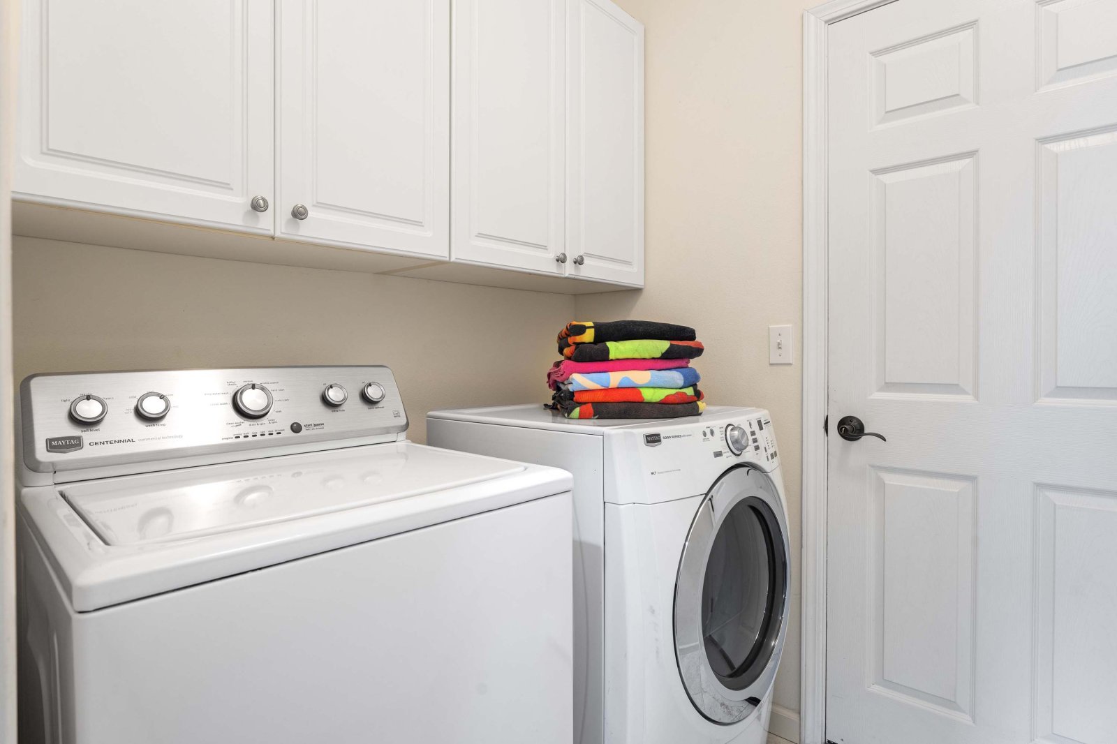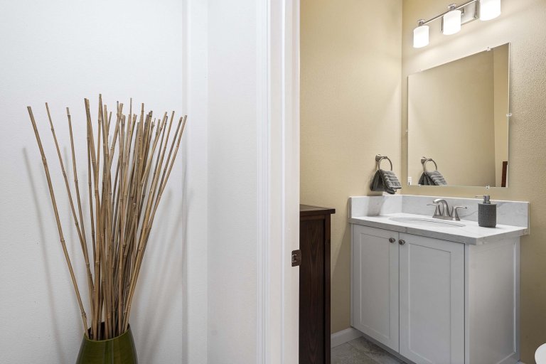 An additional powder room and a dedicated laundry room enhance convenience for longer stays.