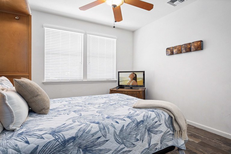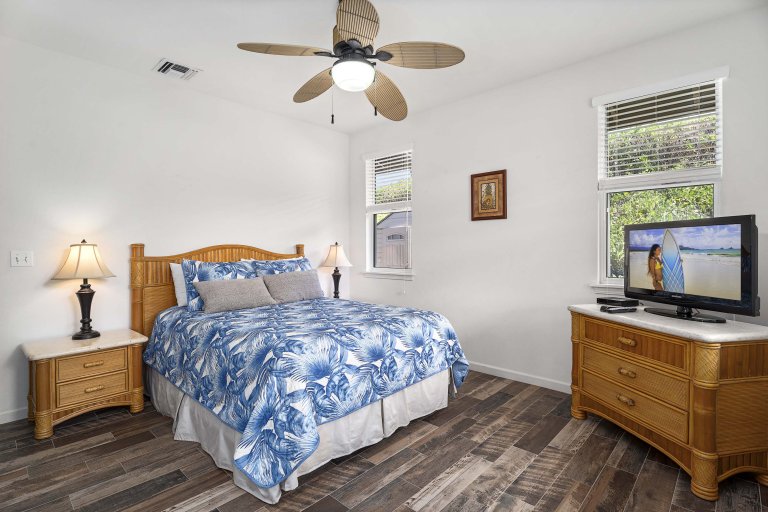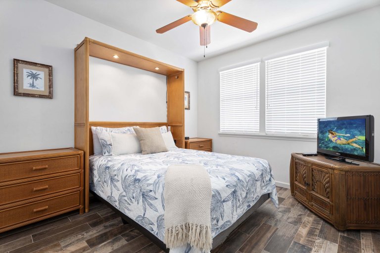 The expanded covered lanai functions as a second living room, complete with lounge seating, a dining table, and a 75-inch outdoor television. Just beyond, a private swimming pool and hot tub create a serene setting for sun-filled afternoons and peaceful evenings under the stars. The fully fenced backyard offers privacy and ocean views framed by tropical landscaping, while the built-in barbecue makes al fresco dining a natural part of daily life.Sleeping Accommodations | Up to 6 Guests