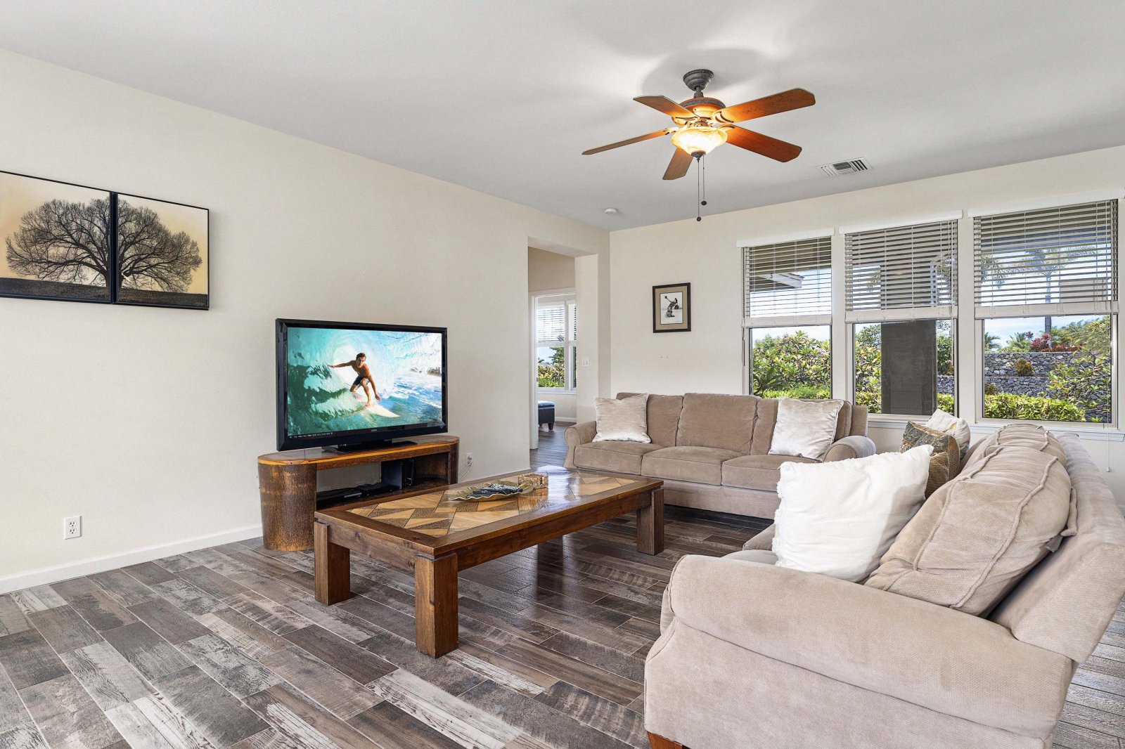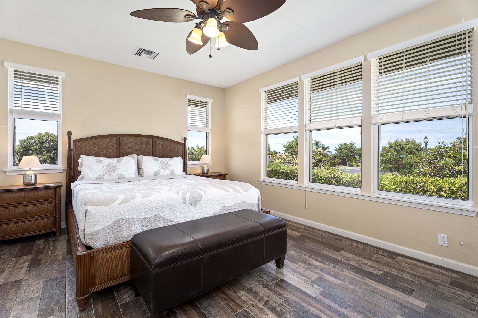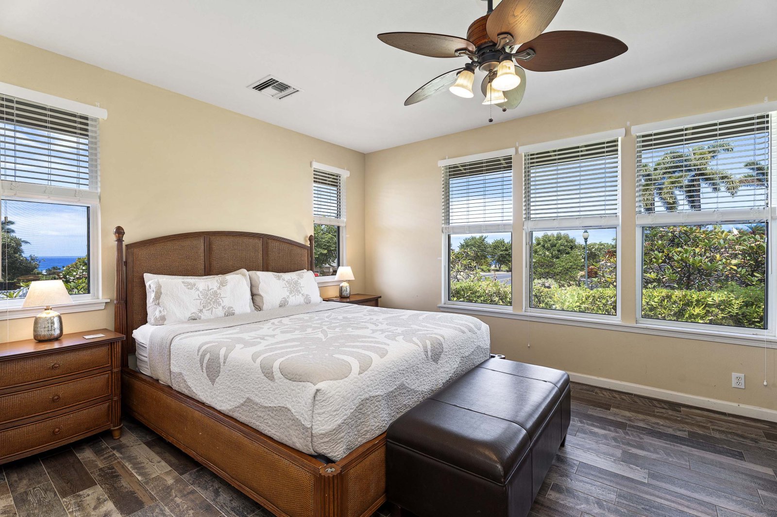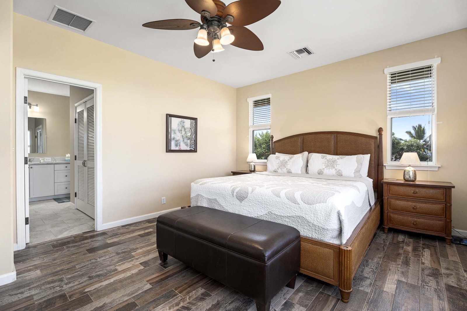 Kahakai Estates Hale comfortably sleeps up to six guests across three well-appointed bedrooms:• Primary Suite: California king bed, en-suite bathroom, and 65-inch Smart TV