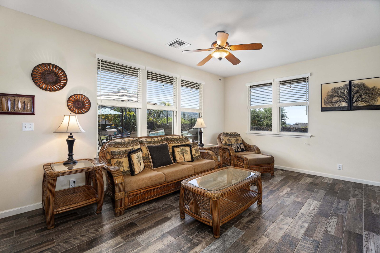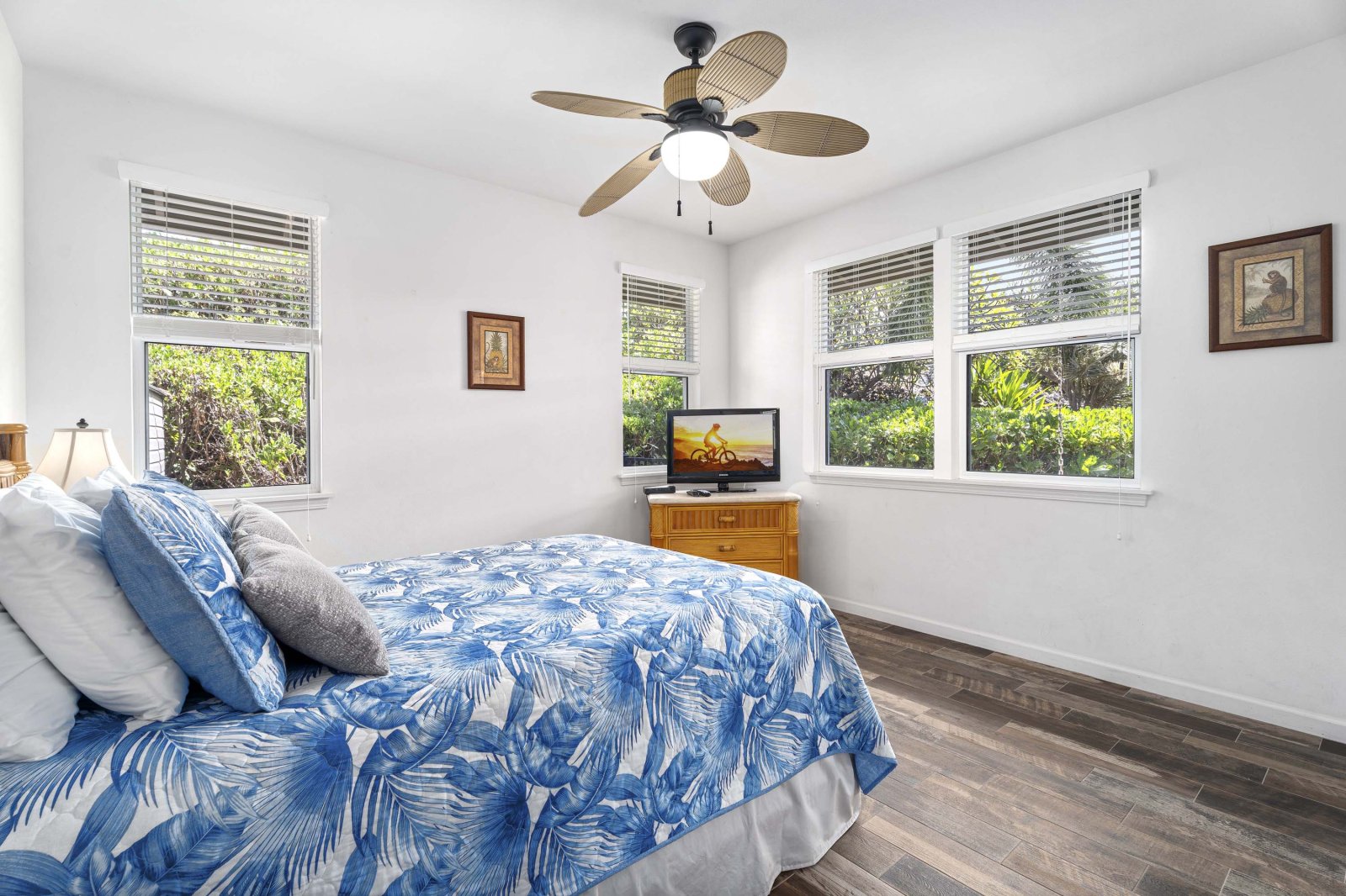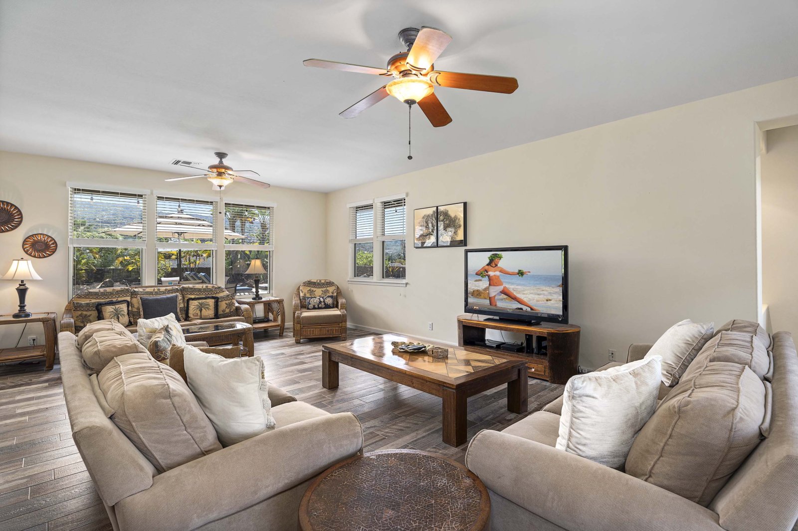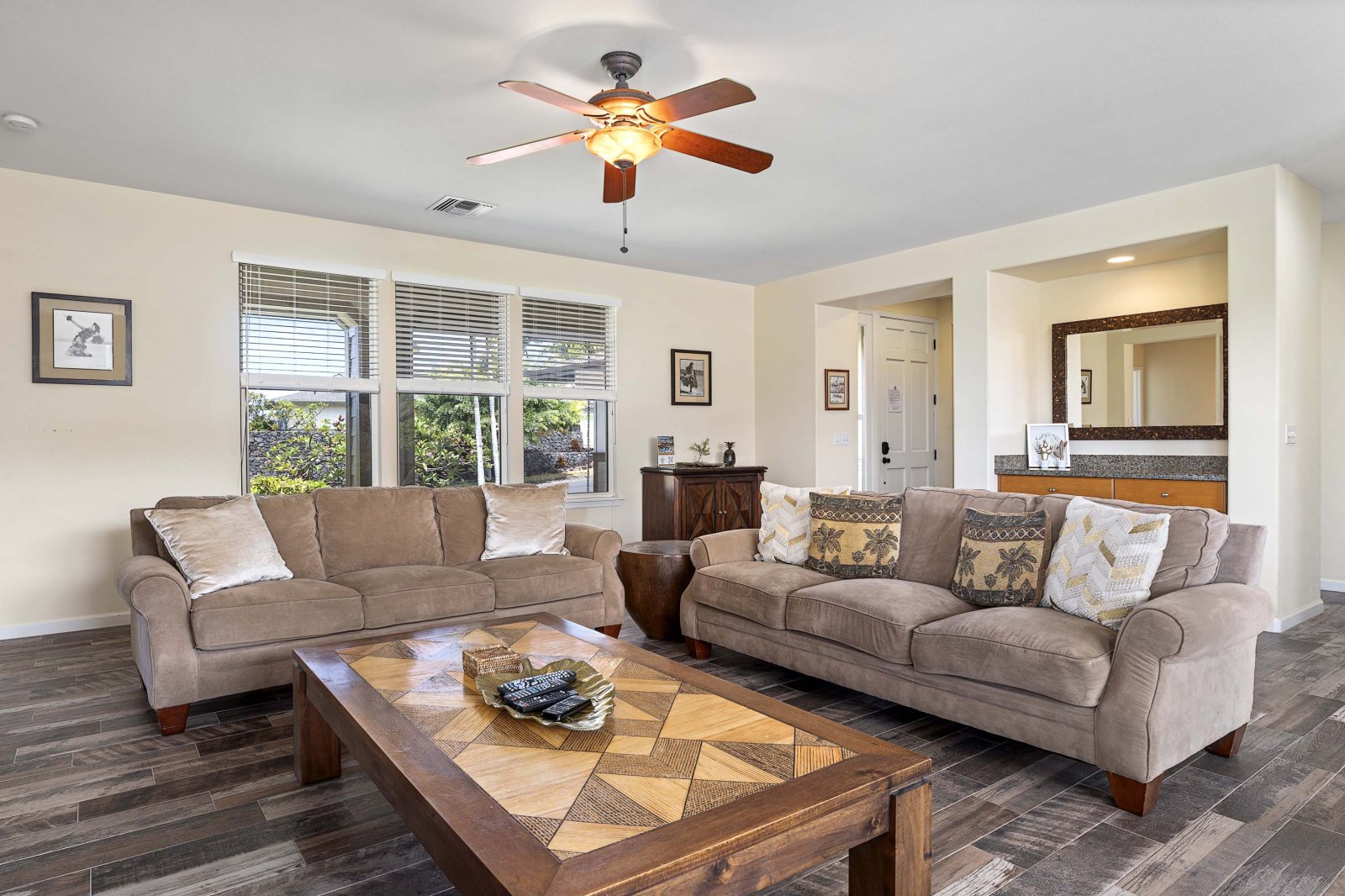 Kahakai Estates Hale comfortably sleeps up to six guests across three well-appointed bedrooms:• Primary Suite: California king bed, en-suite bathroom, and 65-inch Smart TV