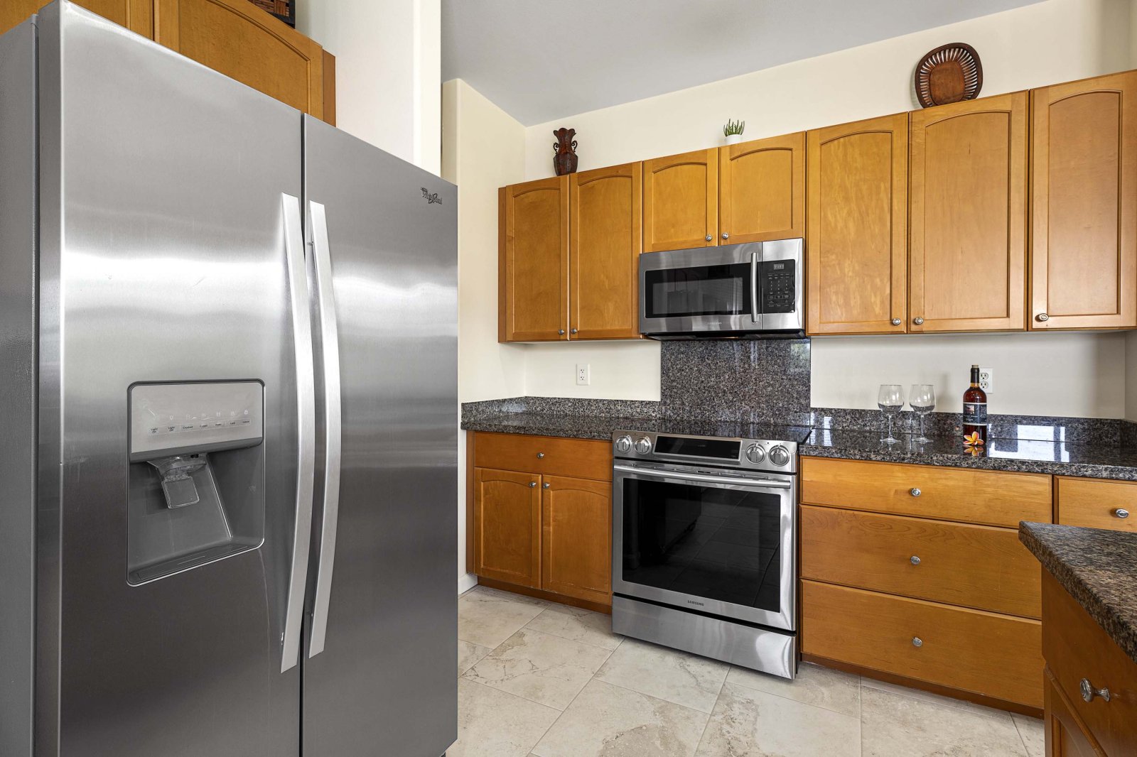 The fully remodeled kitchen features custom cabinetry, granite countertops, and stainless steel appliances. Bar seating provides a casual spot for morning coffee or quick bites, while the kitchen’s direct access to the lanai makes entertaining effortless. Whether preparing fresh island ingredients or enjoying a simple meal at home, this space is designed for ease and enjoyment.Outdoor Living