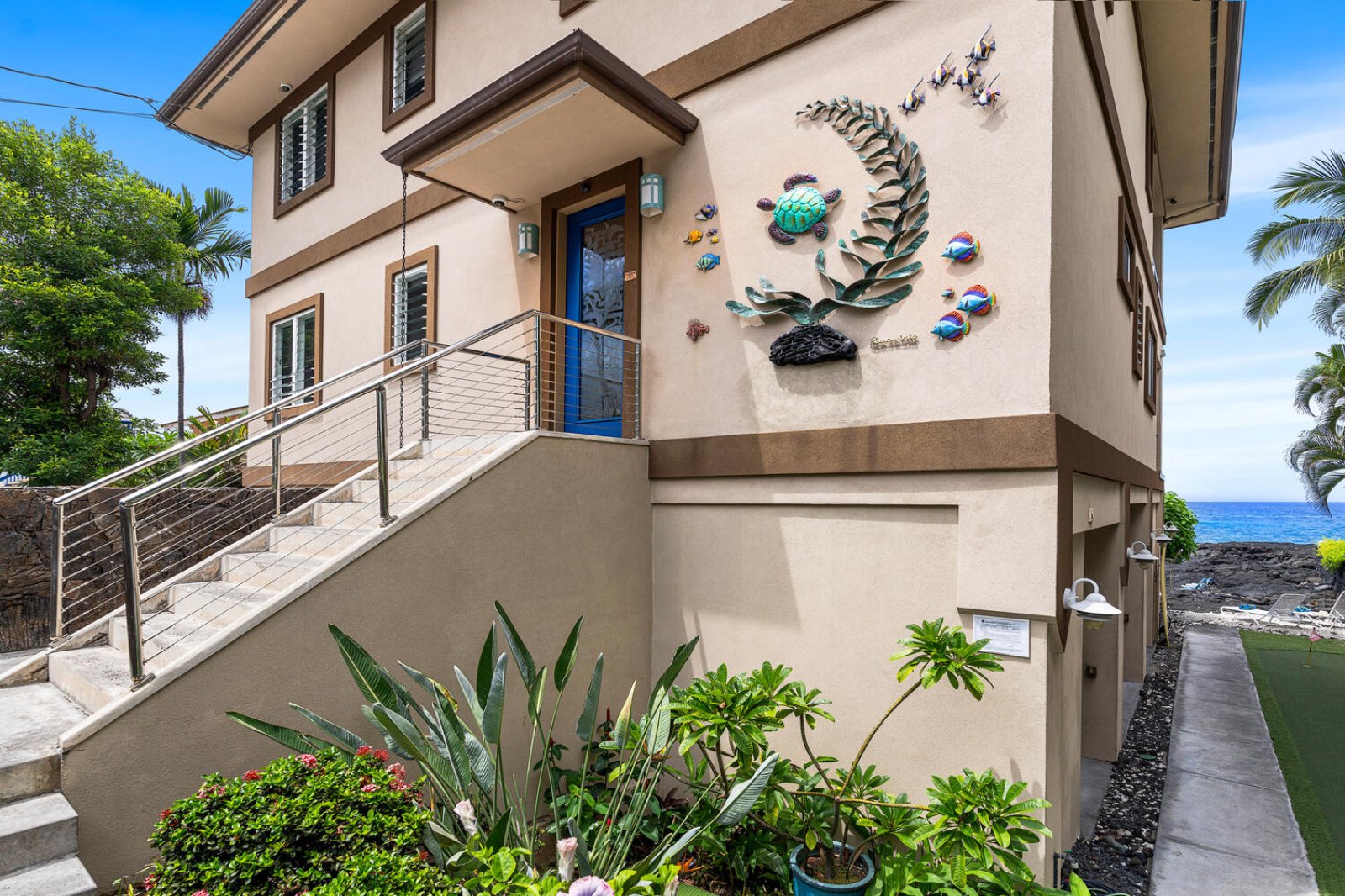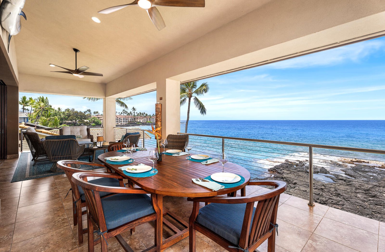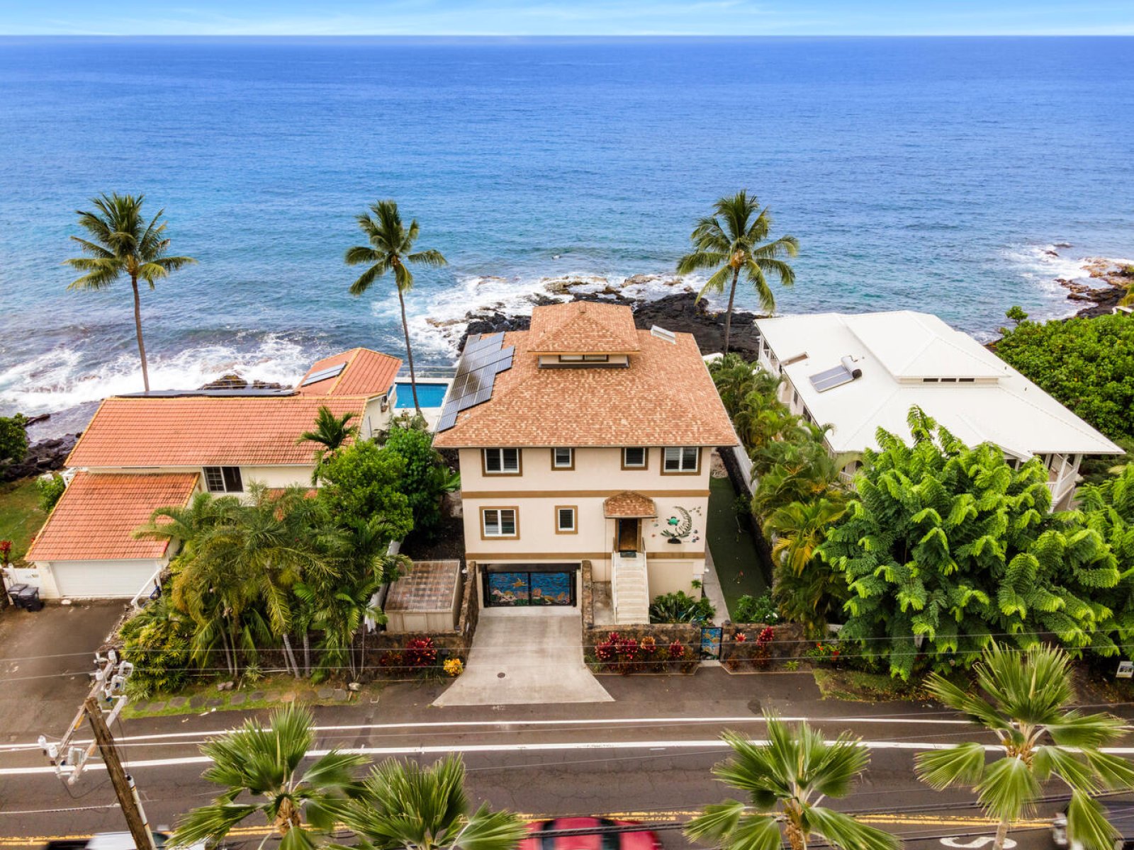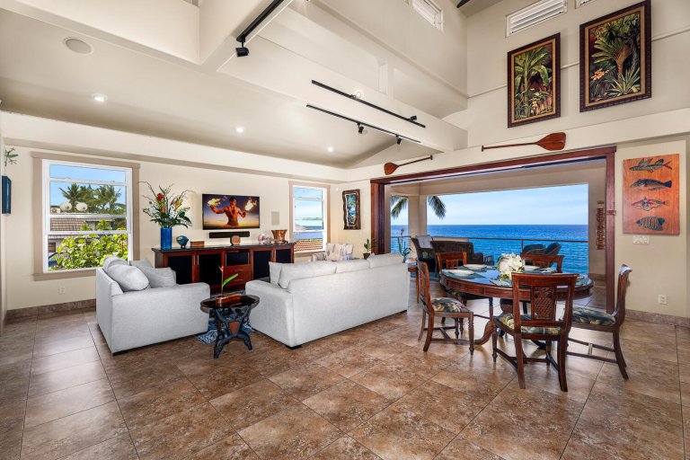 Welcome to Kailani Vista, a rare three-level oceanfront residence set directly above the lava shoreline on iconic Aliʻi Drive. Just a scenic walk from the heart of Kailua-Kona, this refined coastal retreat offers front-row Pacific views, dramatic sunsets, and effortless access to the best of Kona living. Thoughtfully designed for comfort and privacy, Kailani Vista pairs a premier location with resort-style amenities in a setting that feels both relaxed and elevated.Living and Dining