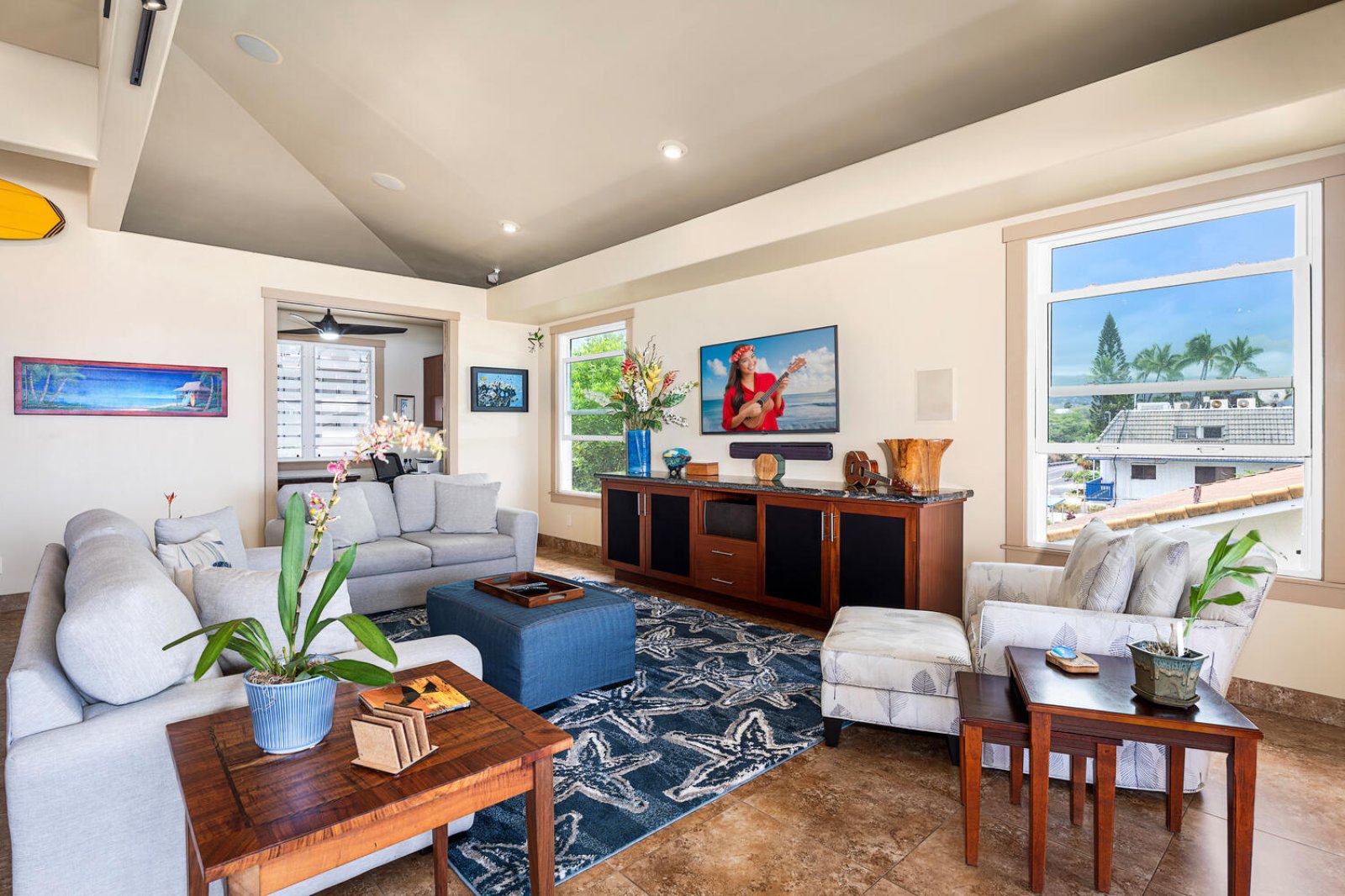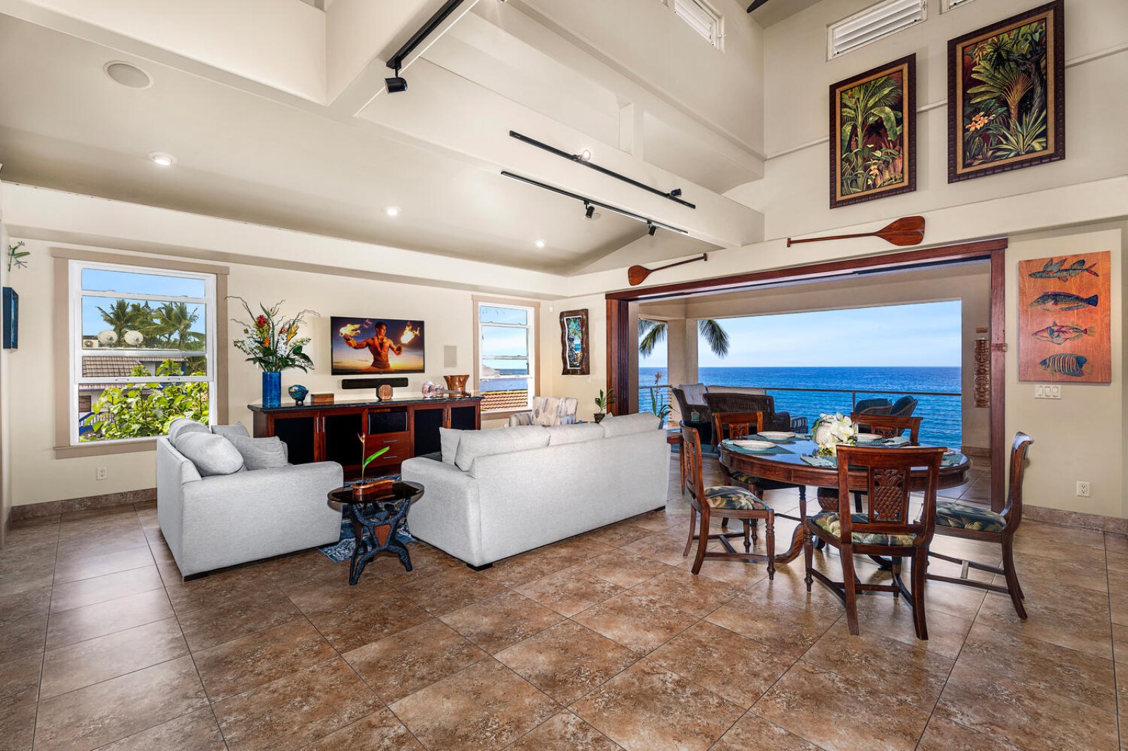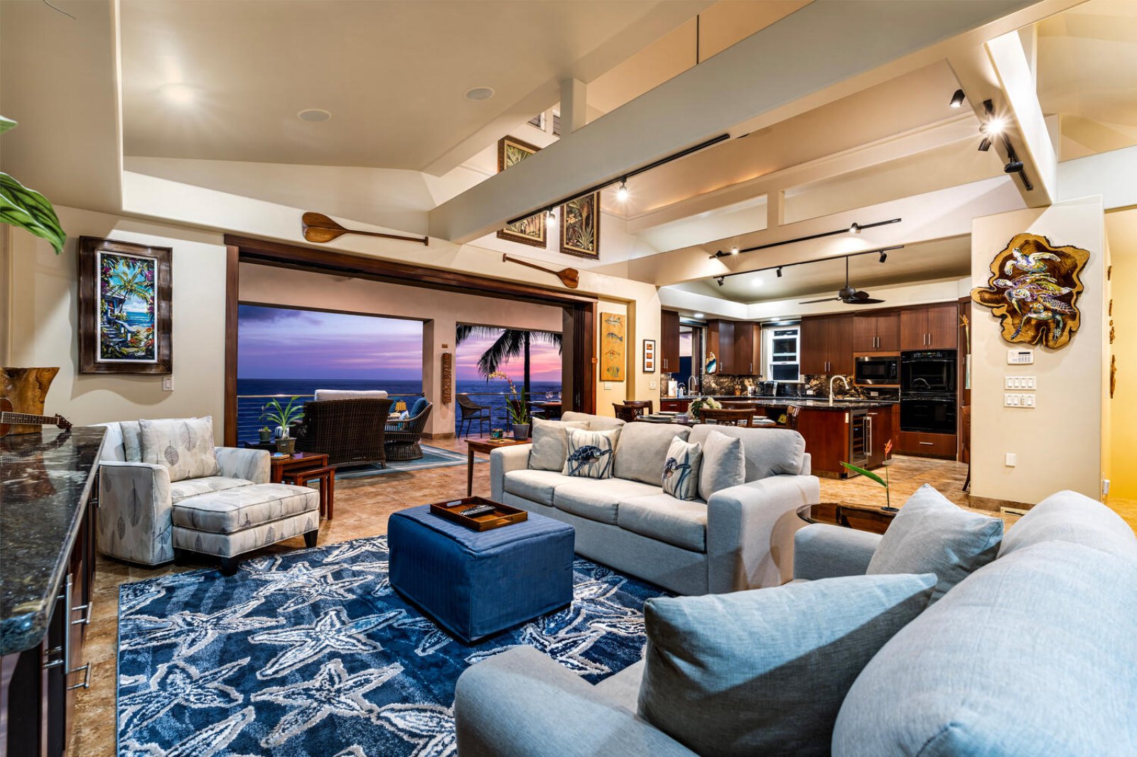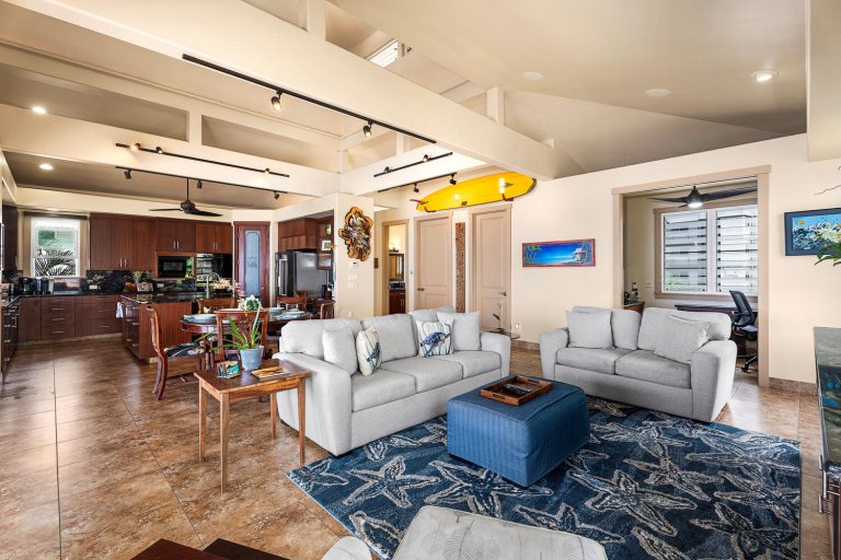 Occupying the top level of the home, the great room is designed to maximize ocean views and natural light. Vaulted ceilings, curated local artwork, and expansive pocket doors open fully to the main lanai, creating a seamless indoor-outdoor living experience. Plush seating invites conversation or movie nights, while the dining area is perfectly positioned for meals framed by endless blue water and passing dolphins.Chef-Ready Kitchen