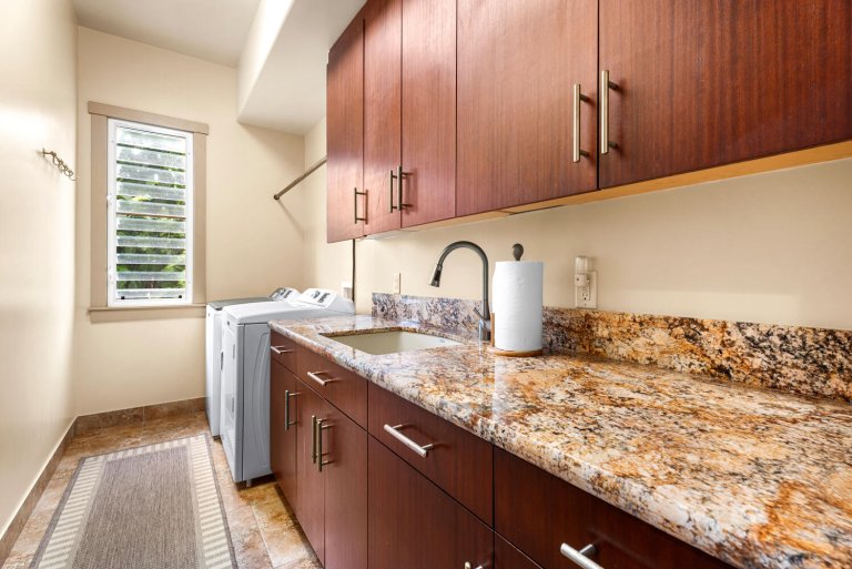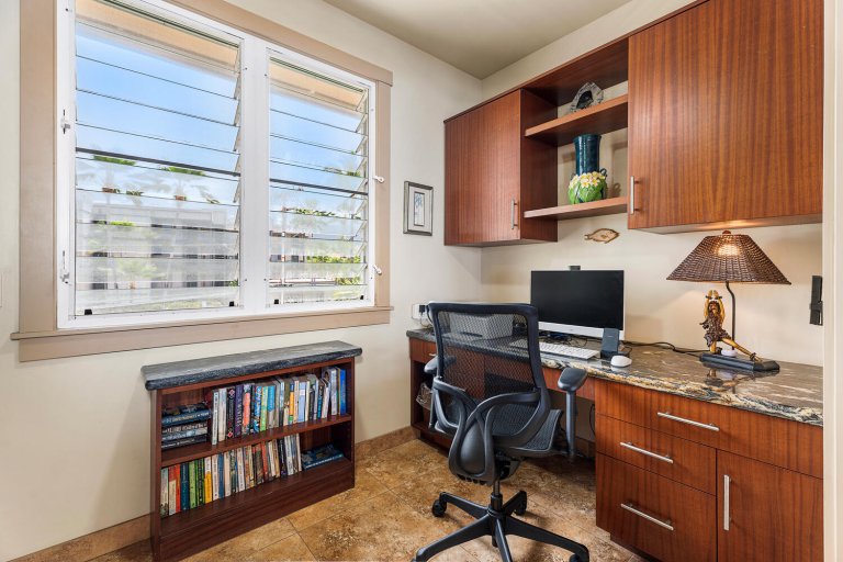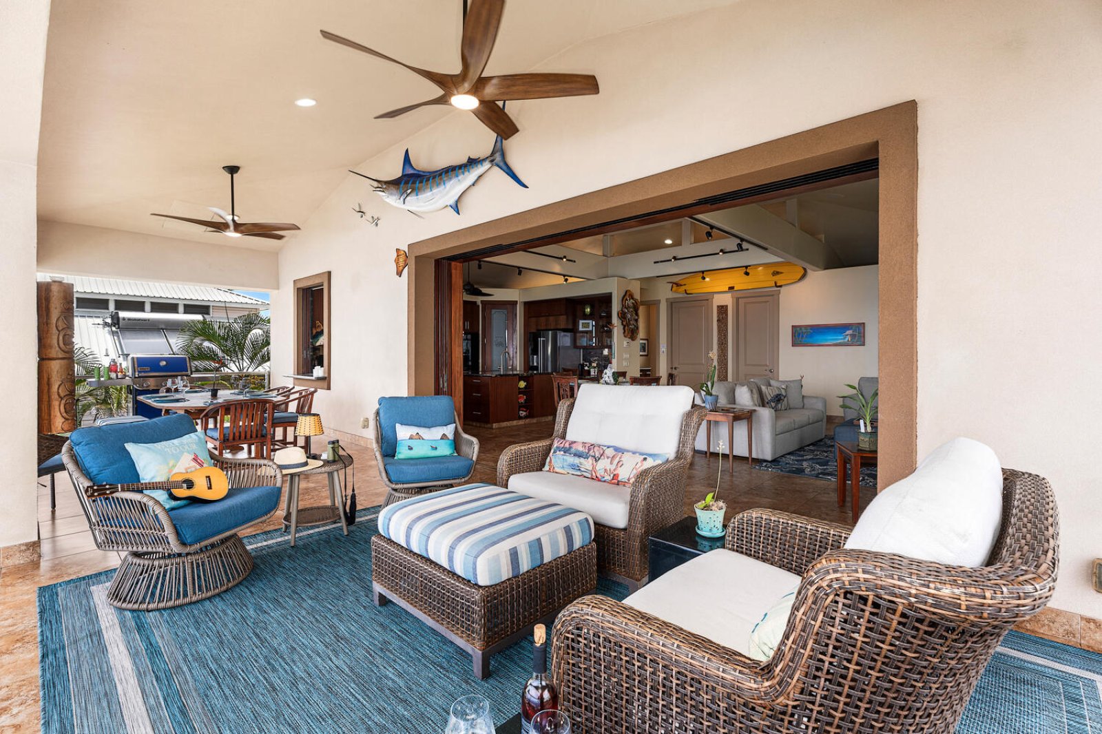 The open-concept kitchen is well suited for everything from casual breakfasts to sunset dinners. Features include granite countertops, a five-burner cooktop, dual ovens, wine refrigerator, and a convenient pass-through window to the lanai. Whether preparing fresh island seafood or brewing morning Kona coffee, the space is both functional and welcoming.Resort-Style Outdoor Living