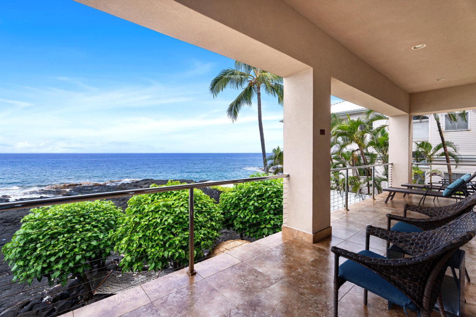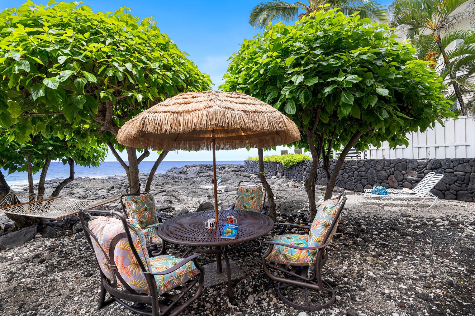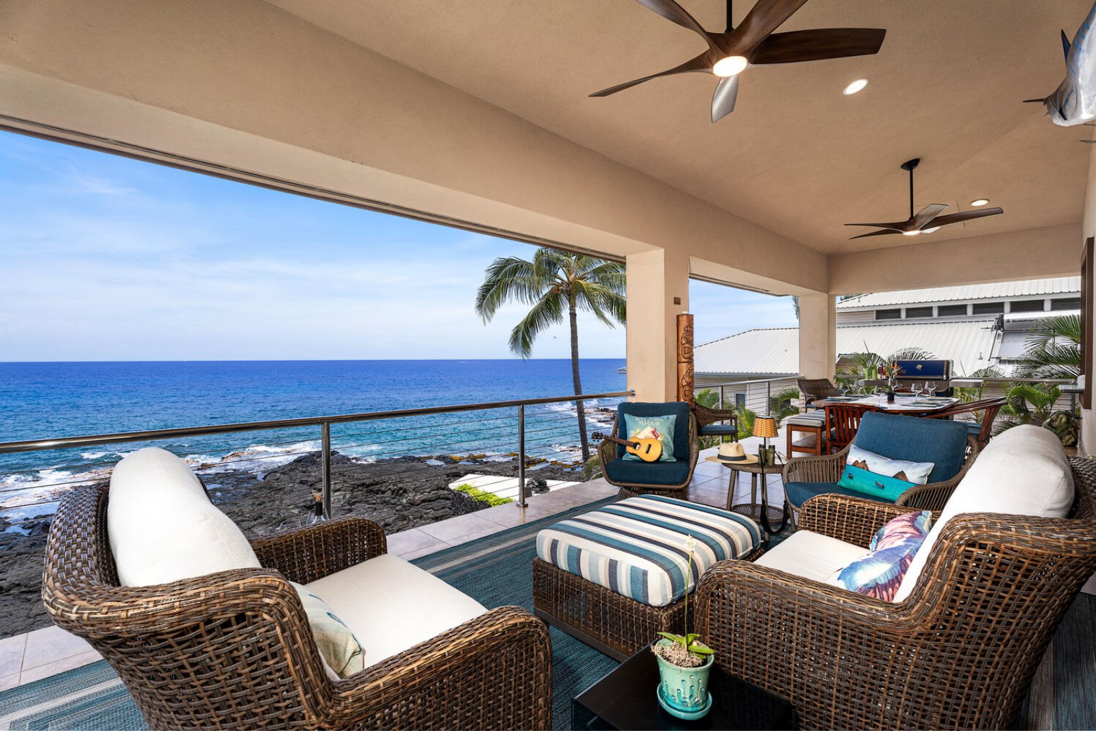 Outdoor living is the heart of Kailani Vista. Two expansive oceanfront lanais appear to float above the Pacific, ideal for whale watching, al fresco dining, or simply unwinding with the sound of the waves below. The upper lanai offers ceiling fans, lounge seating, and a Weber gas grill, while the lower lanai provides a more intimate perch above the shoreline.At ground level, a private lava-rock terrace leads directly to tide pools and the dramatic Kona coast. After a day of exploration, relax in the brand-new oceanfront hot tub and watch the sun set into the sea. Additional outdoor features include a backyard putting green and an open-air shower.