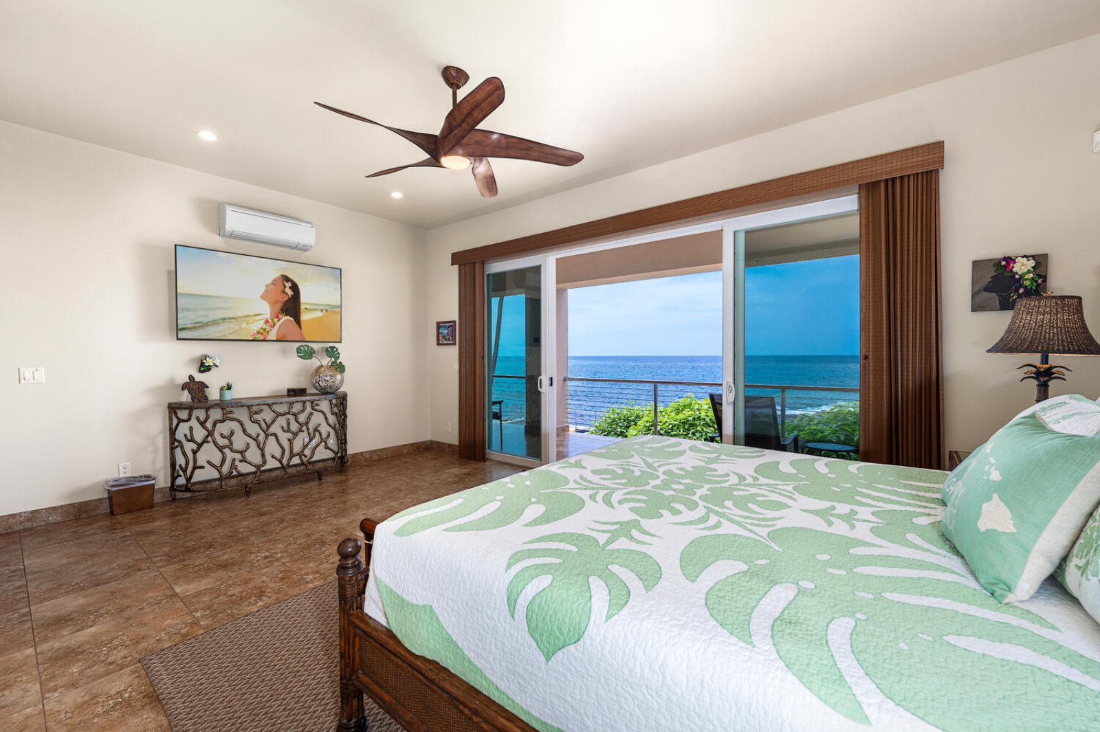 All bedrooms feature quiet split air conditioning, ceiling fans, premium linens, and a calming island aesthetic.