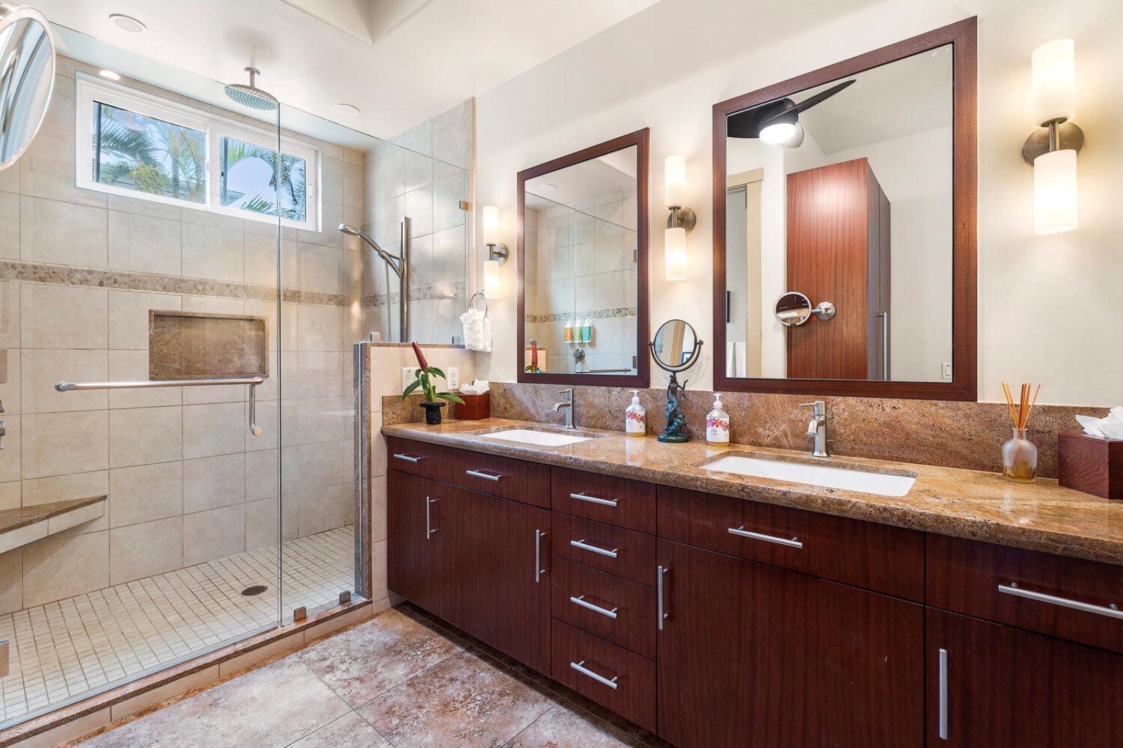 Kailani Vista comfortably accommodates families or couples traveling together, with thoughtfully appointed bedrooms designed for rest and privacy.• Primary Suite - King bed, en-suite bathroom with dual shower heads, and direct access to an ocean-view lanai.