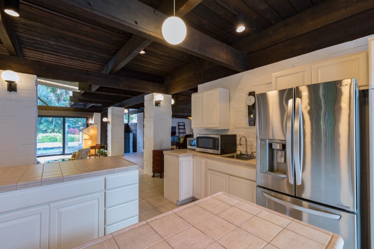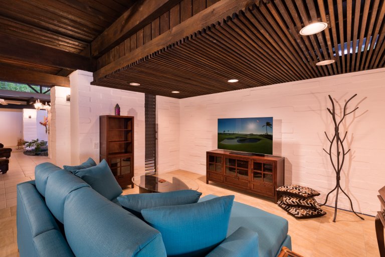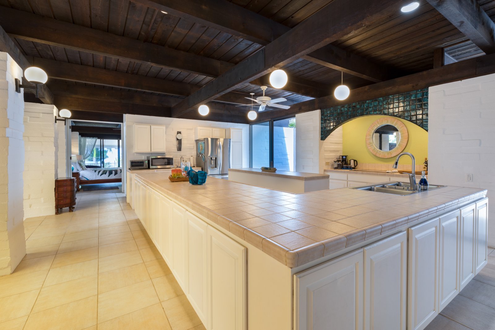 The expansive living room is bright and inviting, designed for connection and downtime alike. Open sightlines and generous seating encourage gathering, while large openings allow fresh air and garden views to fill the space. The indoor dining area flows naturally from the living room, providing a comfortable setting for shared meals and conversation in an airy, welcoming environment.Chef-Ready Kitchen