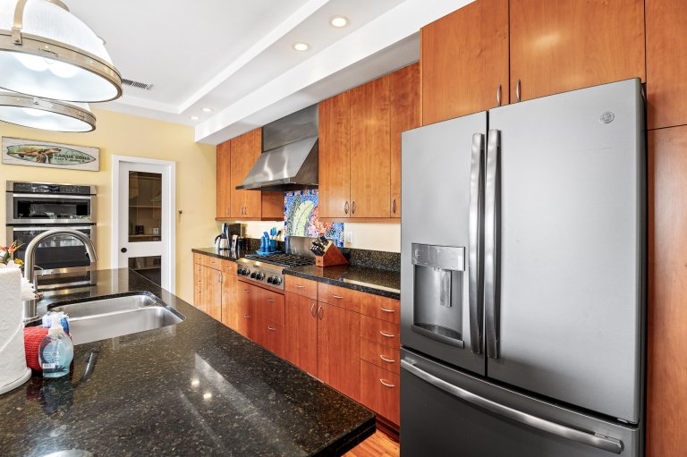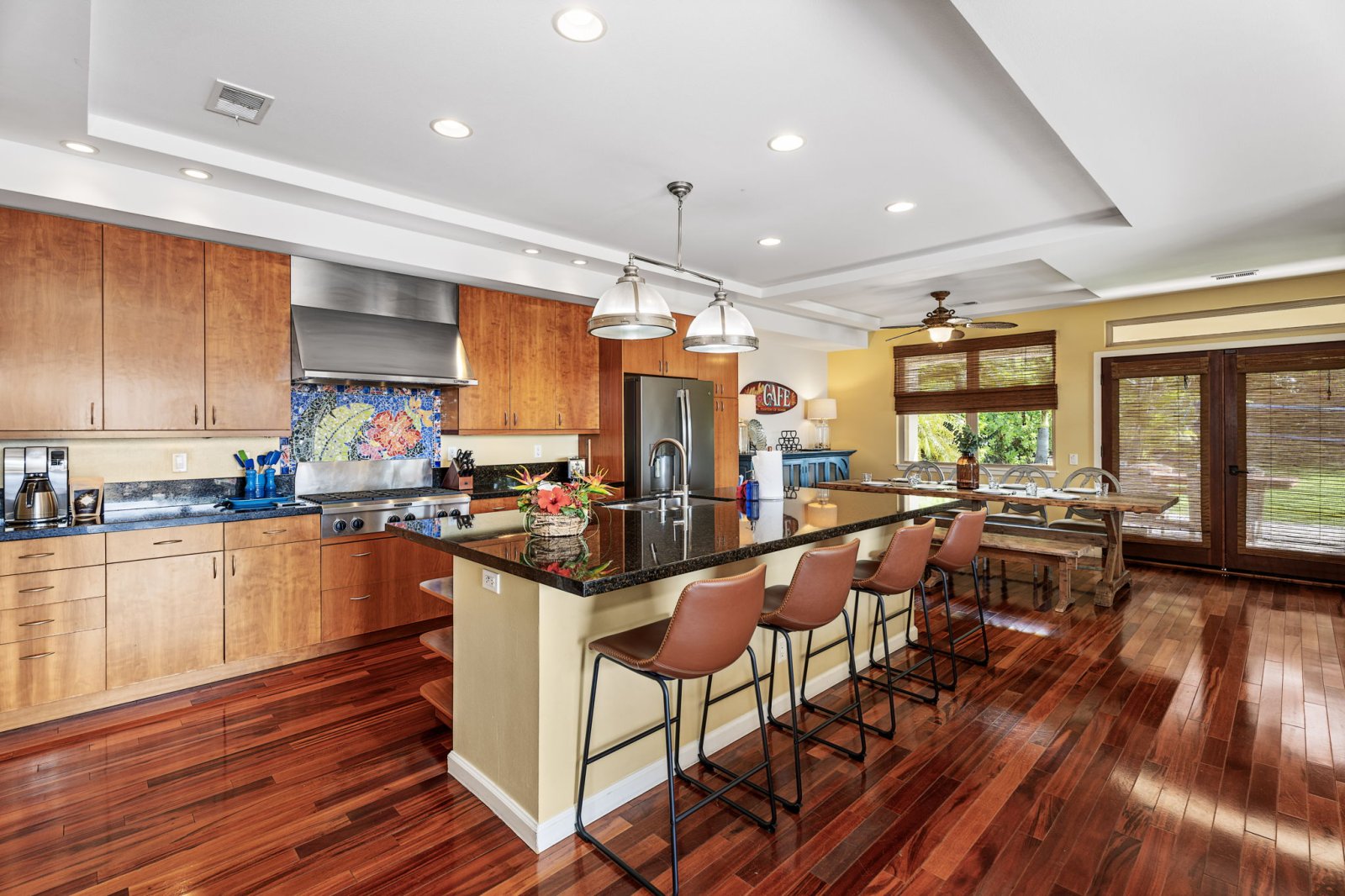 The open, chef-ready kitchen is anchored by a central island with bar seating, encouraging connection while meals are prepared. Rich wood cabinetry, granite countertops, and stainless steel appliances, including a gas range, provide both style and functionality. Abundant counter space makes it easy to prepare everything from casual breakfasts to elevated island-inspired cuisine.Outdoor Living