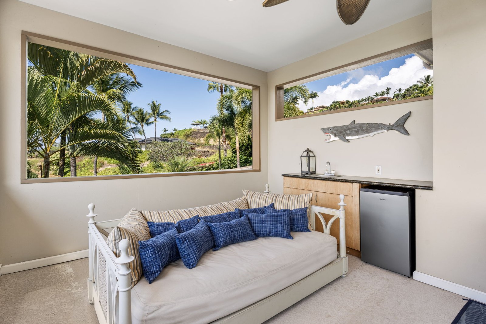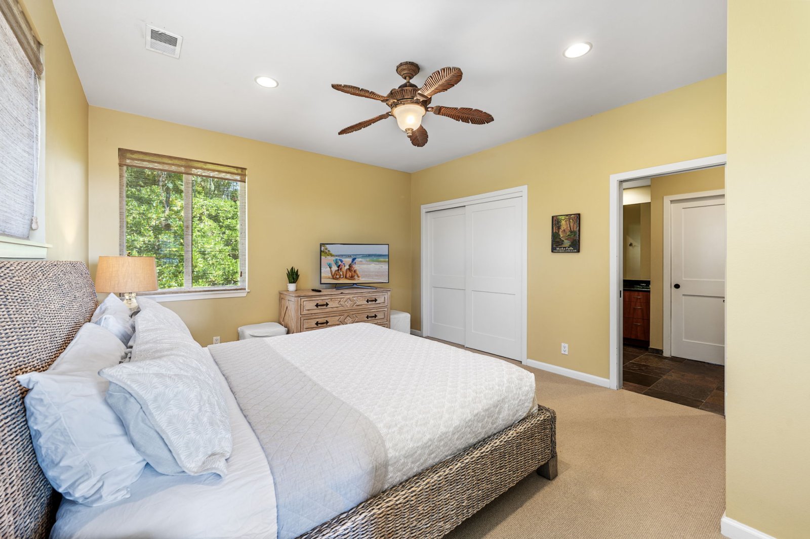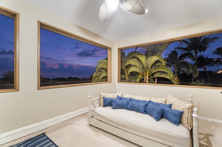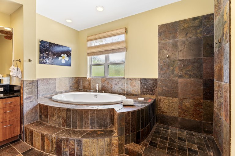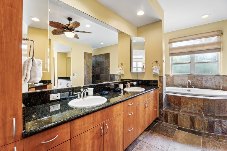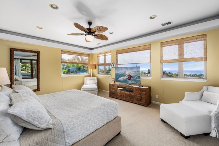 Papala Place features four well-appointed bedrooms, each designed for comfort and privacy.• Primary Suite - King bed, en-suite bathroom with soaking tub and walk-in shower, ocean-view balcony, central air conditioning, and ceiling fan.