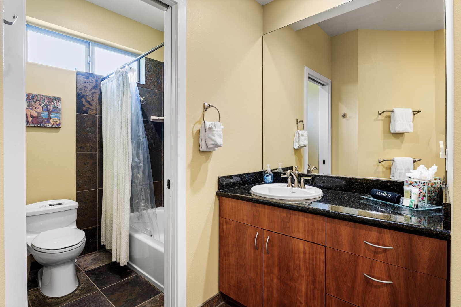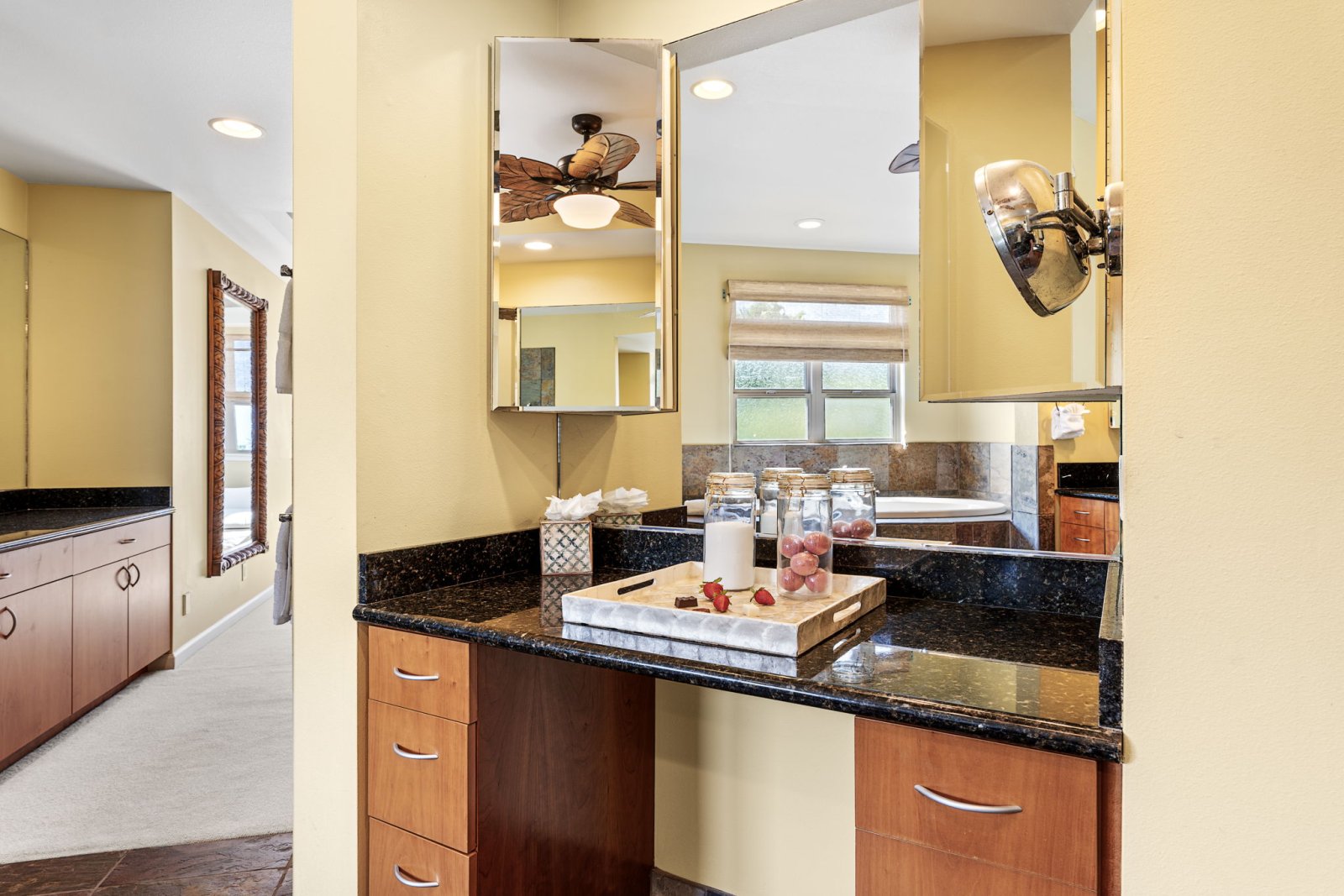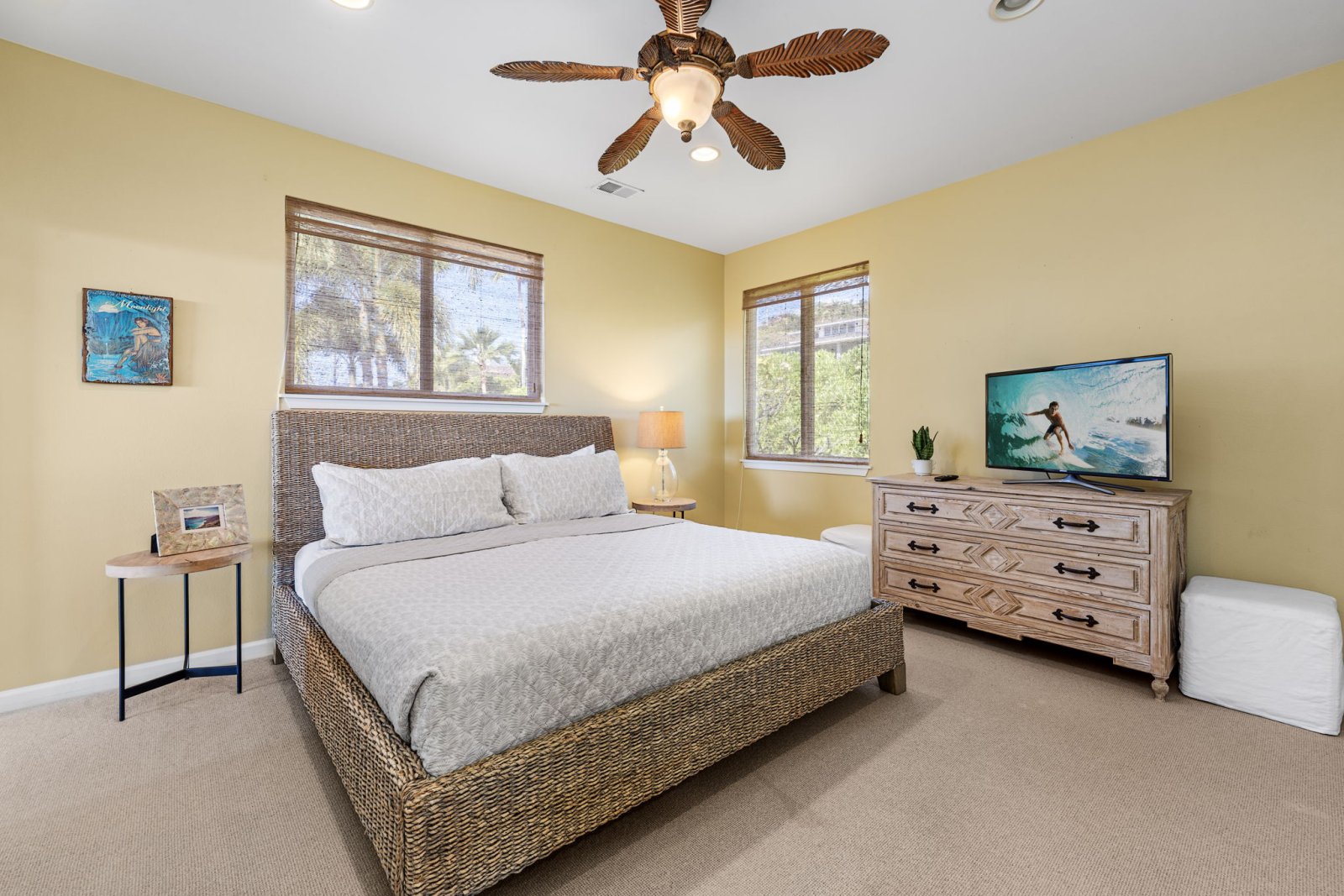 Papala Place features four well-appointed bedrooms, each designed for comfort and privacy.• Primary Suite - King bed, en-suite bathroom with soaking tub and walk-in shower, ocean-view balcony, central air conditioning, and ceiling fan.