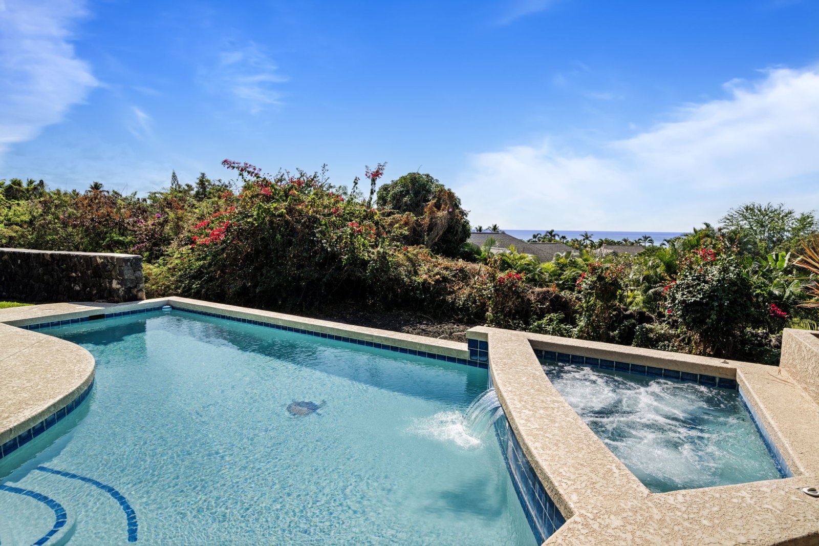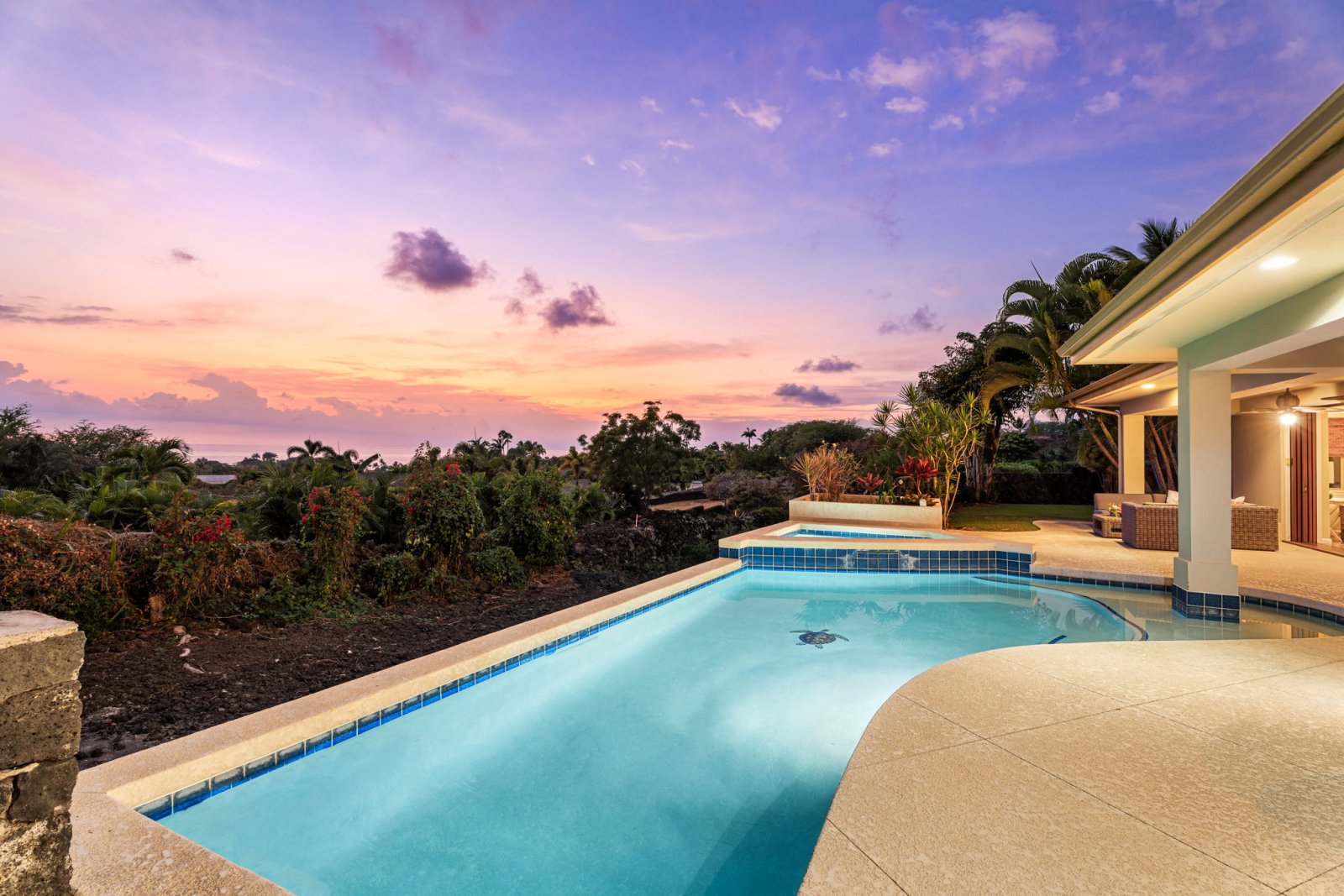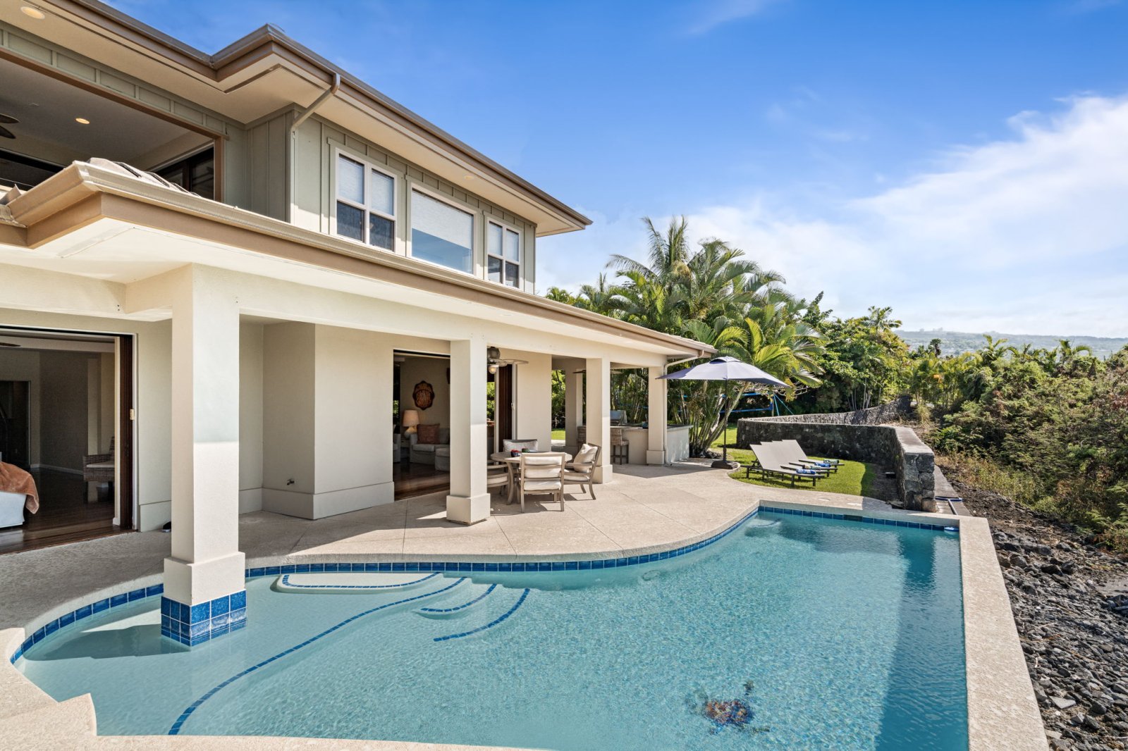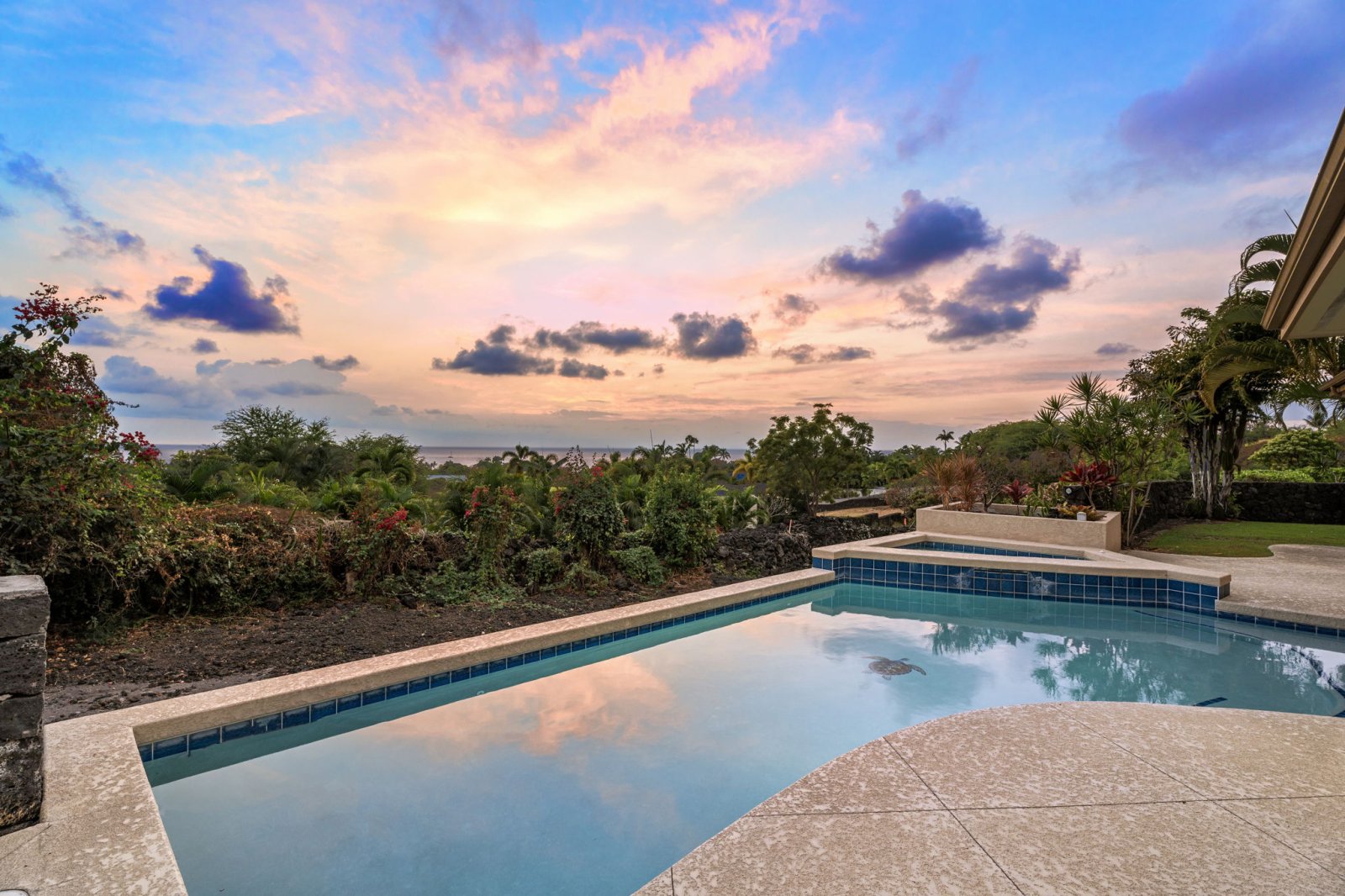 The backyard is designed as a private oasis, surrounded by tropical landscaping and manicured lawns.- Sparkling swimming pool with raised spa