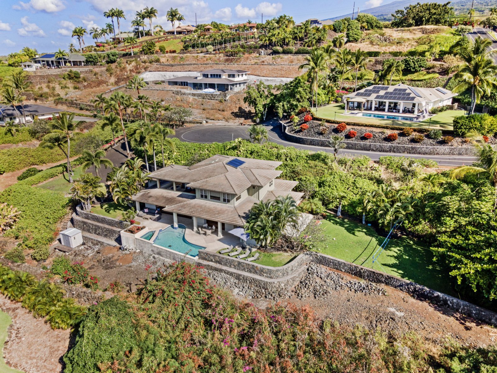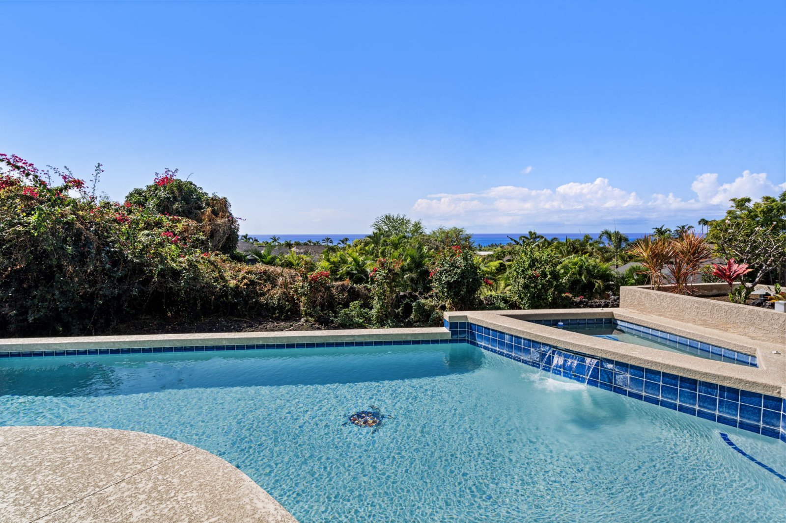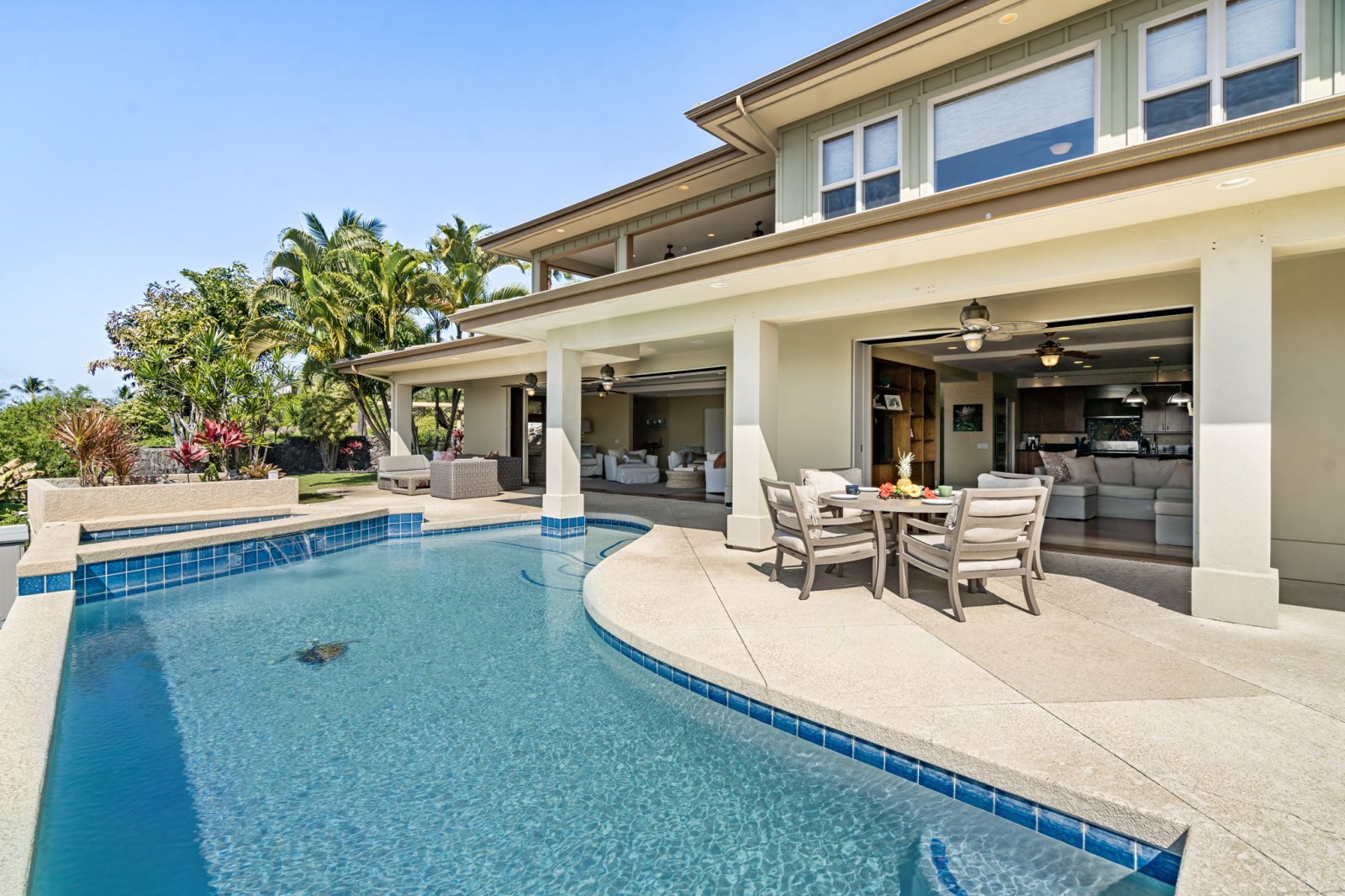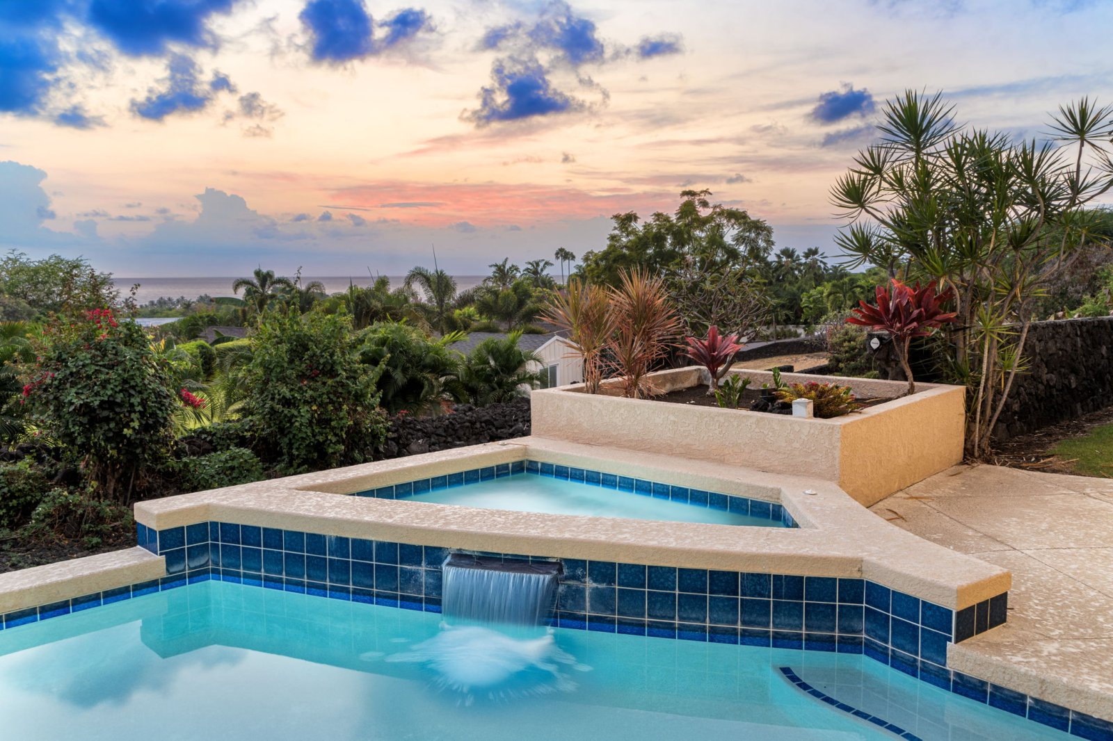 The backyard is designed as a private oasis, surrounded by tropical landscaping and manicured lawns.- Sparkling swimming pool with raised spa