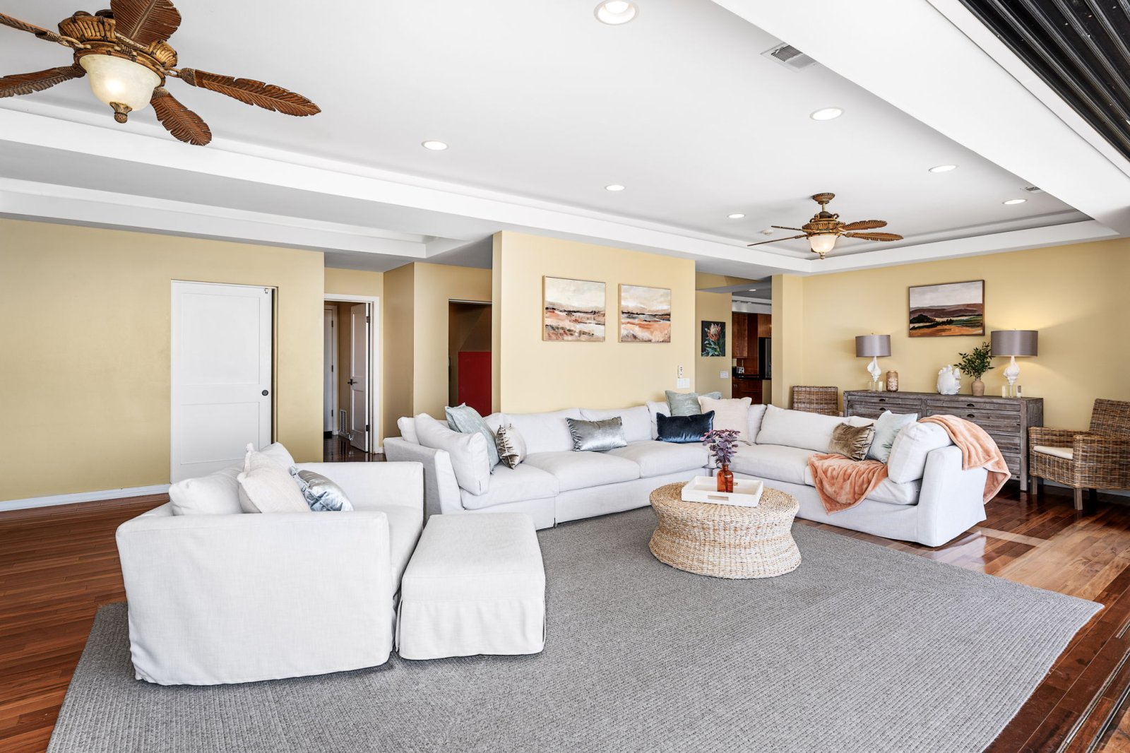A gated entry leads into bright, airy interiors defined by high ceilings, warm island tones, and coastal-inspired finishes. Multiple seating areas create an easy flow toward the outdoors, with large windows and sliding doors opening to the pool terrace and garden. The main living room features plush sectional seating, ceiling fans, and a smart television, making it an inviting space for evening relaxation or shared moments after a day at the beach. The adjacent dining area comfortably seats eight at a rustic-style table, perfectly suited for family meals and celebratory dinners.Kitchen & Dining
