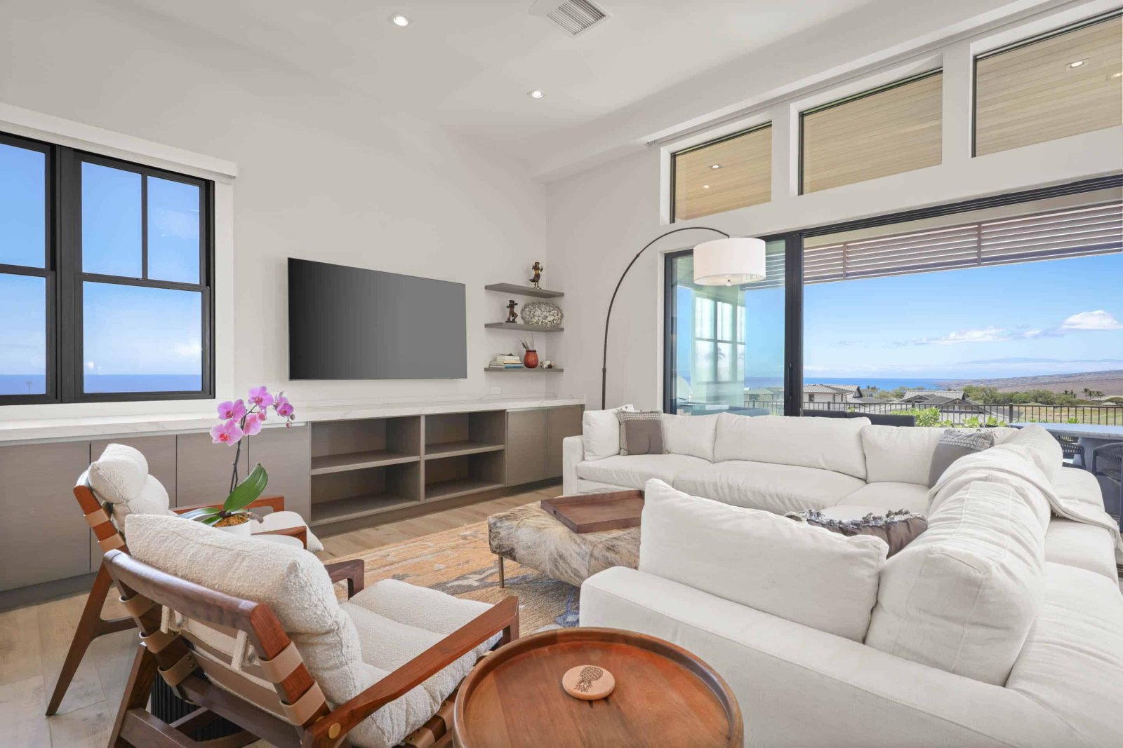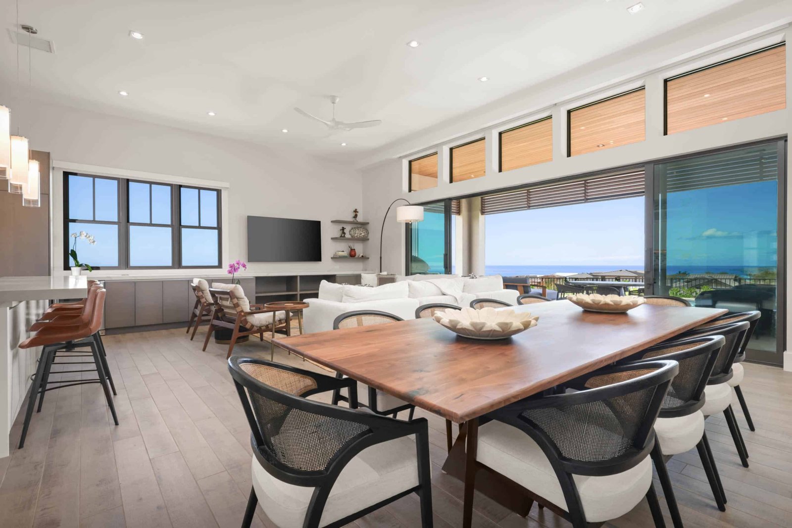 The Amaui Villas 11's great room combines style and function with an open-concept design flowing easily outside to the outdoor lanai.The living room is tastefully appointed with plush sofas, seating nooks, and a large flat-screen TV, creating the ultimate center for relaxation following a day full of island adventure. Sliding doors allow fresh sea winds and undistracted views of the Pacific.