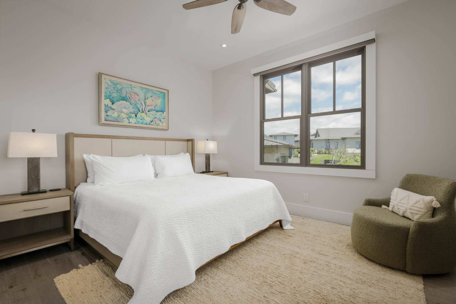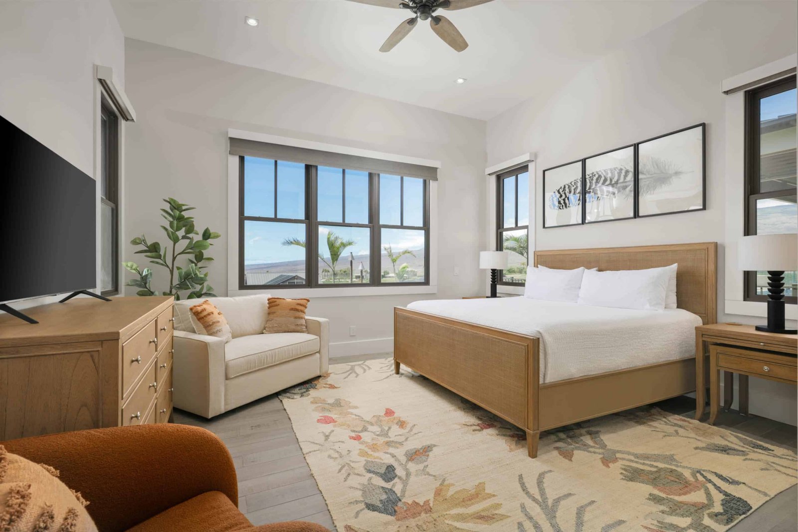 Amaui Villas 11 presents three elegantly designed suites, each purposely crafted for luxury, discretion, and peace.- Primary Suite: King-size bed, sleeper chair for additional visitors, flat-screen TV, and walk-in closet make up this oceanfront haven. The spa-inspired en-suite bathroom features a soaking tub, two vanities, a walk-in shower, and an outdoor shower for the ultimate tropical bathing experience.