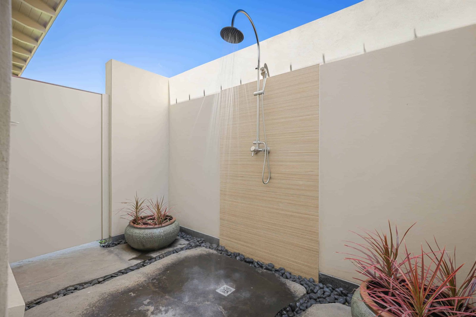 Rinse off from a swim in the pool or a day at the beach at the outdoor shower.