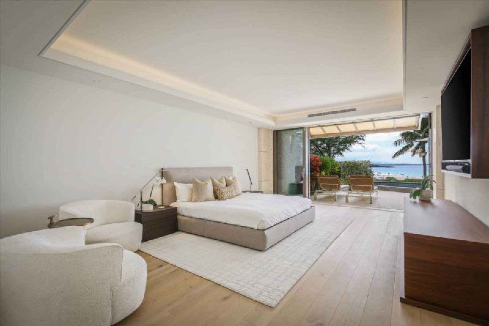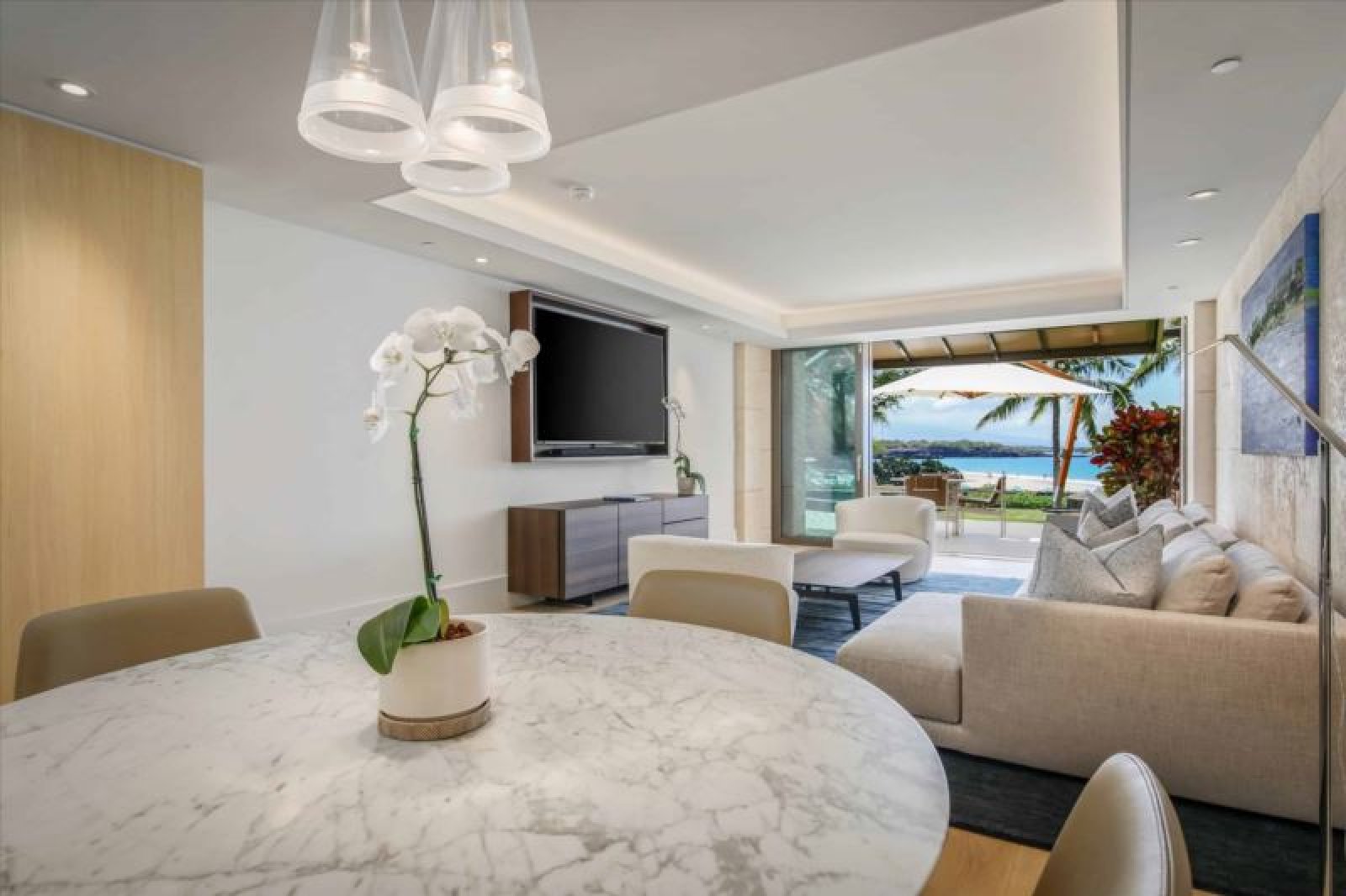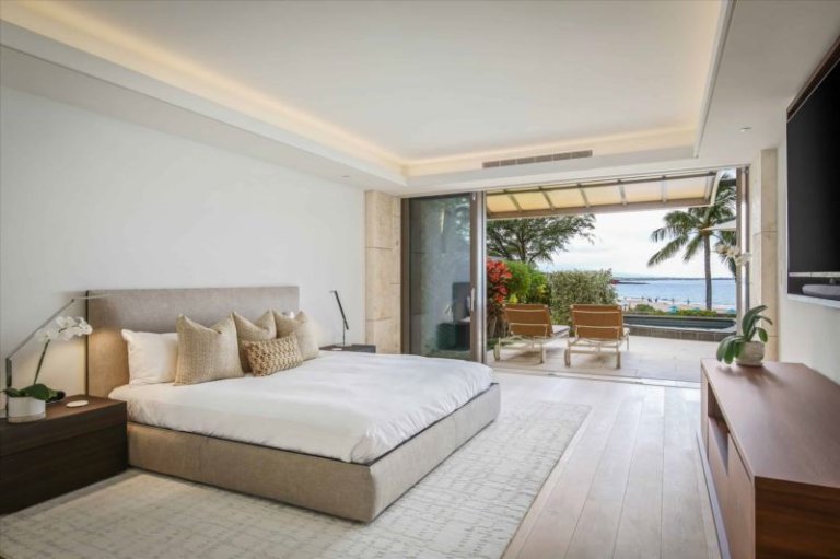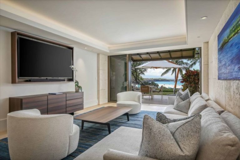 This ultra-refined, oceanfront, newly-constructed, island masterpiece offers floor-to-ceiling sliding window walls for indoor/outdoor living, a sleek, luxe chef’s kitchen outfitted with Wolf and Sub-Zero appliances, double ovens, wine storage, hand-crafted cabinetry and a dining table for four. Additional features include a master suite with a king size bed and magnificent, attached bathroom, a guest bedroom with a queen size bed, a bonus room with a daybed, air conditioning, custom lighting and washer/dryer. This residence is steps from the Hapuna Golf Course Clubhouse.