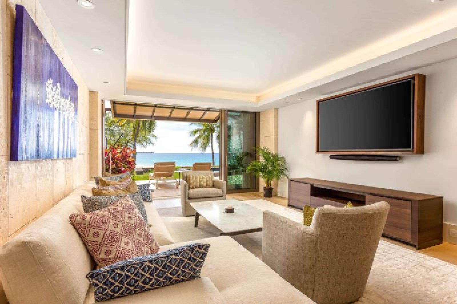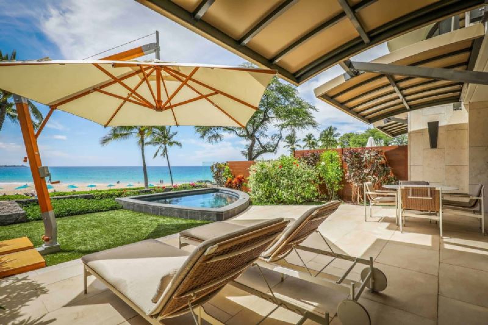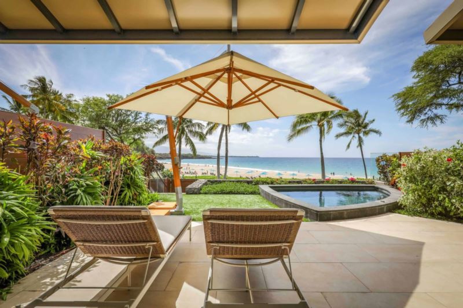 This unrivalled, oceanfront, newly-constructed, ground level masterpiece offers floor-to-ceiling sliding window walls that create indoor/outdoor living space, a magnificent chef’s kitchen outfitted with professional-grade Wolf, Sub-Zero and Miele appliances, wine storage and hand-crafted cabinetry. Additional features include two guest suites, one with a king bed and the other with a queen, each with an inviting, retreat-like bath, a bonus room, Asko washer/dryer, air conditioning, a private plunge pool, an expansive, furnished lanai and garden. This residence is steps from the beach and a 5 minute walk from the Hapuna Golf Course Clubhouse.