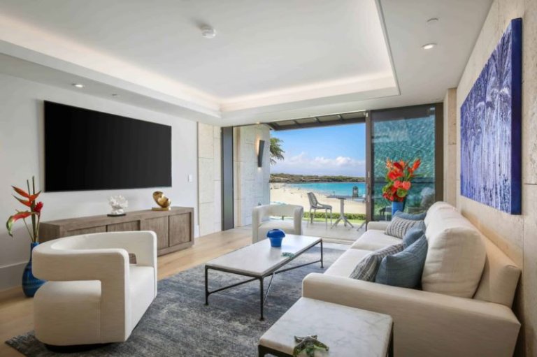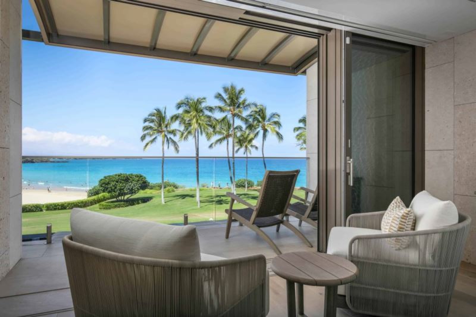 Enjoy unobstructed beachfront views in this modern, luxurious two-bedroom unit decorated with Restoration Hardware furniture throughout. Overlooking the white sandy beach, the living and master bedrooms feature floor-to-ceiling sliding glass walls that open to create an indoor-outdoor living space that includes a furnished lanai with dining for four and a lounging area for two. Guests of B25 also receive resort access to the Westin Hapuna Beach Hotel.